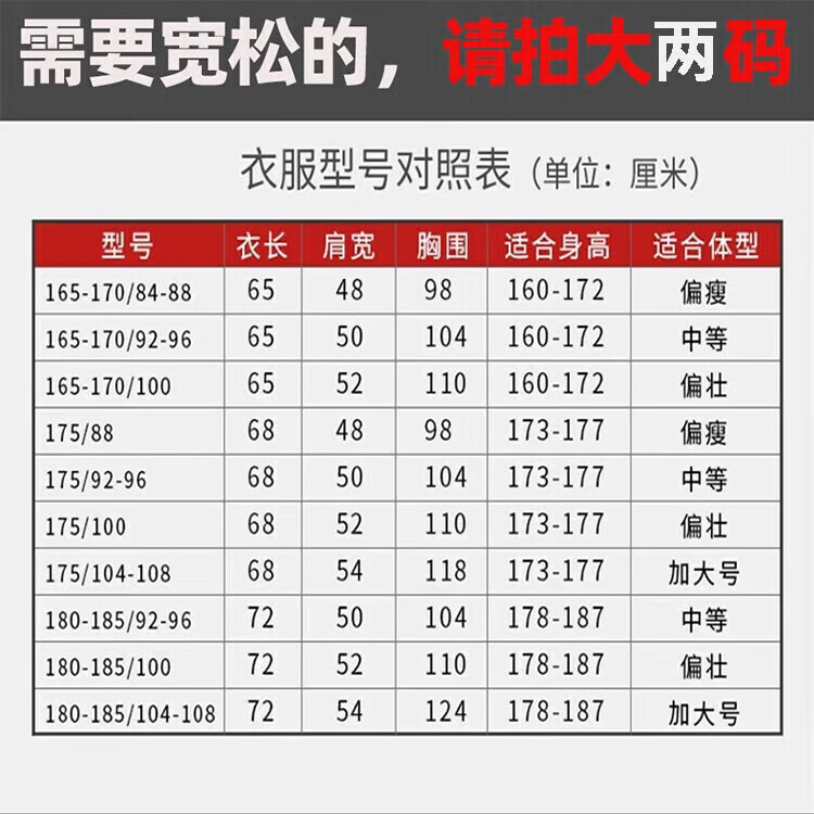 China (cm) 165 / 88-90 170 / 96-98 175 / 108-110 180 / 118-122 185 / 126-130