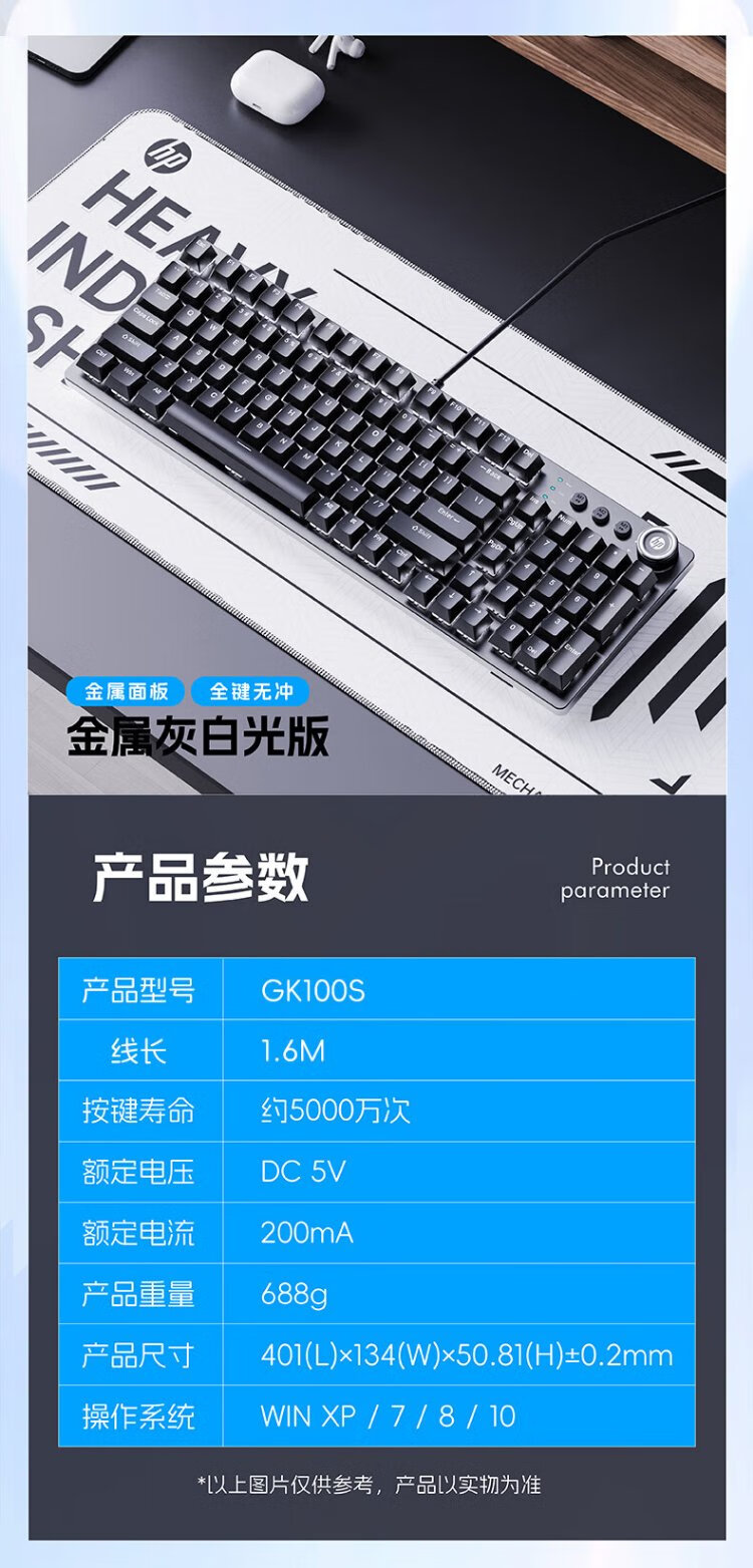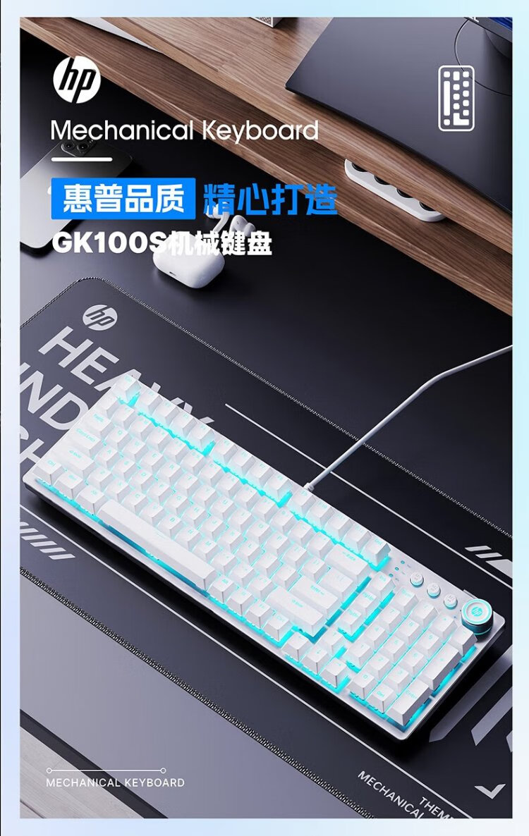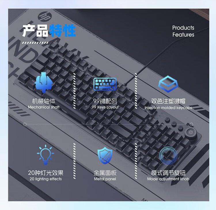 HP GK100s wired mechanical keyboard 99-key full-key hot-swappable ergonomic design League of Legends CrossFire dedicated e-sports gaming keyboard metallic gray keyboard and mouse set green axis