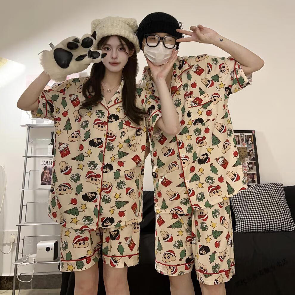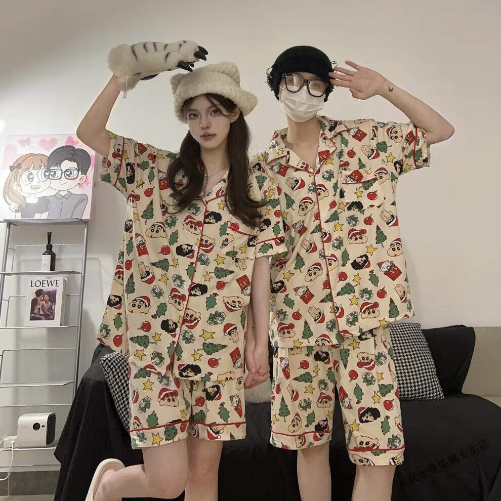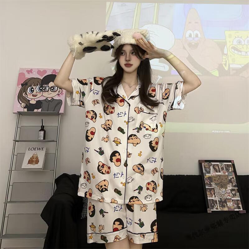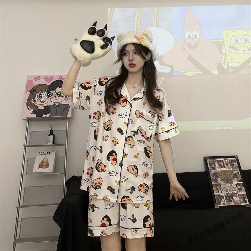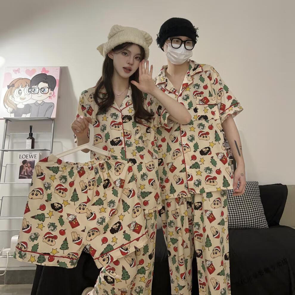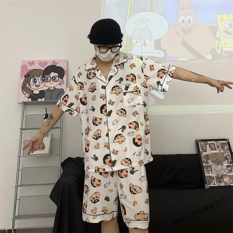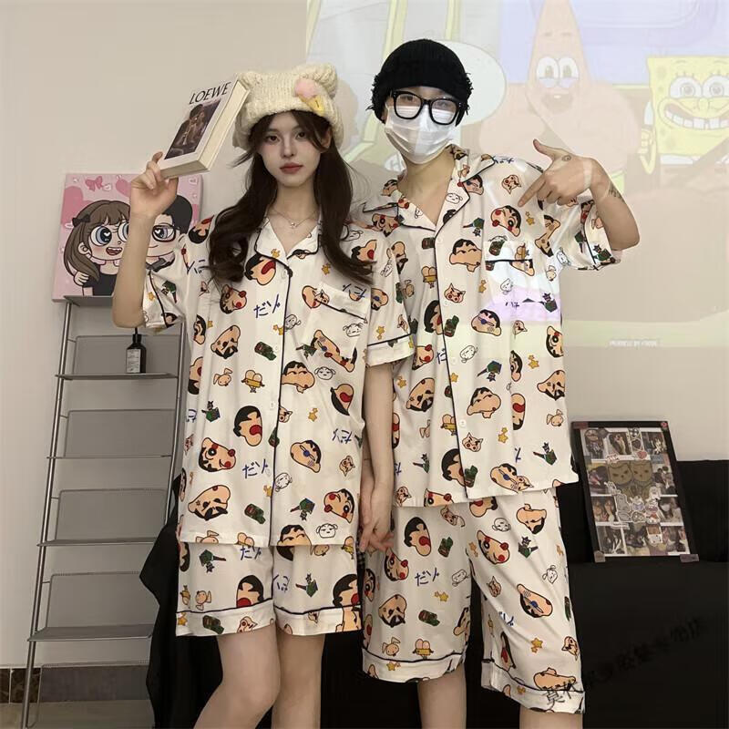 Modal Japanese cute Crayon Shin-chan couple pajamas for women summer pure cotton short-sleeved summer men's home wear three-piece suit White Crayon Shin-chan short sleeves + shorts + trousers Men's L size 90-120 Jin Jin equals 0.5 kg Wear