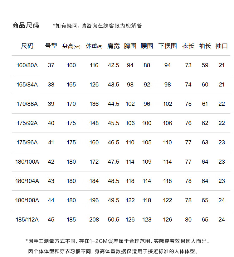 China (cm) 160-165/84-86 165-170 / 88-90 167-172 / 92-96 168-173 / 98-102 170-176 / 106-110