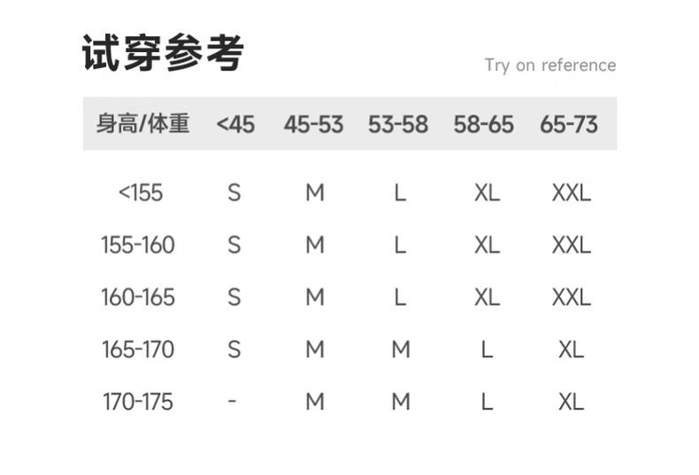 China (cm) 160-165/84-86 165-170 / 88-90 167-172 / 92-96 168-173 / 98-102 170-176 / 106-110