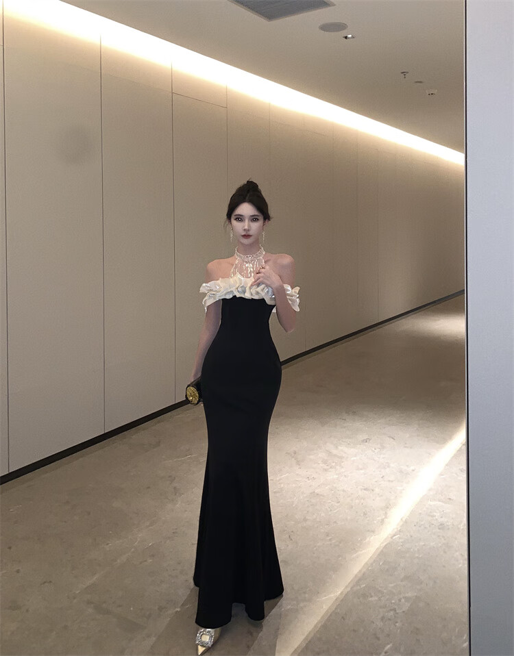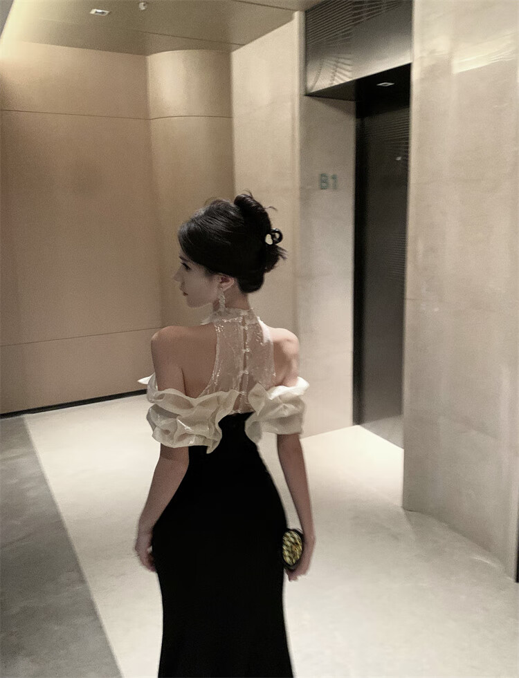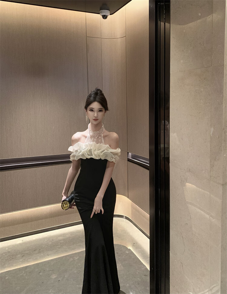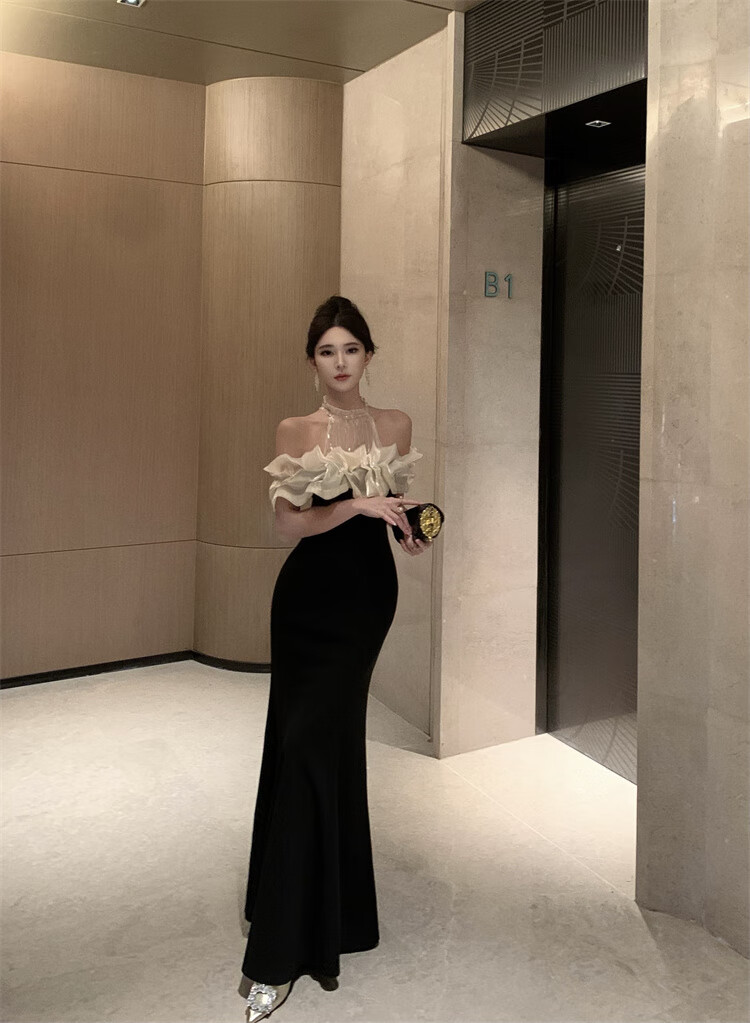 YIOU halter neckline slim fit Hepburn style dress women's floor-length bust pad banquet host dress 2379 black M