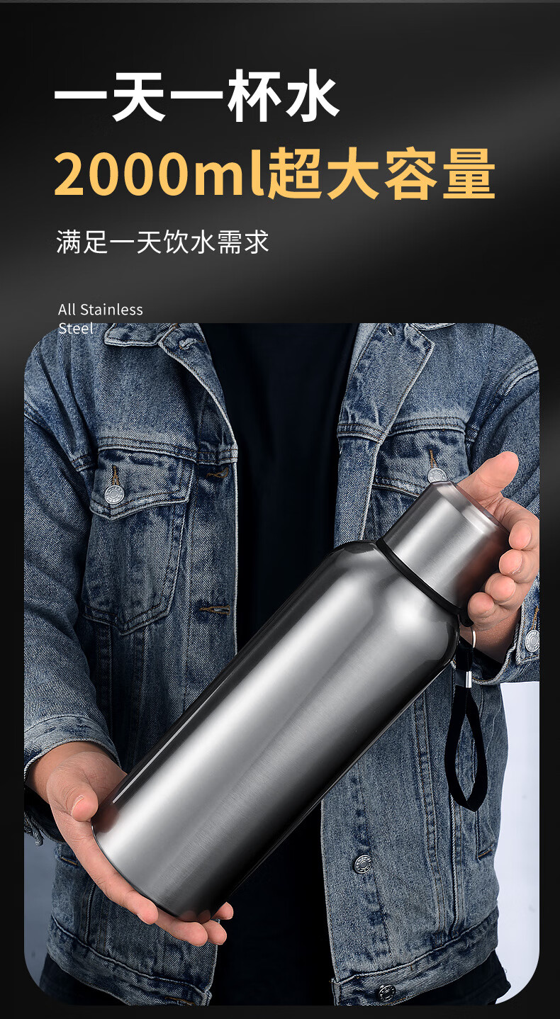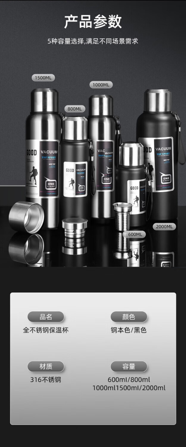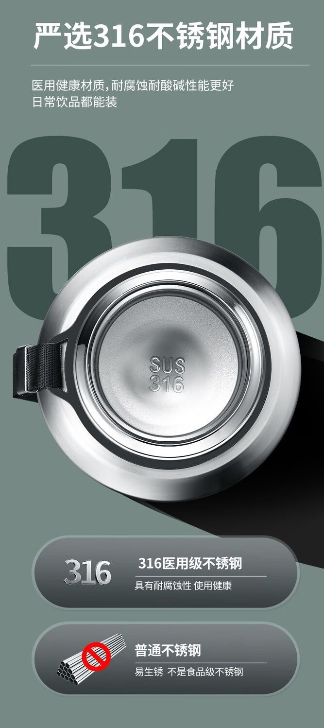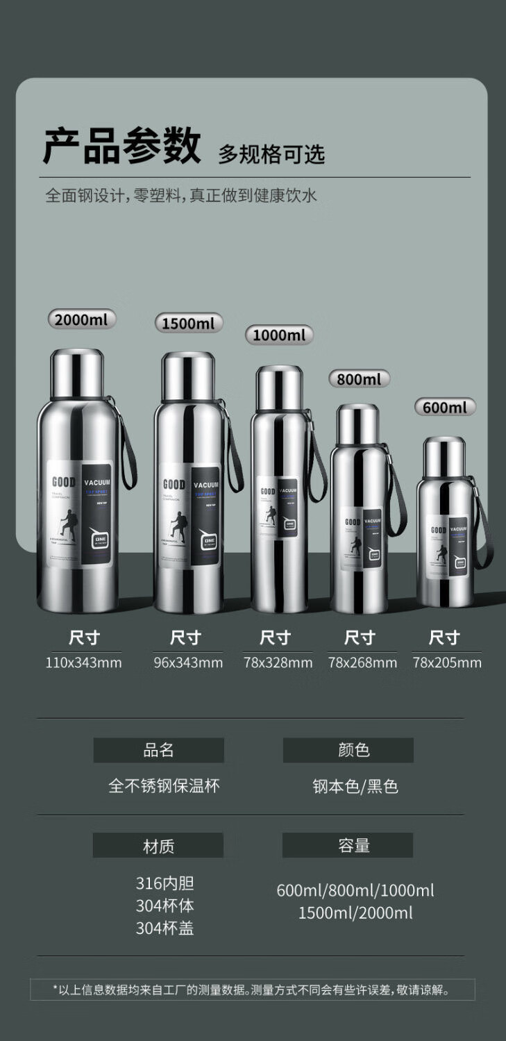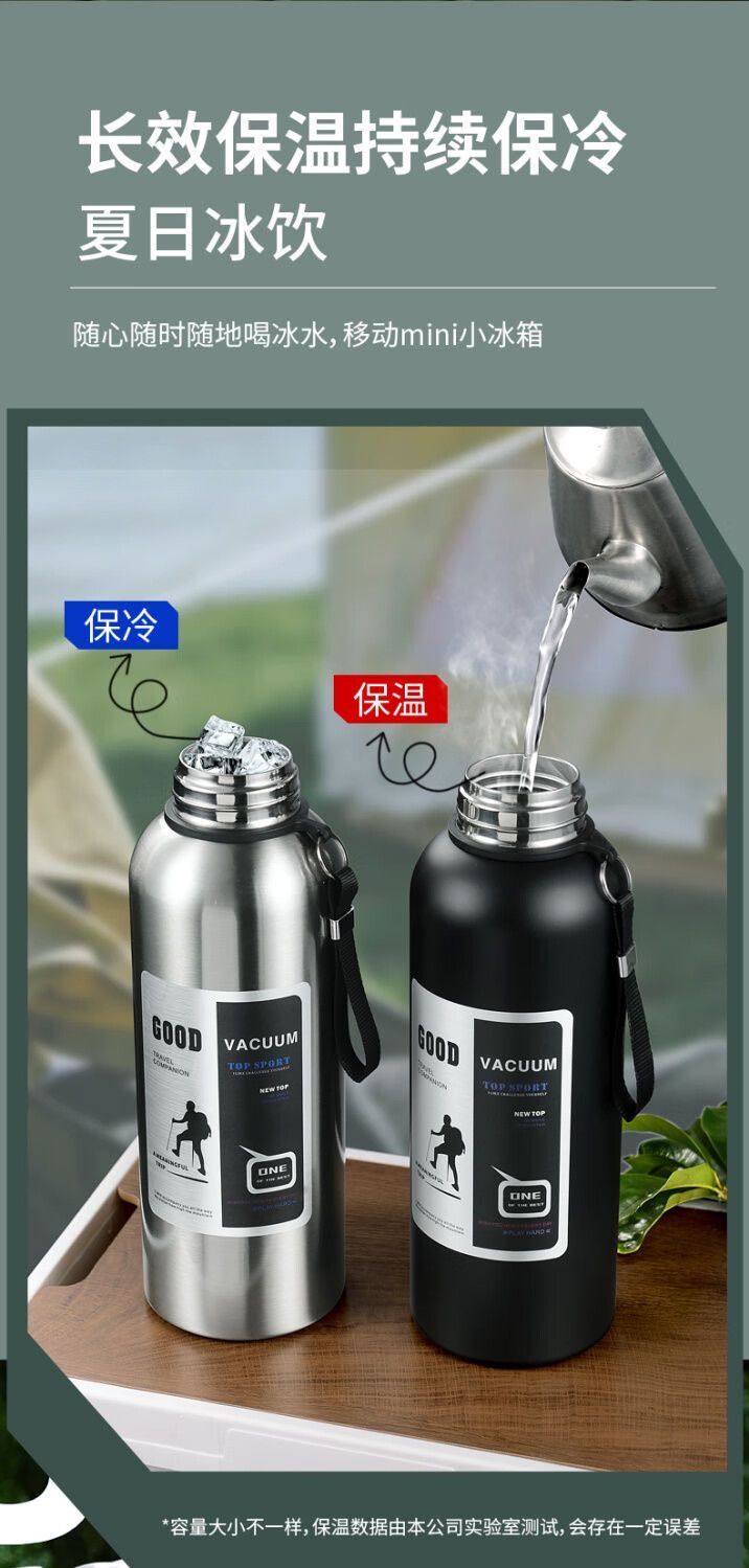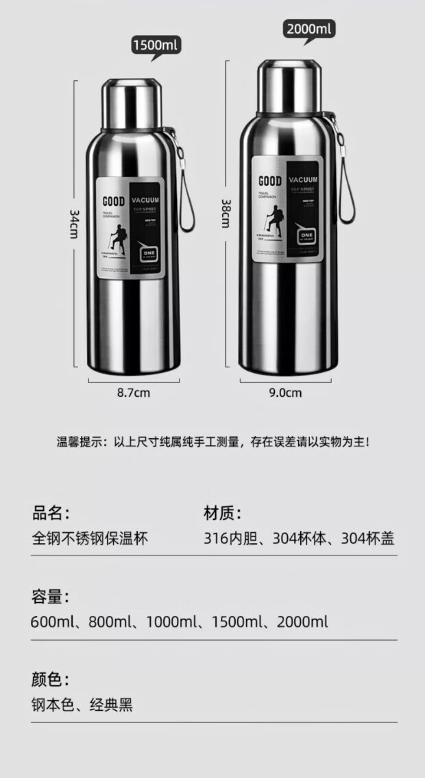 Sohe outdoor thermos cup 316 stainless steel thermos pot large capacity portable vacuum all-steel pot extra large all-steel thermos pot silver cup lid + inner plug + leakage net 2000.0ml