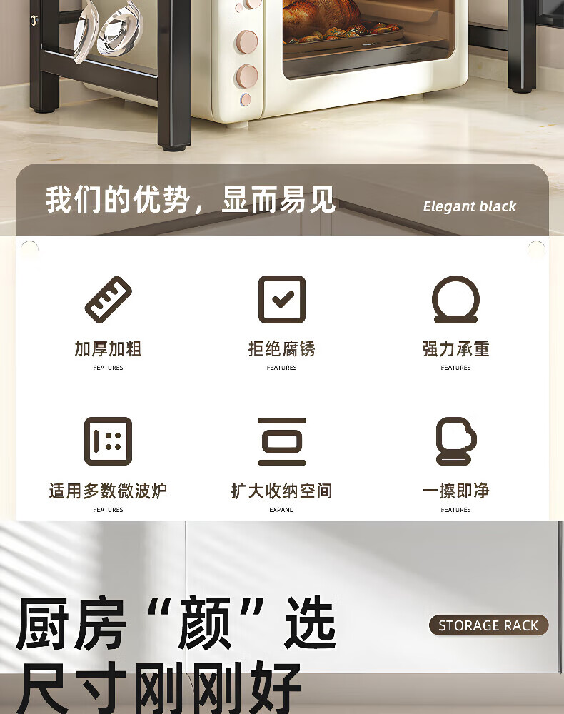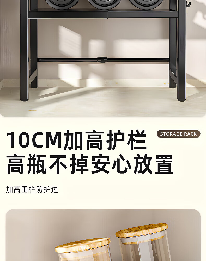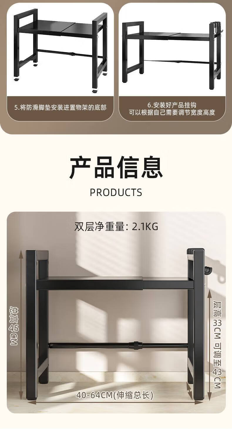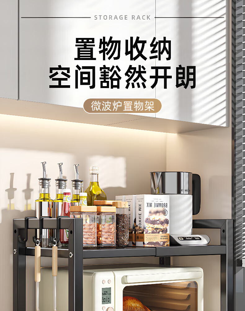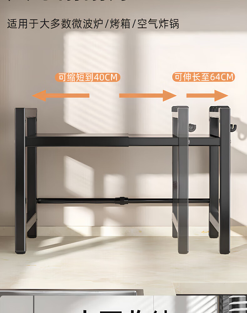 Centenary Zhenghe Kitchen Storage Rack Microwave Oven Rack Oven Stand Countertop Storage Rack Rice Cooker Multifunctional Home Storage Rack Black Single Layer Retractable + 6 Hooks
