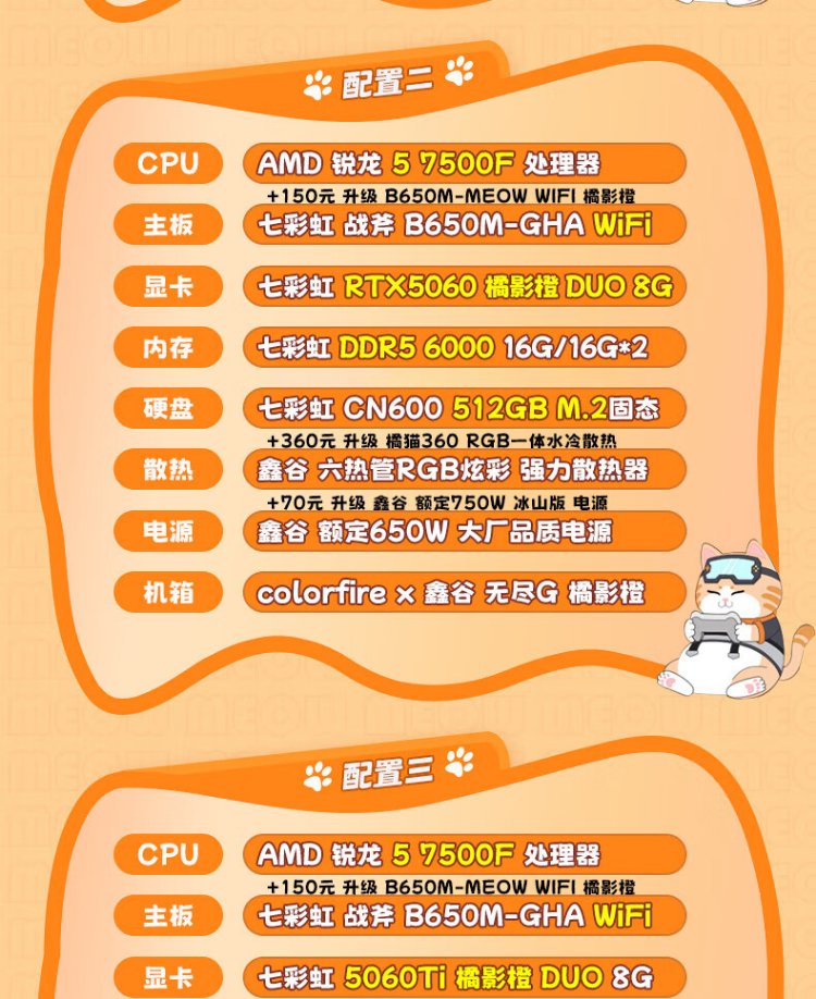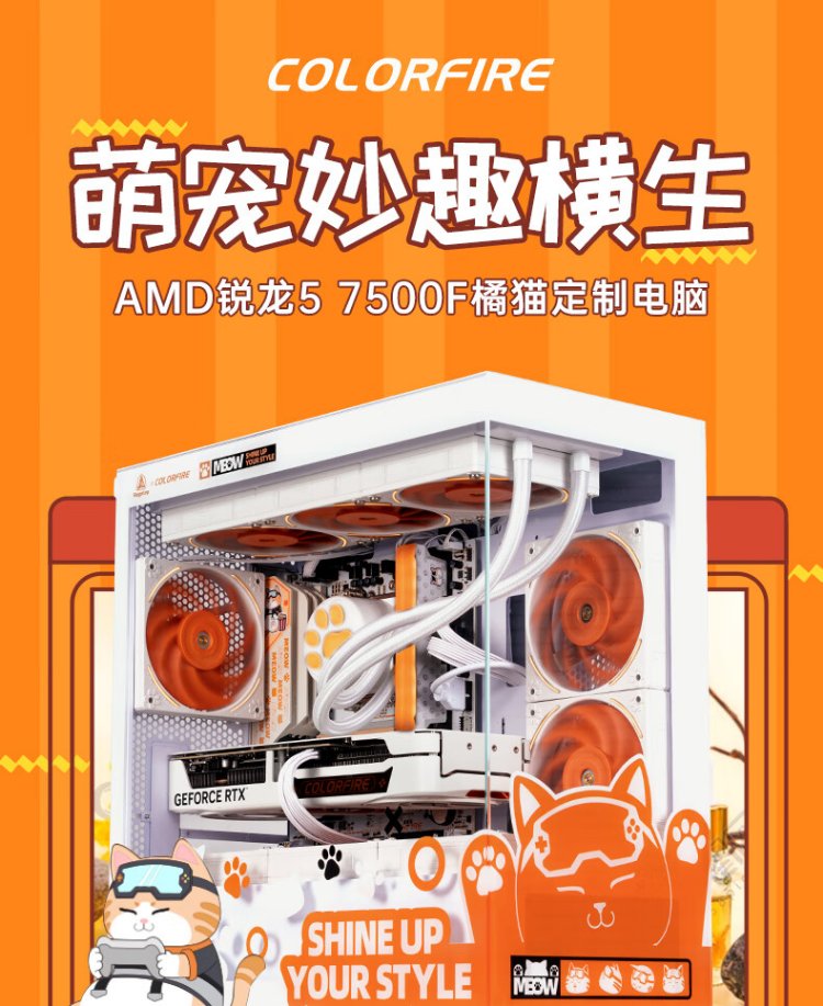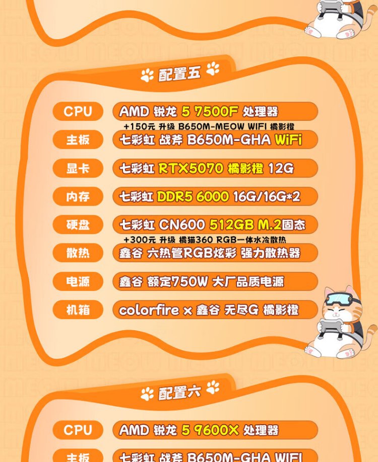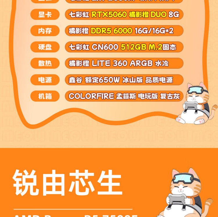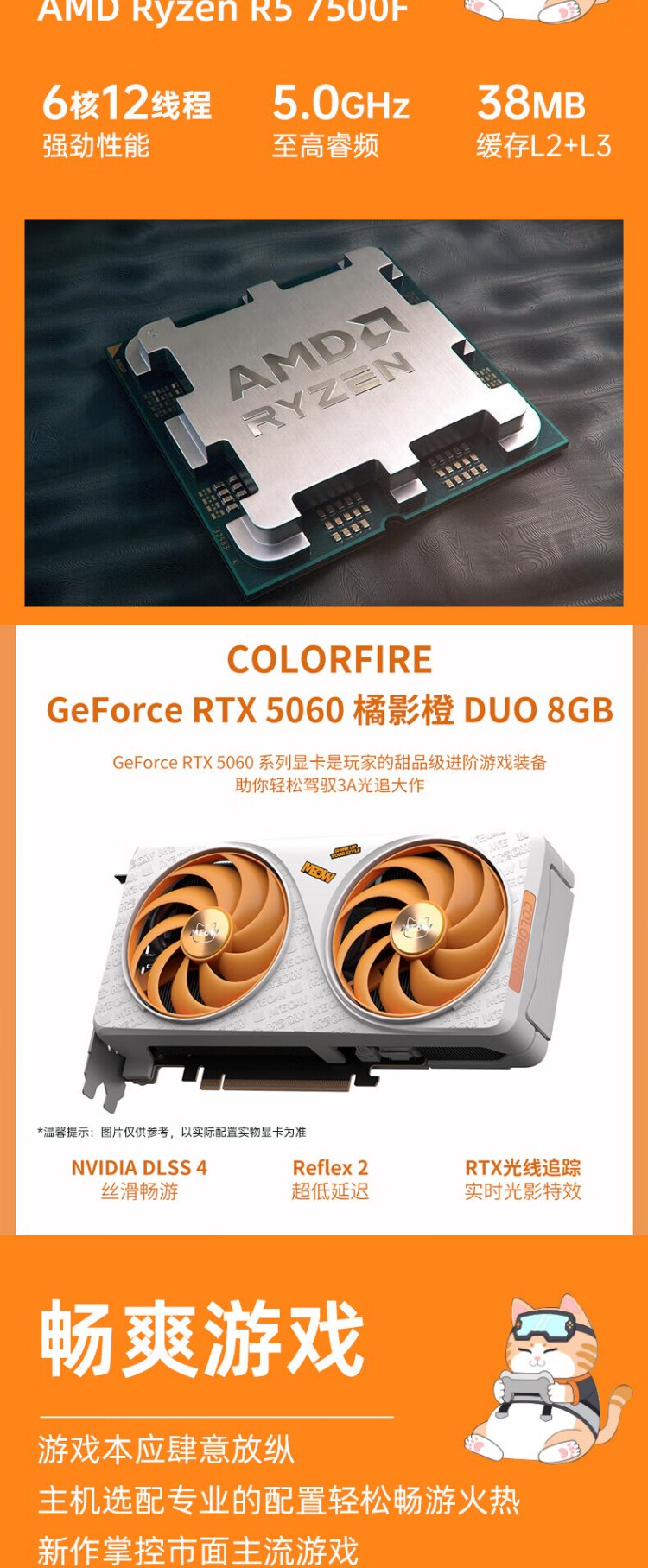 Colorful AMD Orange Cat DDR5 computer complete machine R5 7500F/RTX5060Ti RTX5070 4060Ti desktop gaming computer AI design DIY assembly host with two丨R5 7500F+D5+RTX5060 8G丨16GB D5 memory