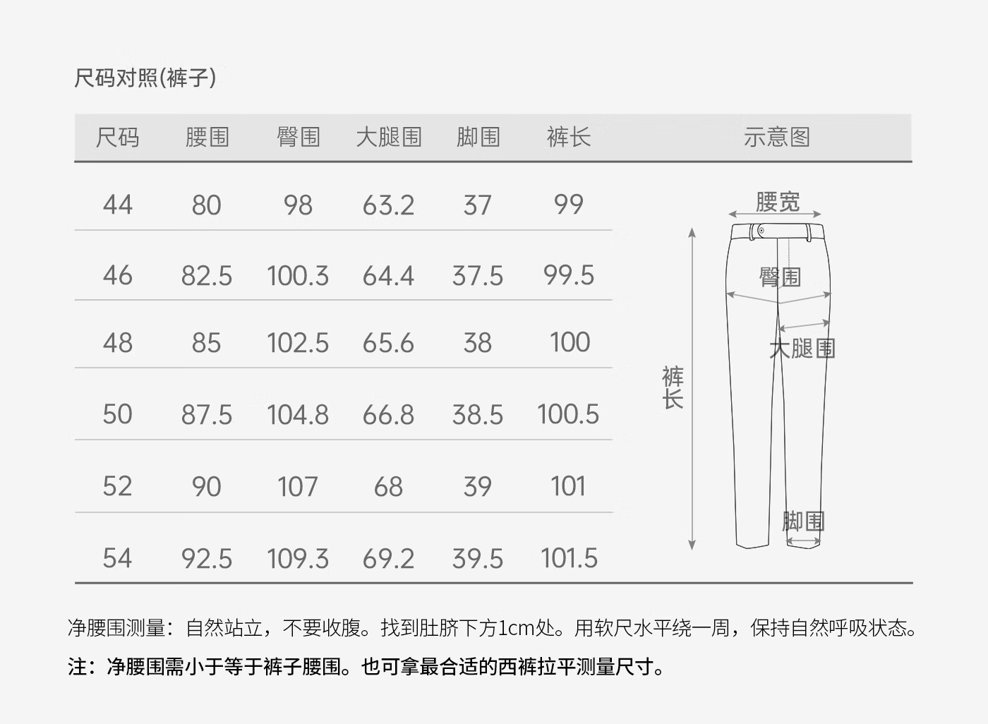 Outseam (cm) 99 cm 101.5 cm 104 cm 106.5 cm 109 cm