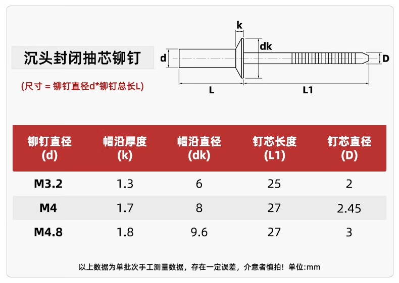 Tianzhuo Hardware countersunk head closed core blind rivet 304 stainless steel closed rivet closed waterproof shape M3.2M4M4.8mm 4.8*16 500 pieces in a box