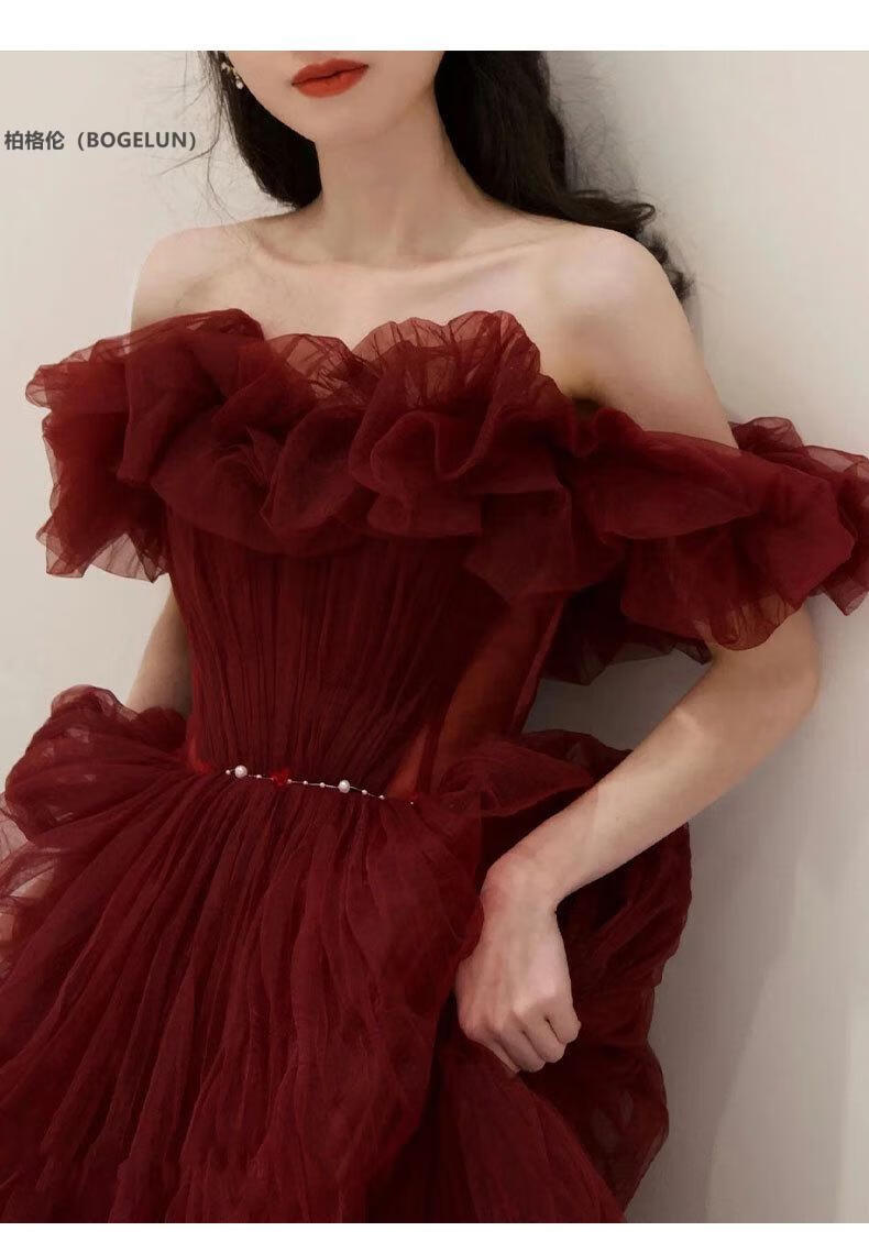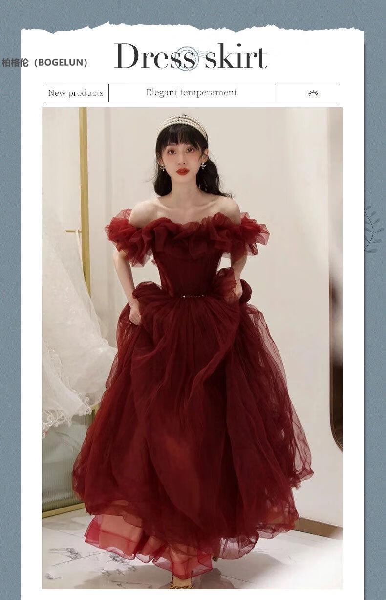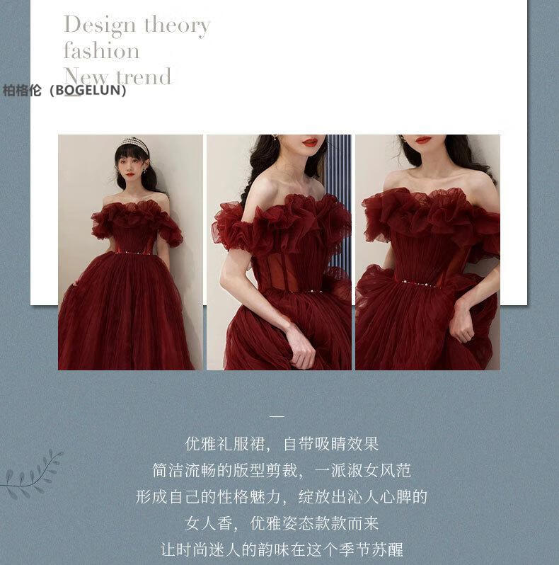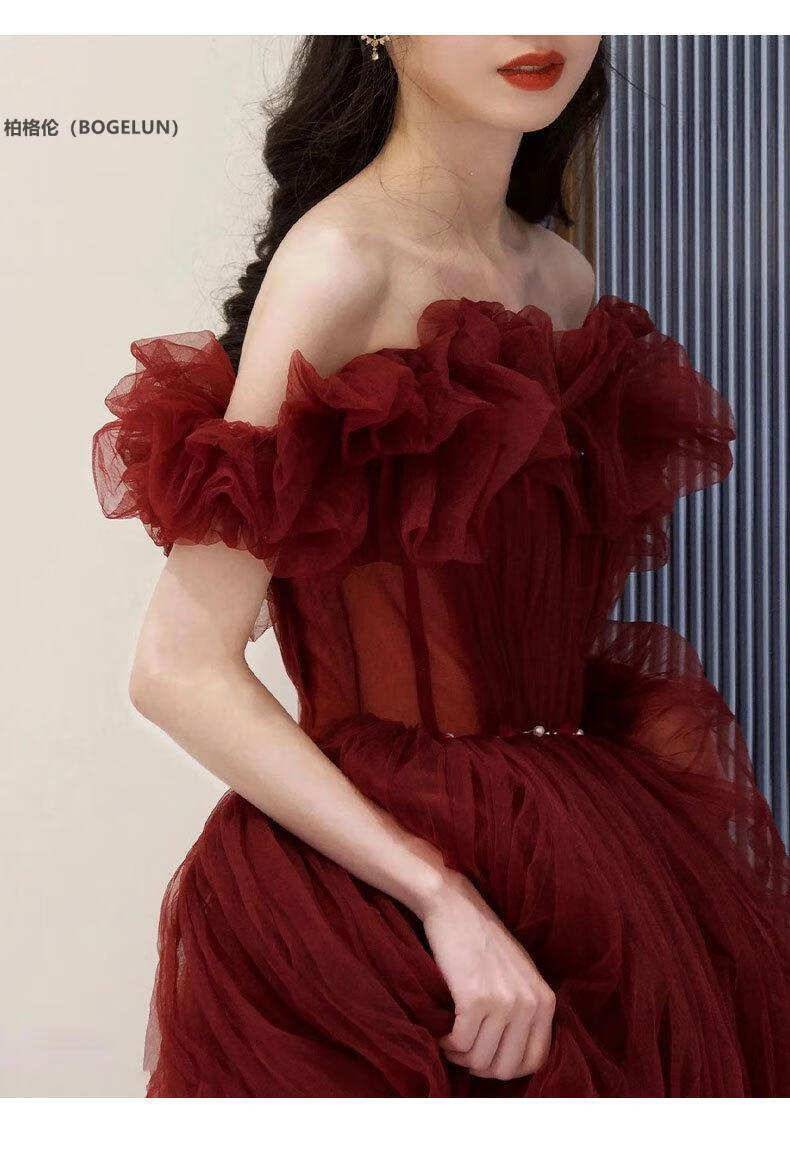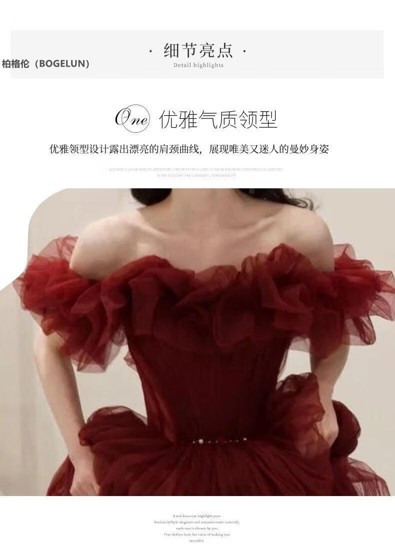 Berggren one-shoulder burgundy toast dress bride's French fluffy gauze coming-of-age ceremony banquet host performance evening dress for women burgundy XXS