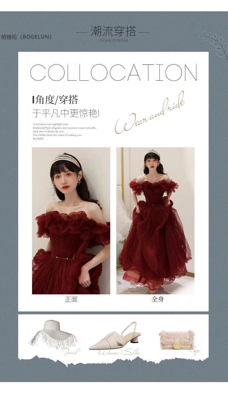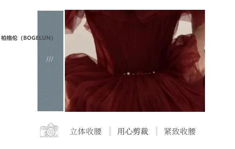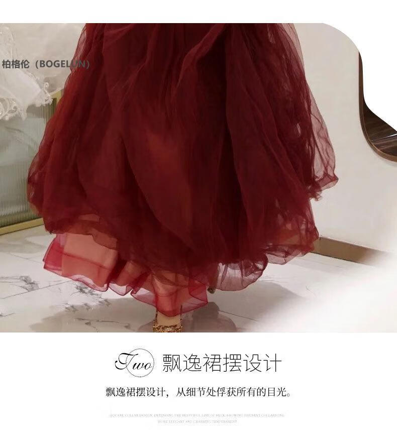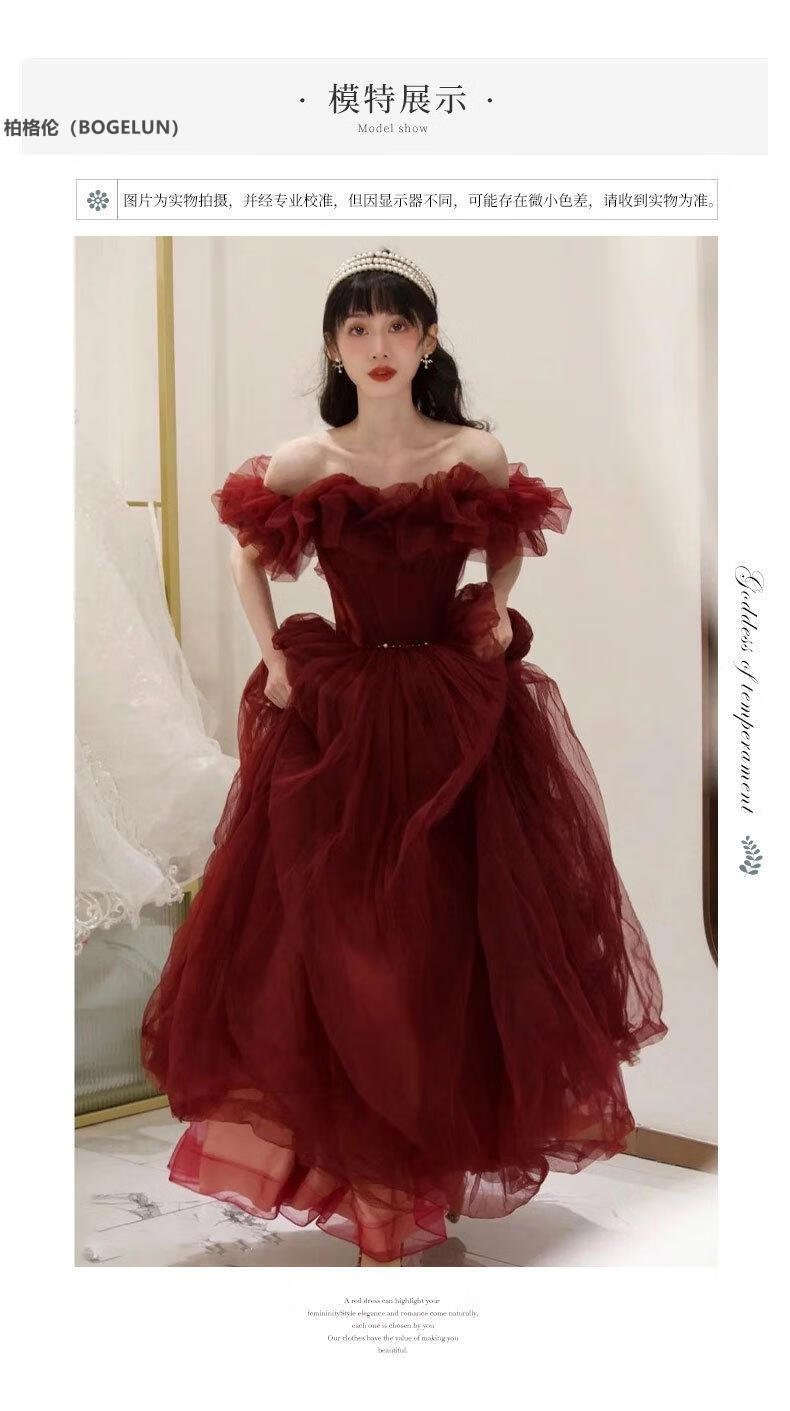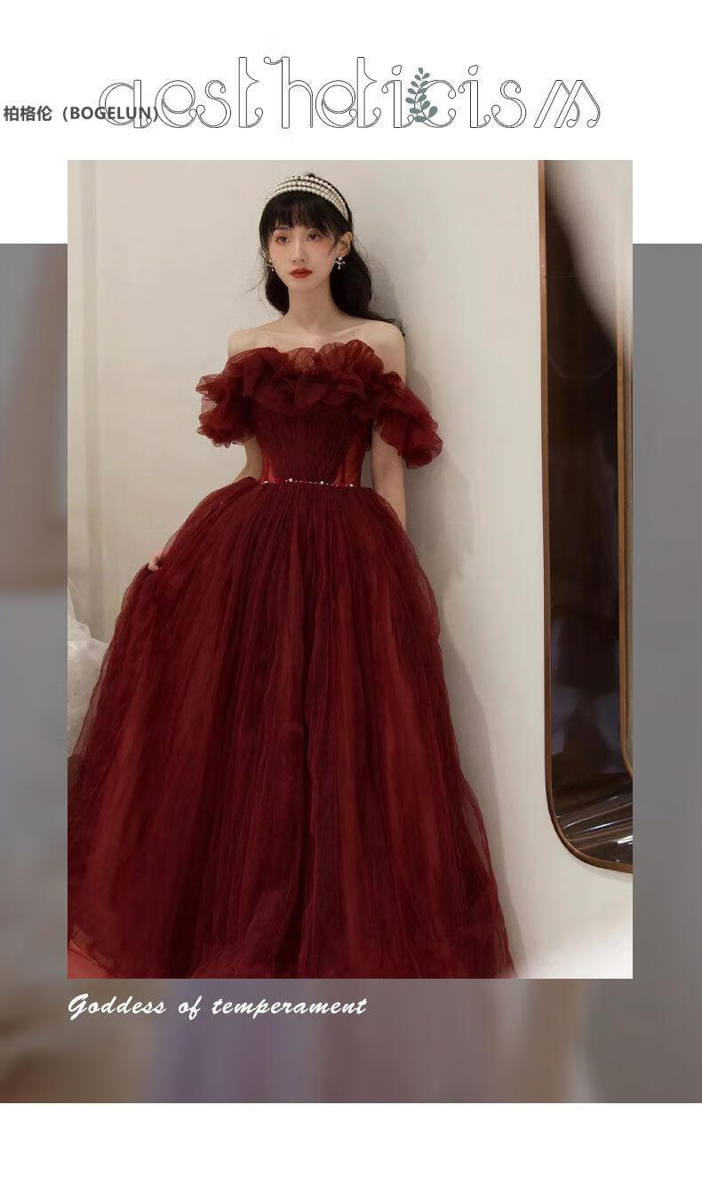 Berggren one-shoulder burgundy toast dress bride's French fluffy gauze coming-of-age ceremony banquet host performance evening dress for women burgundy XXS