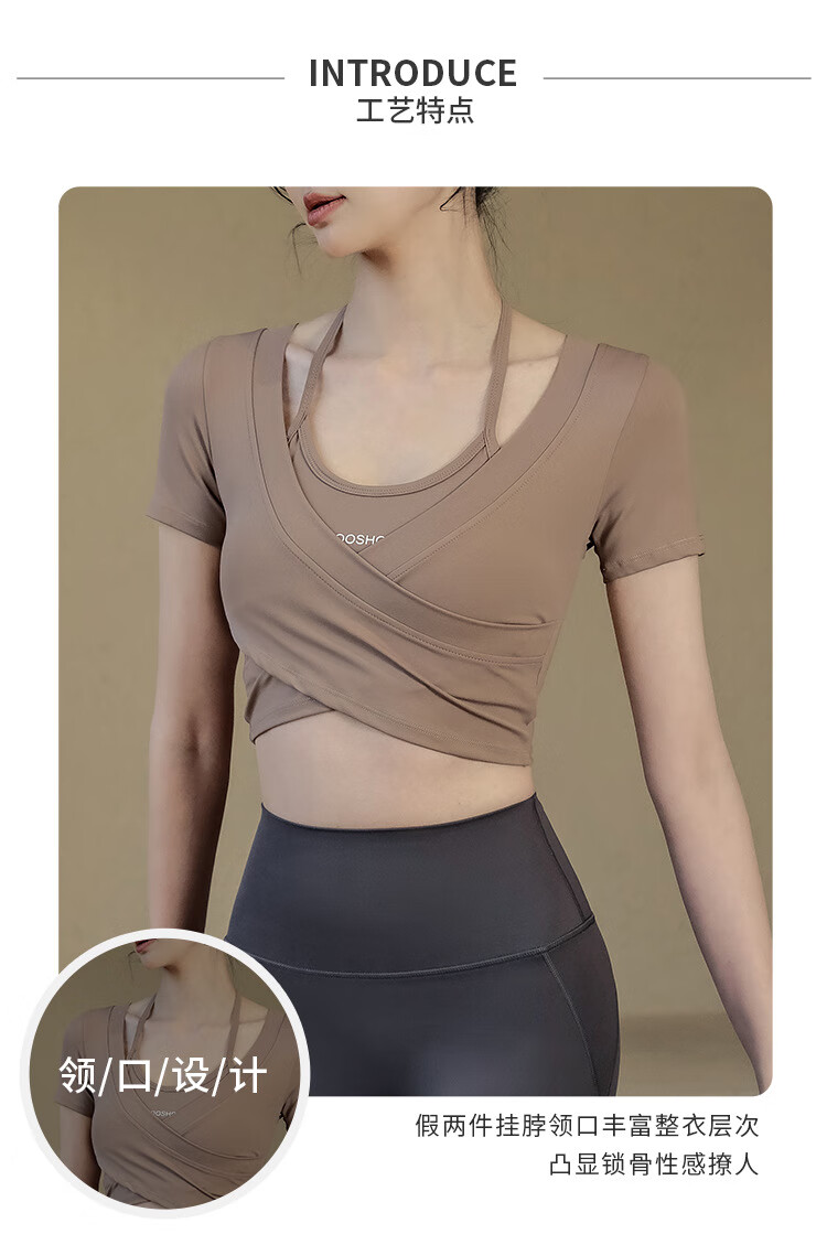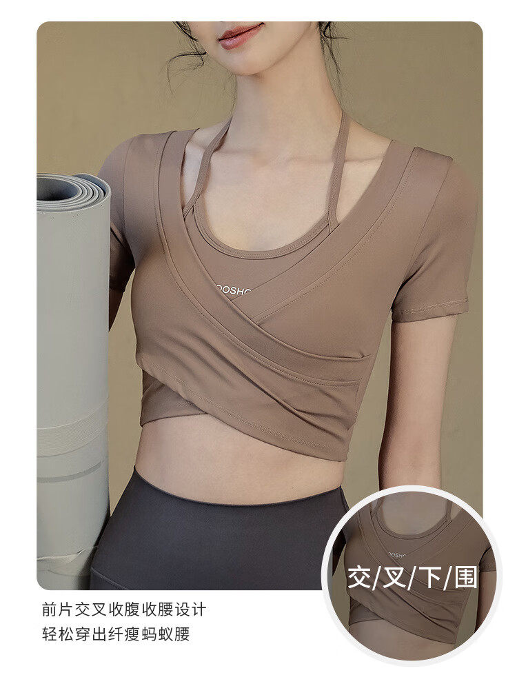 Jincheng yoga wear with chest pad for women summer new fake two-piece Pilates short-sleeved tops fitness sports T-shirt dark brown-GF1226 M (recommended 100-115 Jin Jin equals 0.5 kg)