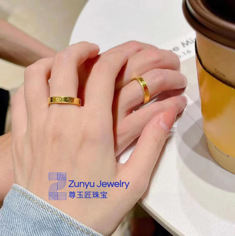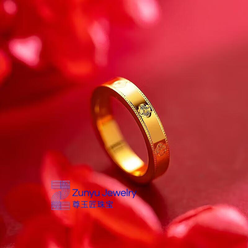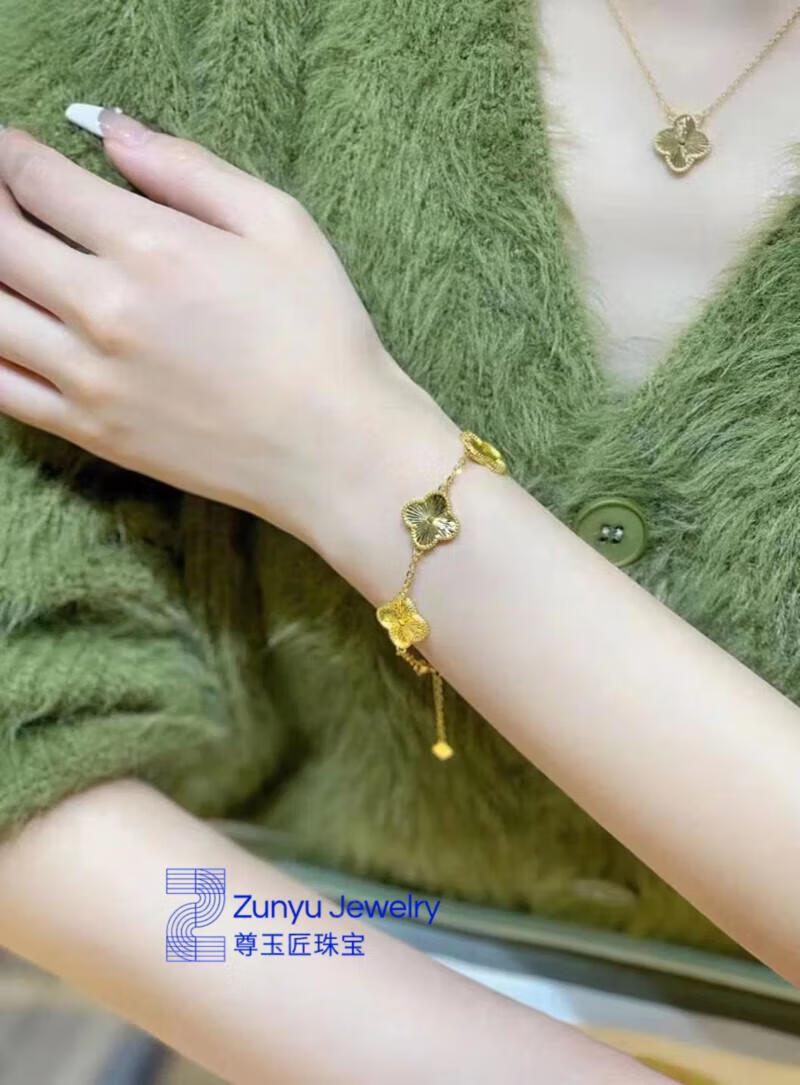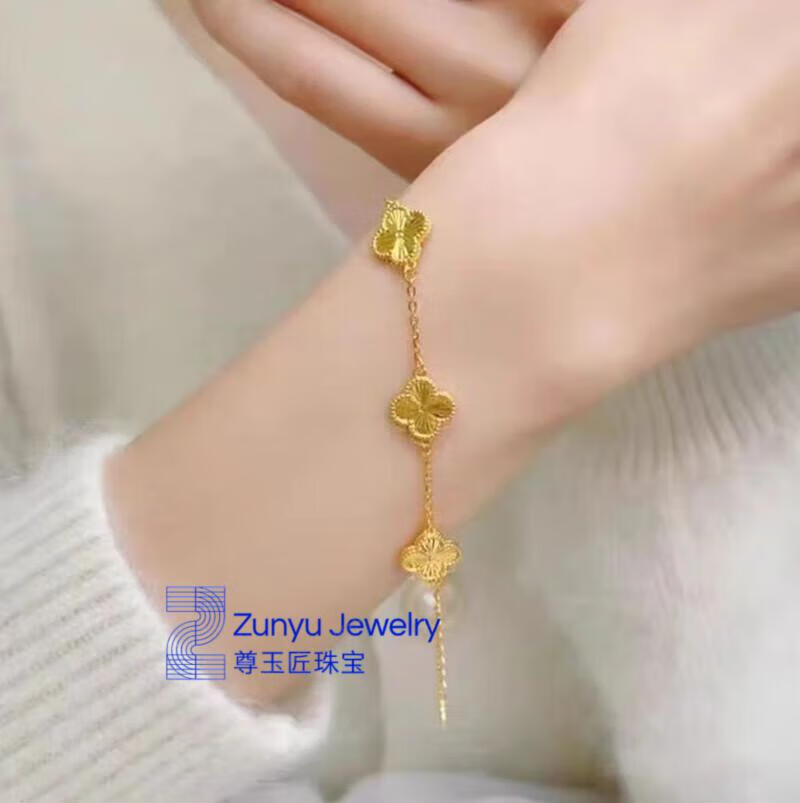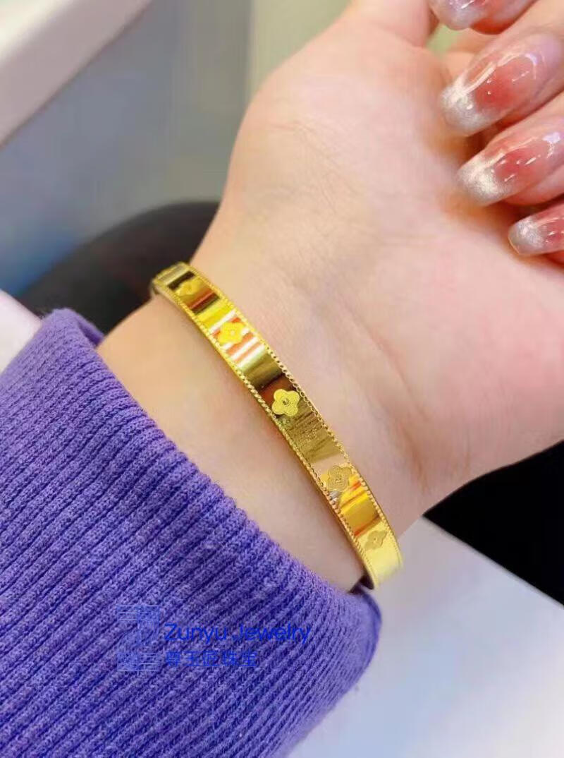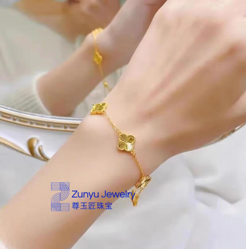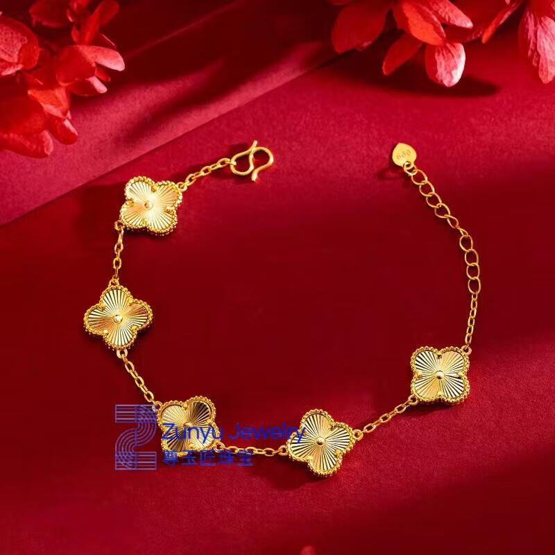 Five-flowered four-leaf clover bracelet new 24K gold women's 999 plain gold clover bracelet 3D hard four-leaf clover ring #6, about 4.2 grams