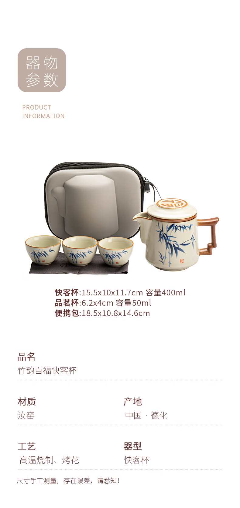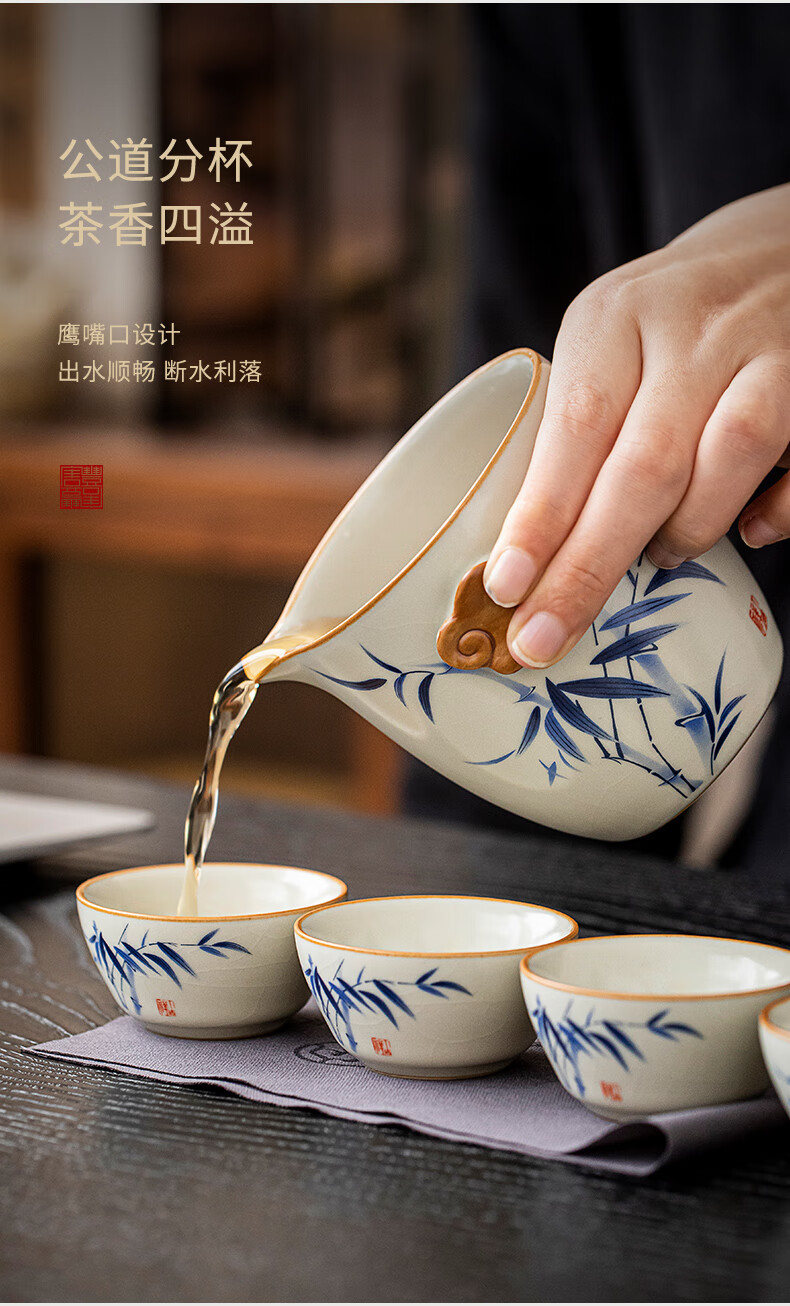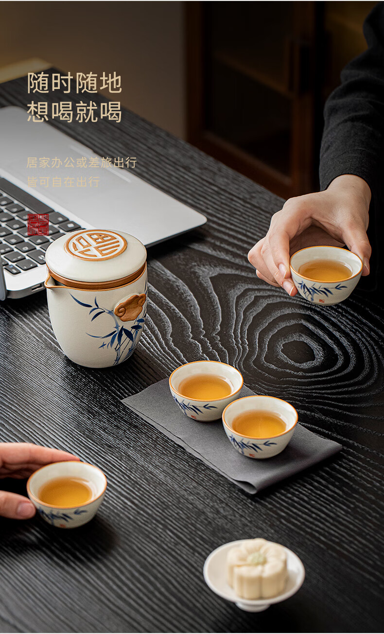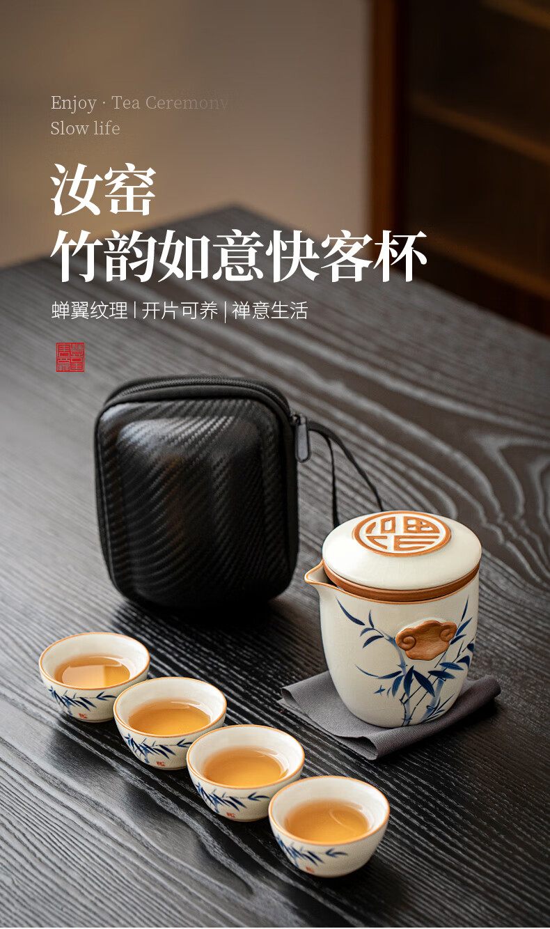Tangfeng Ru Kiln Travel Tea Set Portable One Pot Four Cups Outdoor Camping Accompanying Tea Making Quick Cup Housewarming Gift Bamboo Rhyming Ruyi Quick Cup