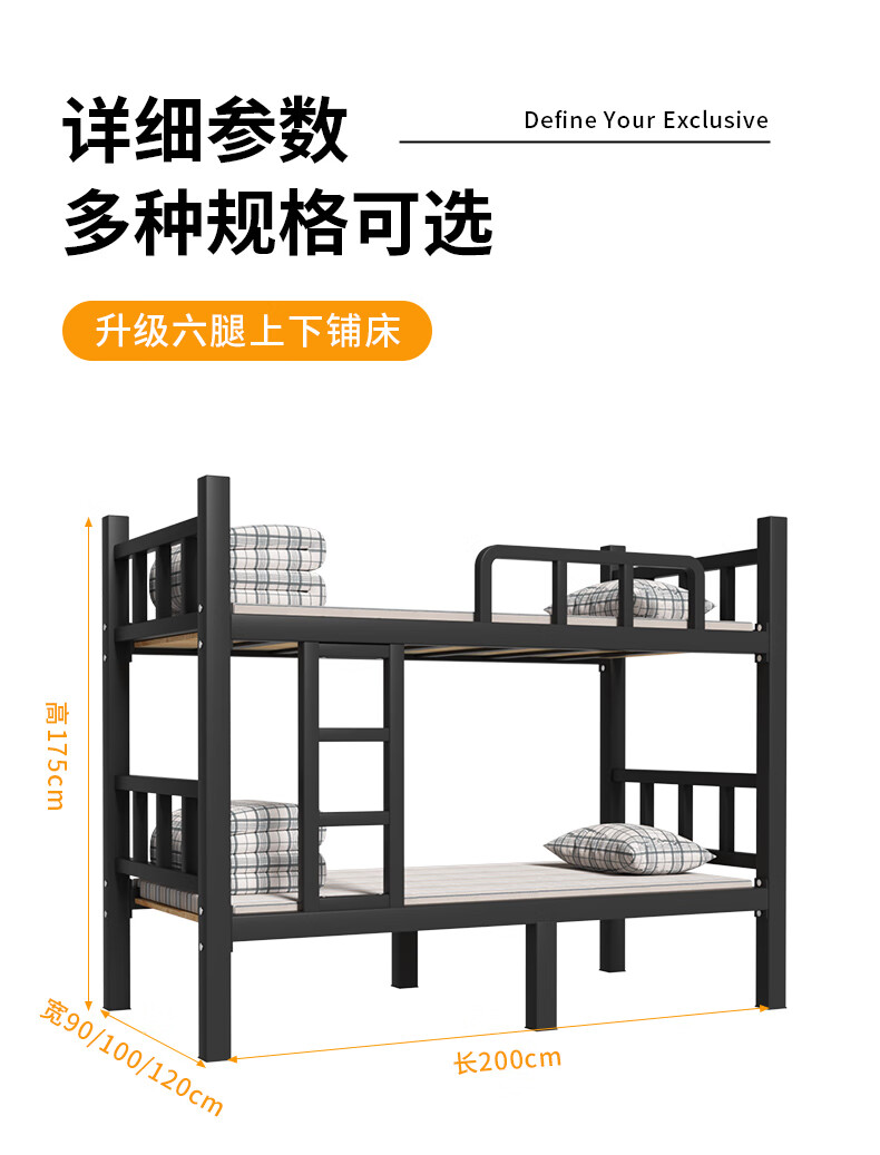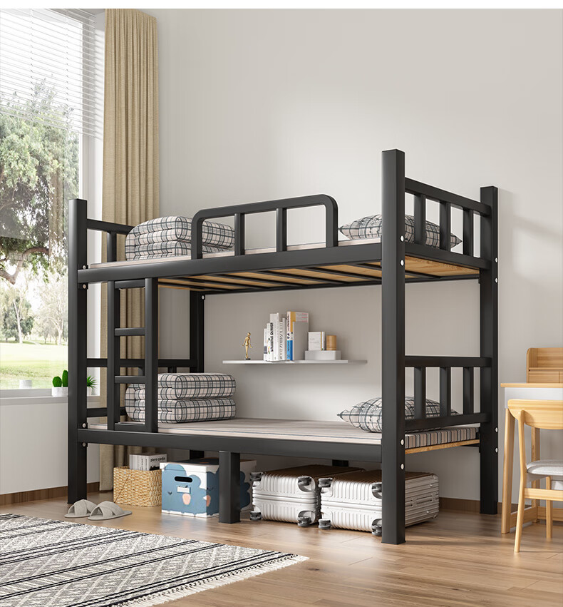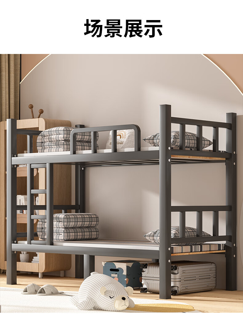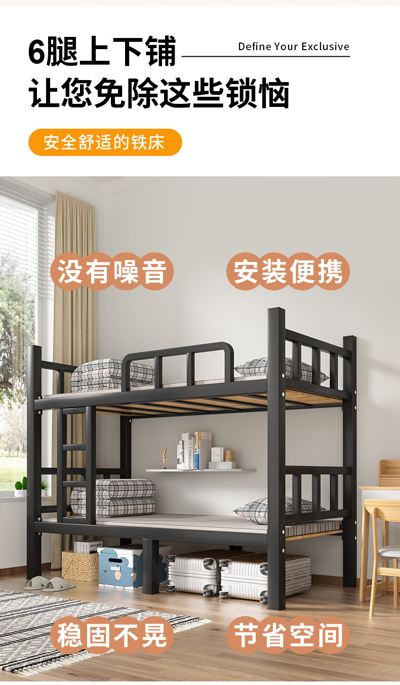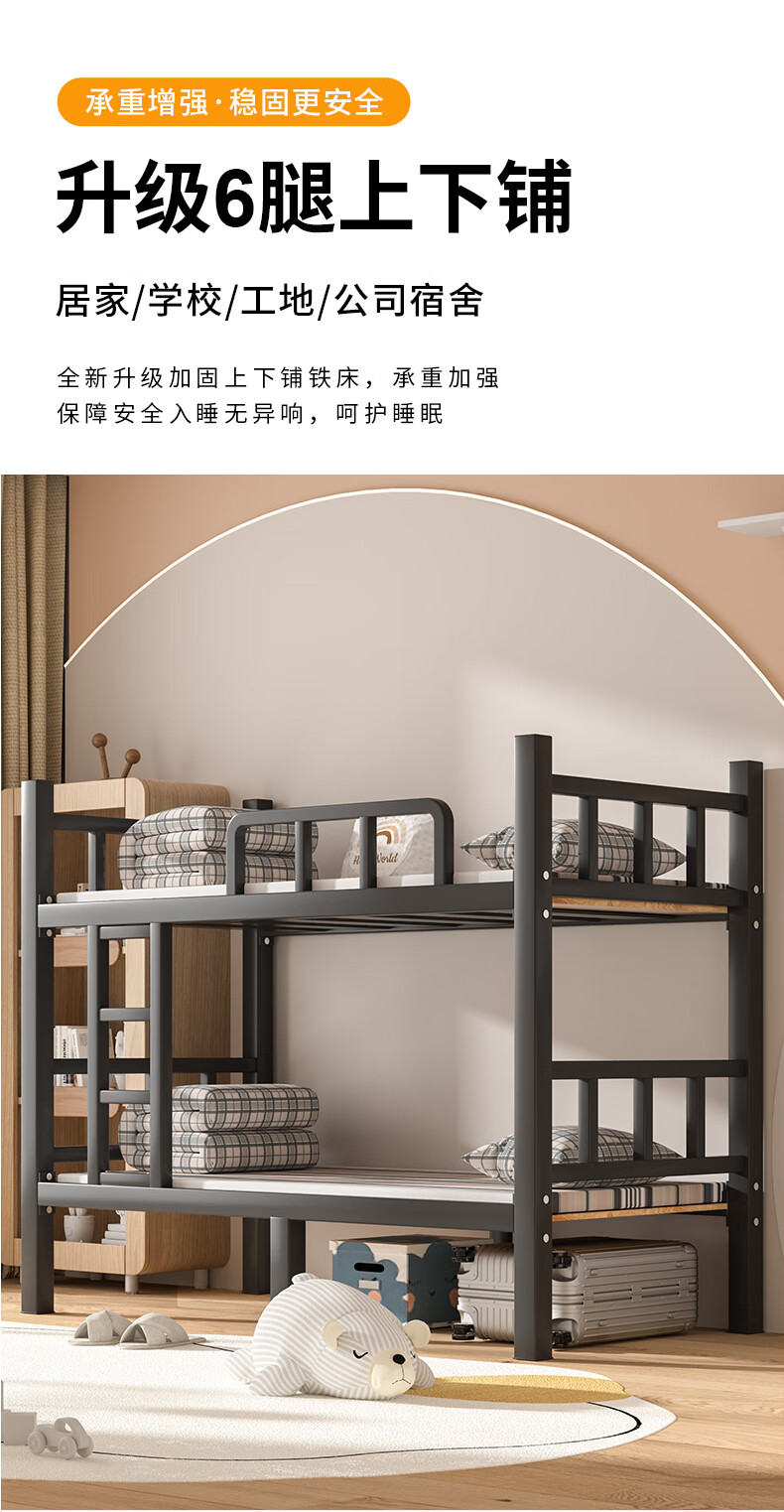 Thickened bunk bed, six-legged iron bed, thickened bunk bed, dormitory bed, construction site double bed, thickened iron bed, steel wood bed, black, promotional model 90 wide, 200 long, free silent bed board
