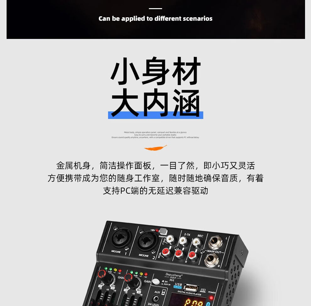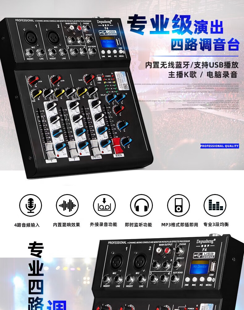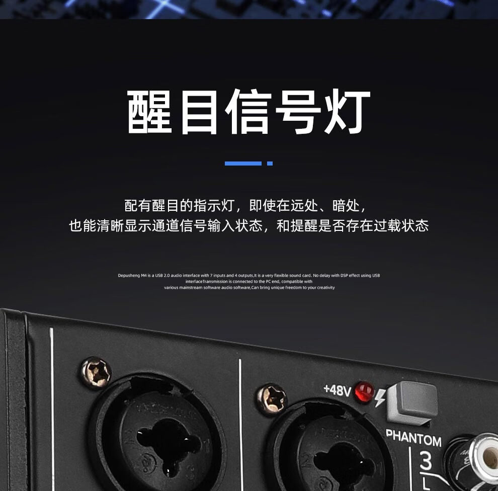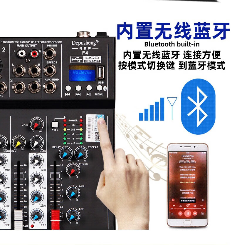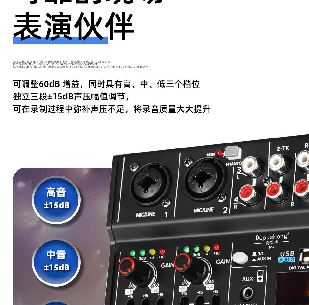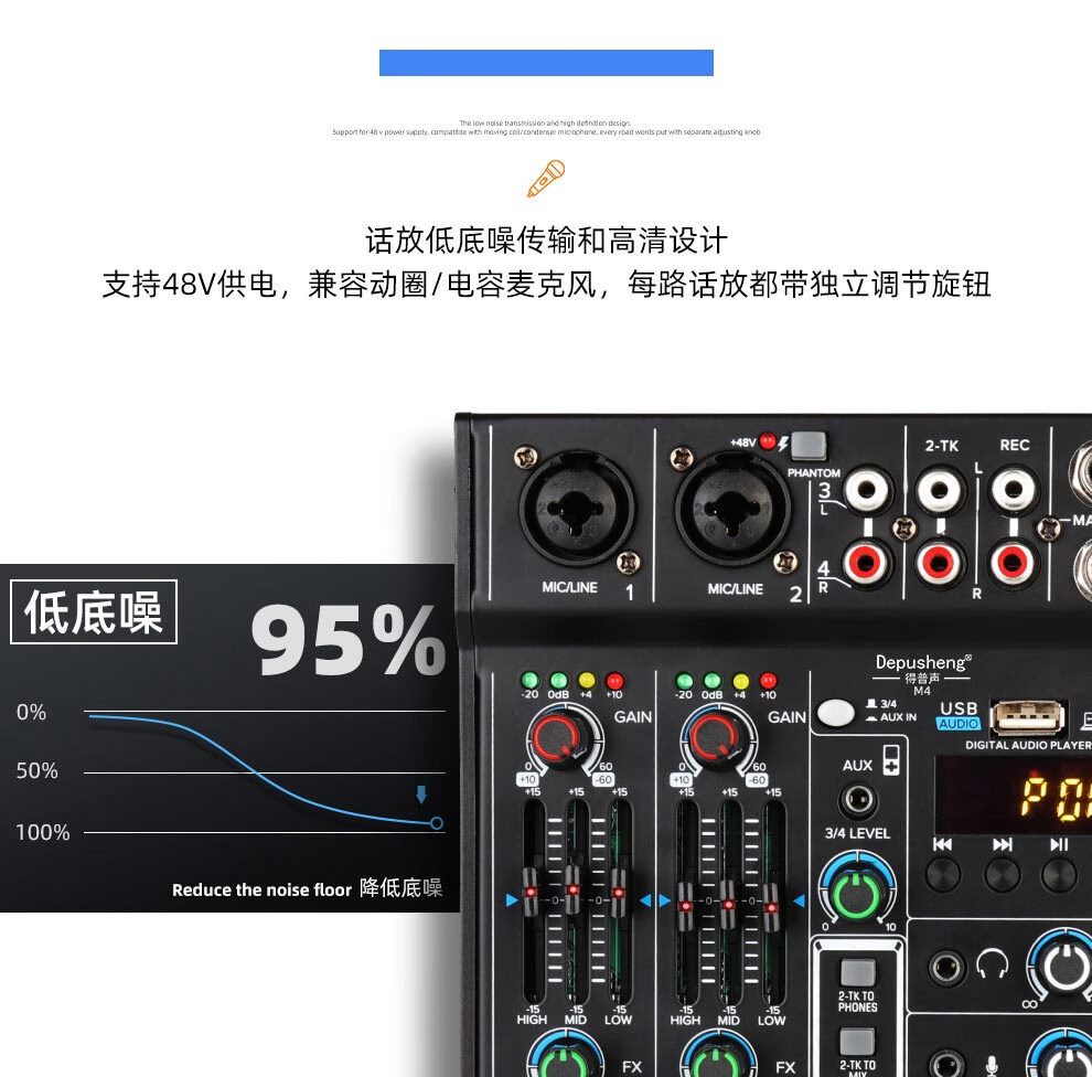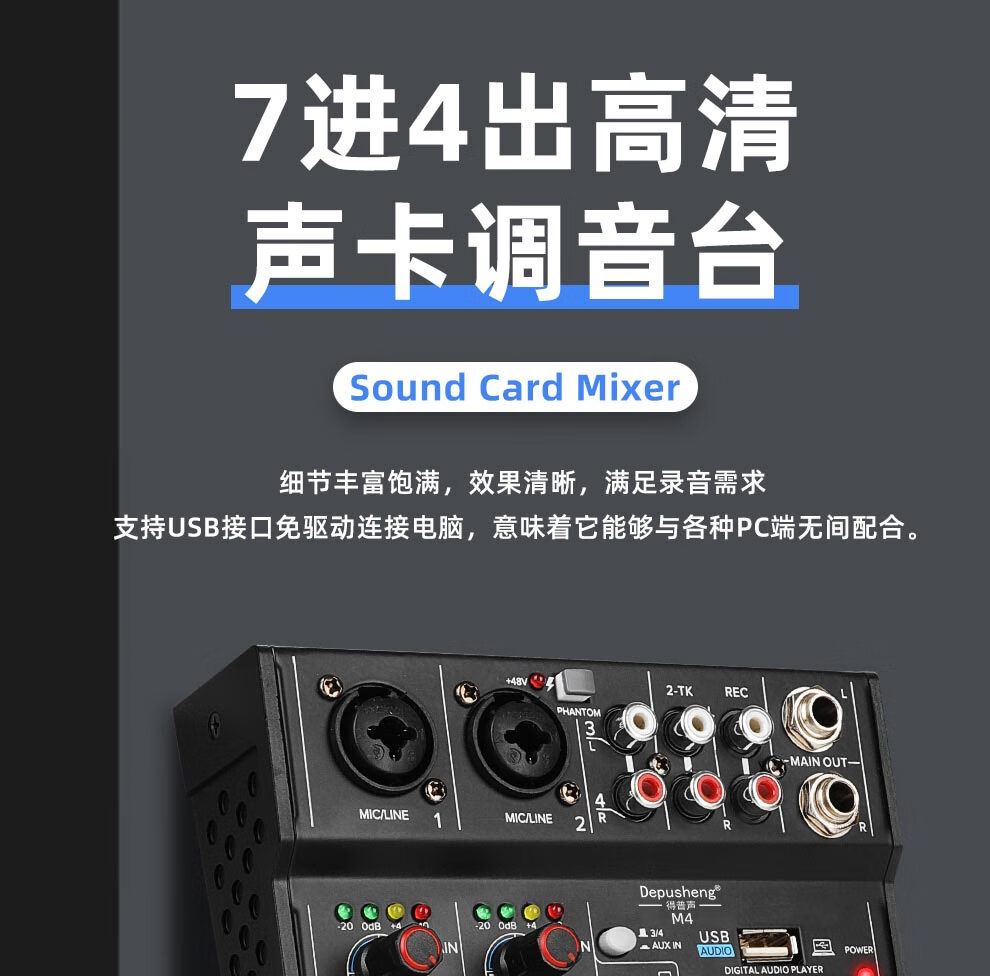 Depusheng professional 4-way mixer computer recording performance home KTV singing video conference live broadcast USB sound card Bluetooth reverb effect balanced wireless microphone small console M4 USB sound card mixer