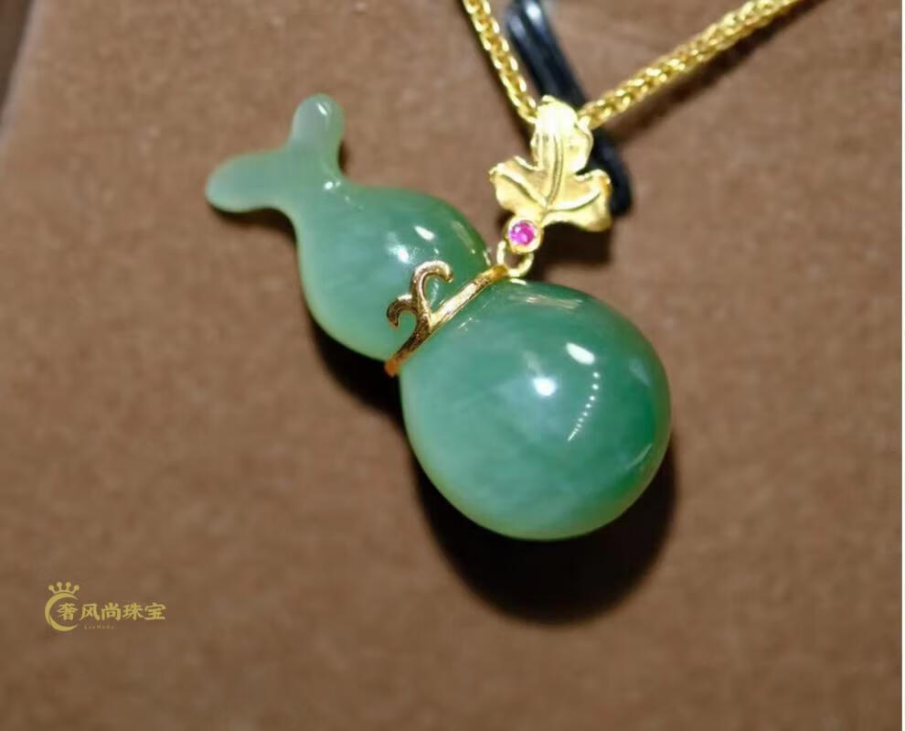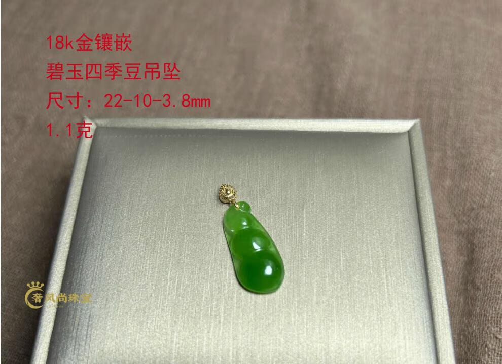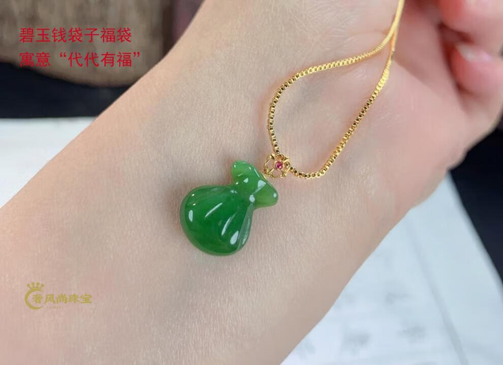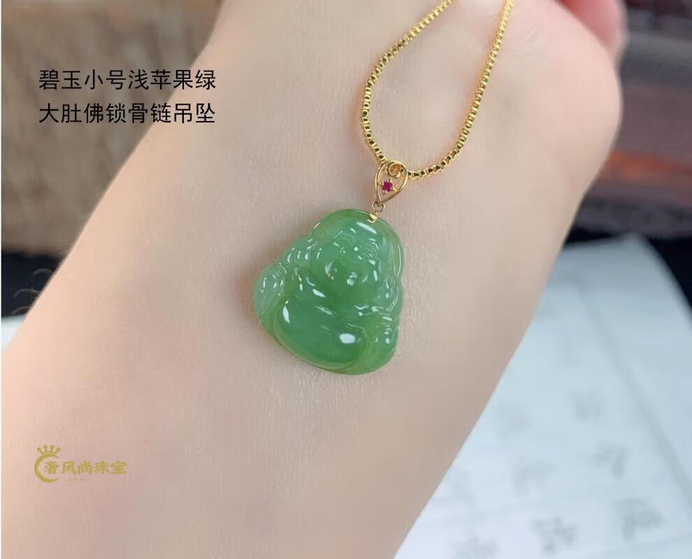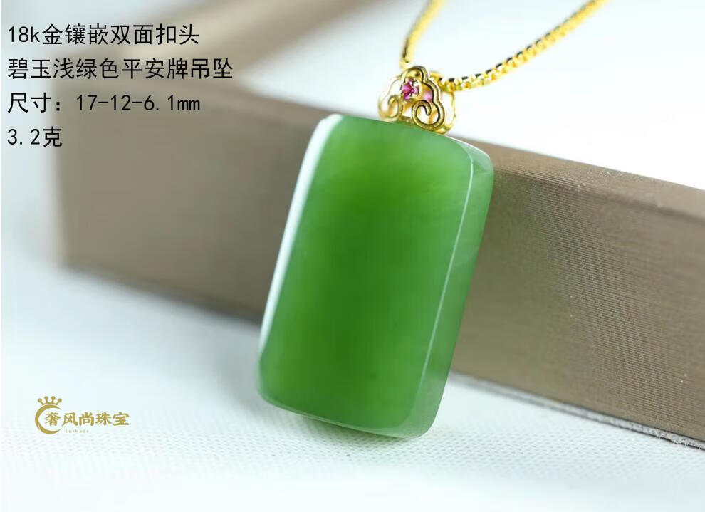Fat Donglai same style 18K gold Ping An Wu Shi brand Hetian jade jasper Yang green pendant 18k gold inlaid jade pendant lock 18K gold apple green Ruyi 34-24-5mm + silver necklace