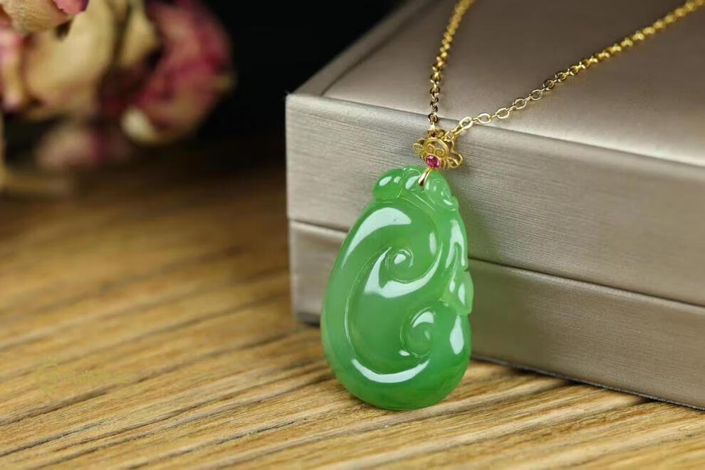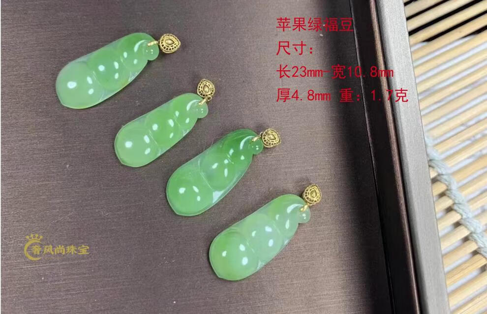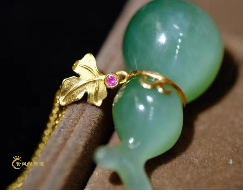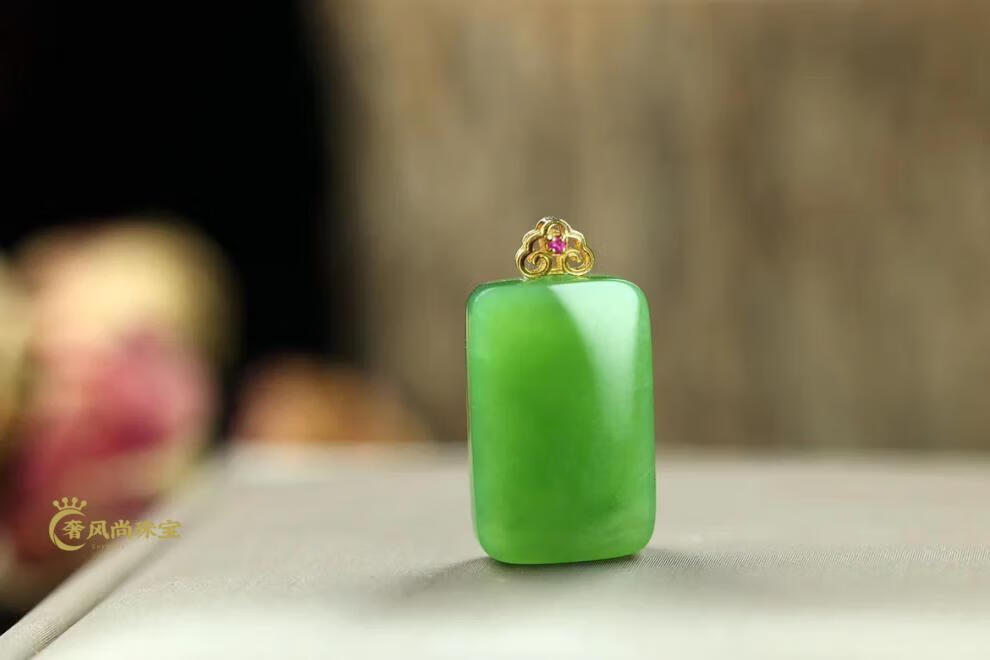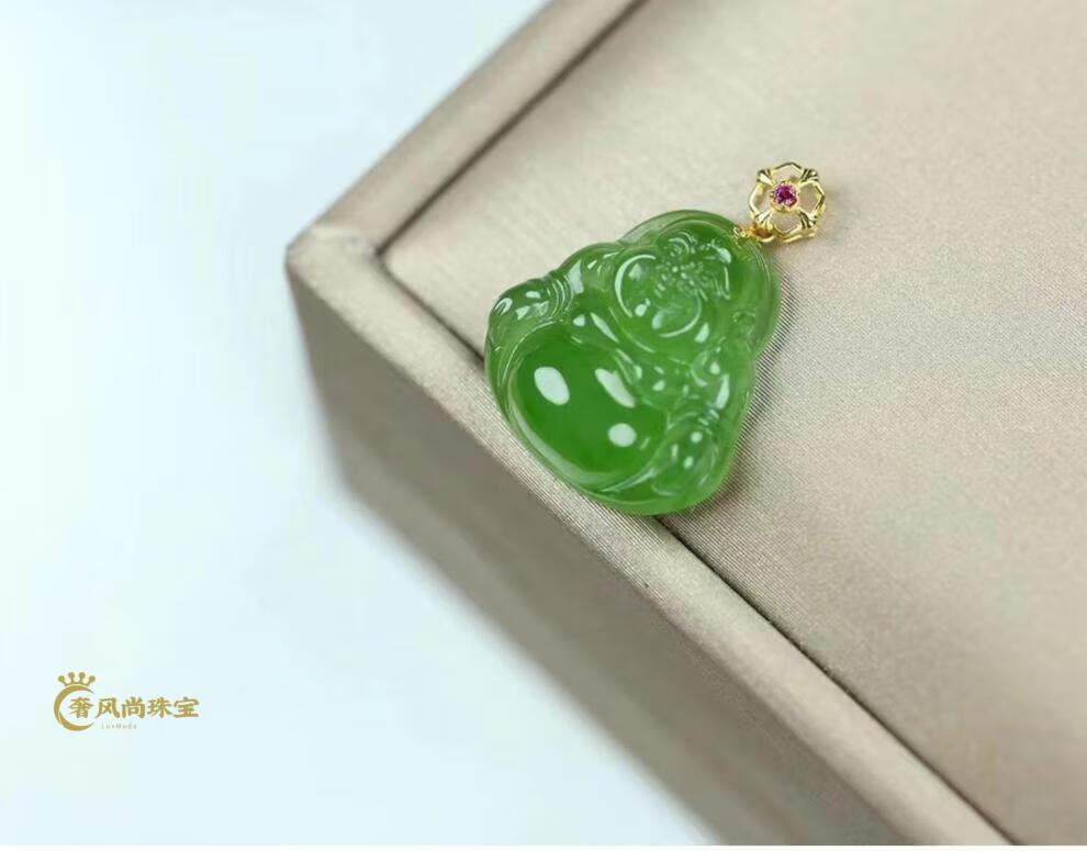 Fat Donglai same style 18K gold Ping An Wu Shi brand Hetian jade jasper Yang green pendant 18k gold inlaid jade pendant lock 18K gold apple green Ruyi 34-24-5mm + silver necklace