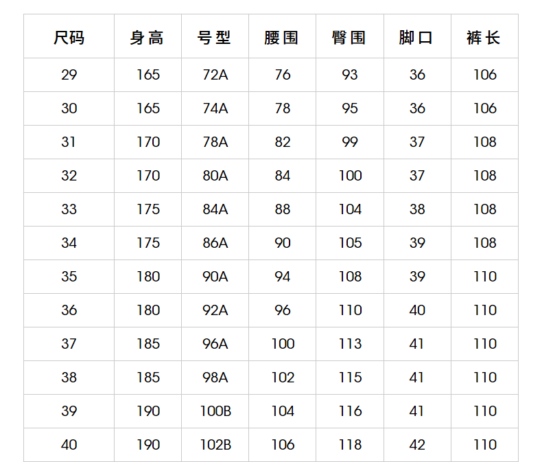 China (cm) 160-165/84-86 165-170 / 88-90 167-172 / 92-96 168-173 / 98-102 170-176 / 106-110