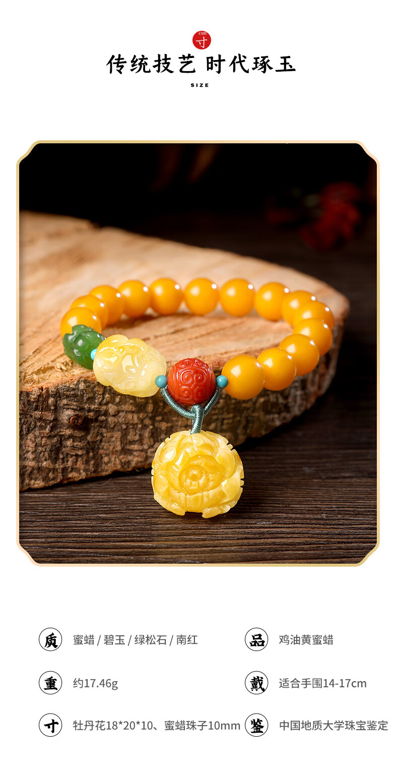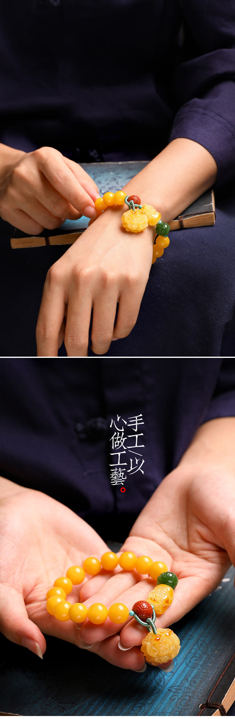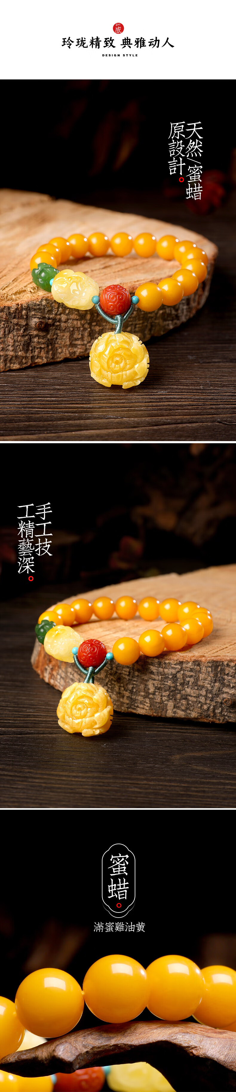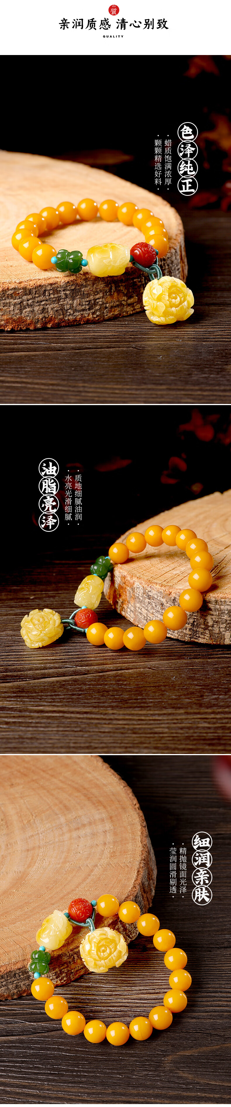 Layun Feiyin beeswax bracelet for women, high-end craftsmanship, peony flower, jade, and amber handmade chicken fat yellow beaded bracelet, about 10mm (with certificate)