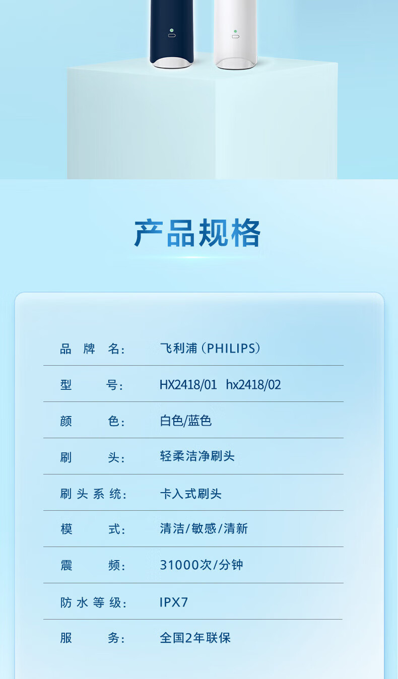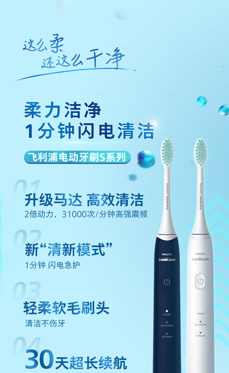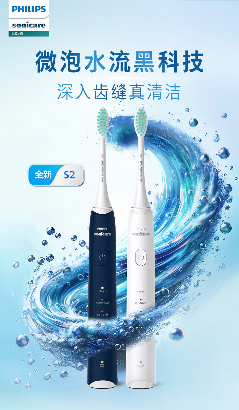 Philips (PHILIPS) electric toothbrush S2 net power brush cleans teeth and protects gums, sonic vibration, DuPont soft power, soft bristles, gentle cleansing, does not hurt teeth, lightning cleaning, long battery life, birthday gift HX2418 white