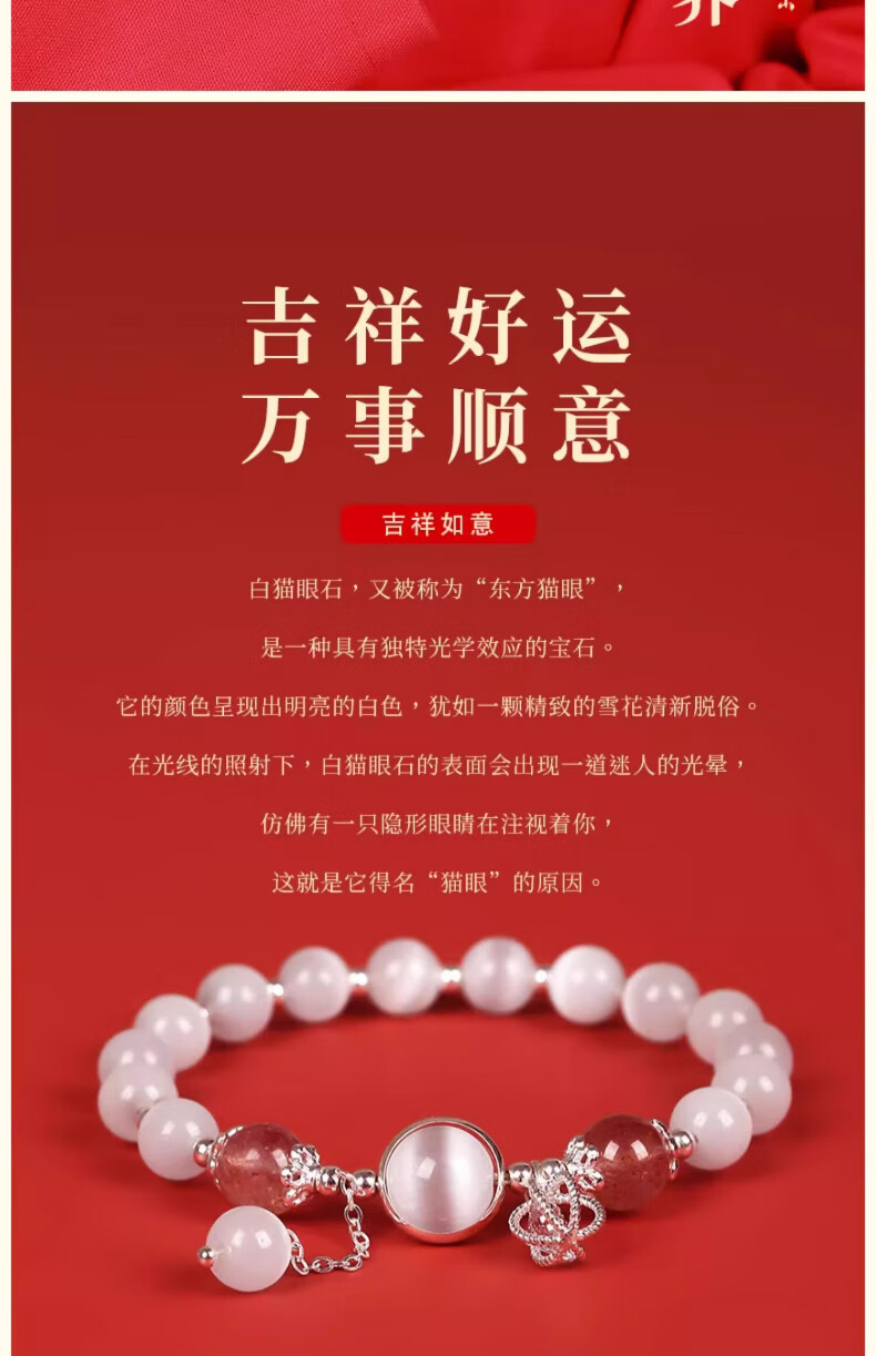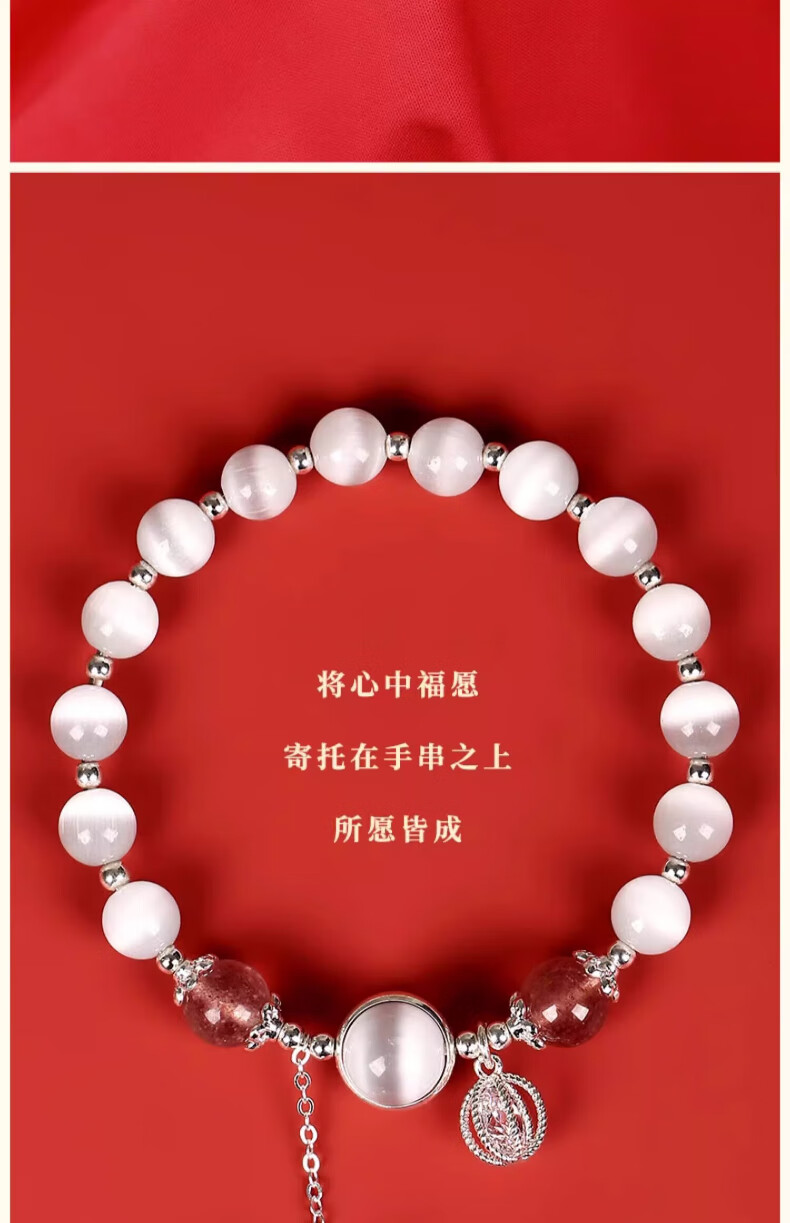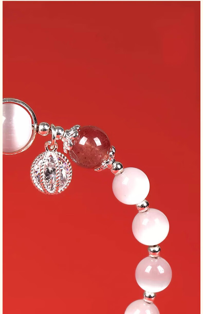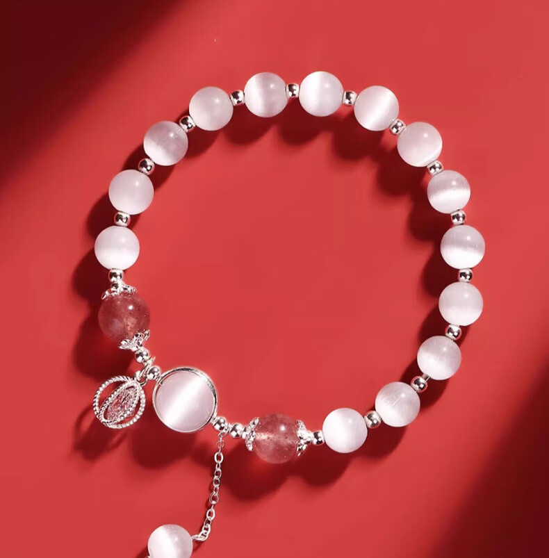 BOSFRU cat's eye stone bracelet for girls, white cat's eye bracelet, strawberry crystal crystal jewelry, gift for girlfriend and mother, accessories, white cat's eye stone bracelet