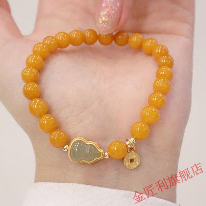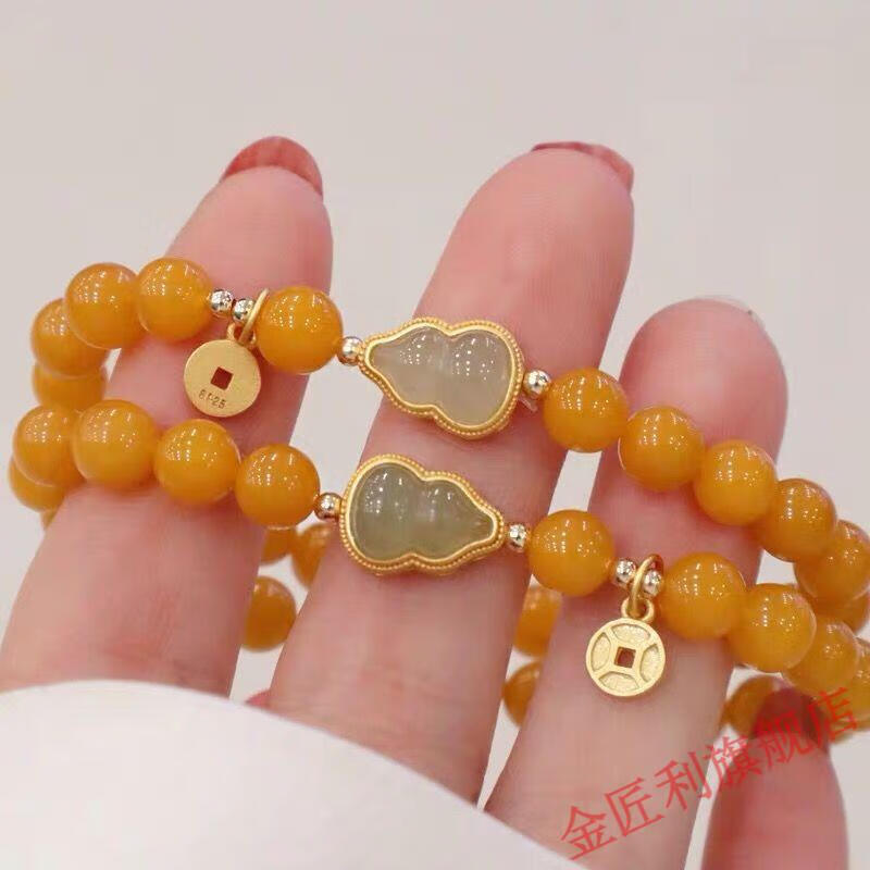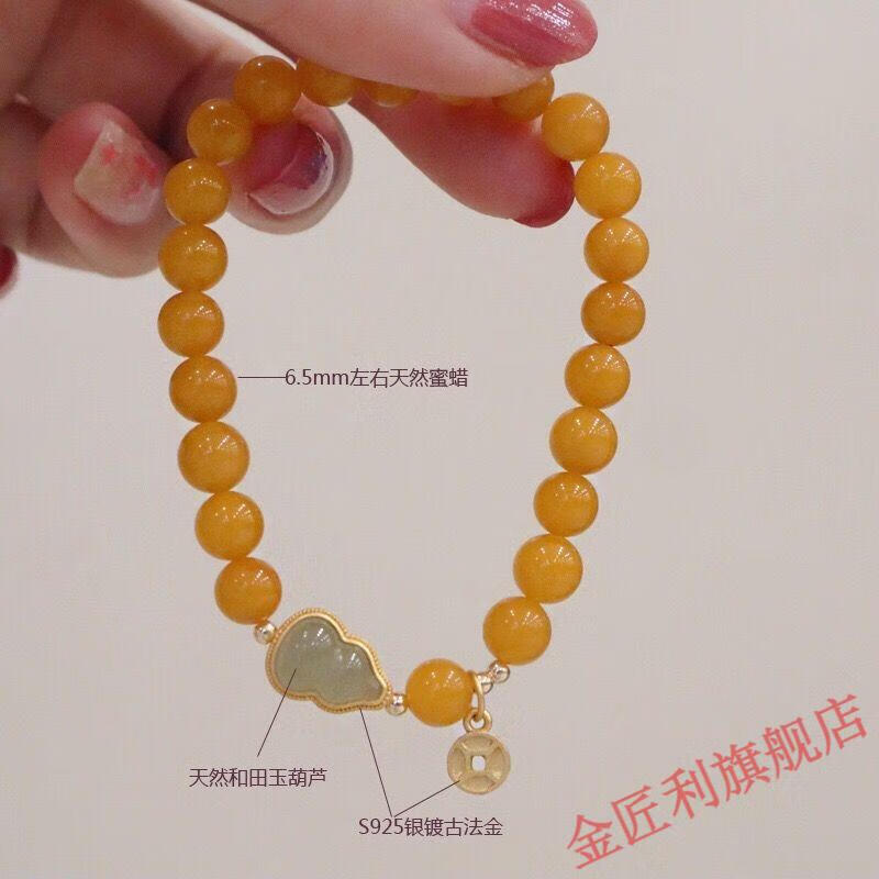 Goldsmith Lee's natural beeswax bracelet is transformed into yellow honey and Hetian jade gourd bracelet, which is an ancient style gift for best friends. Yellow honey and Hetian jade fortune bracelet 8mm