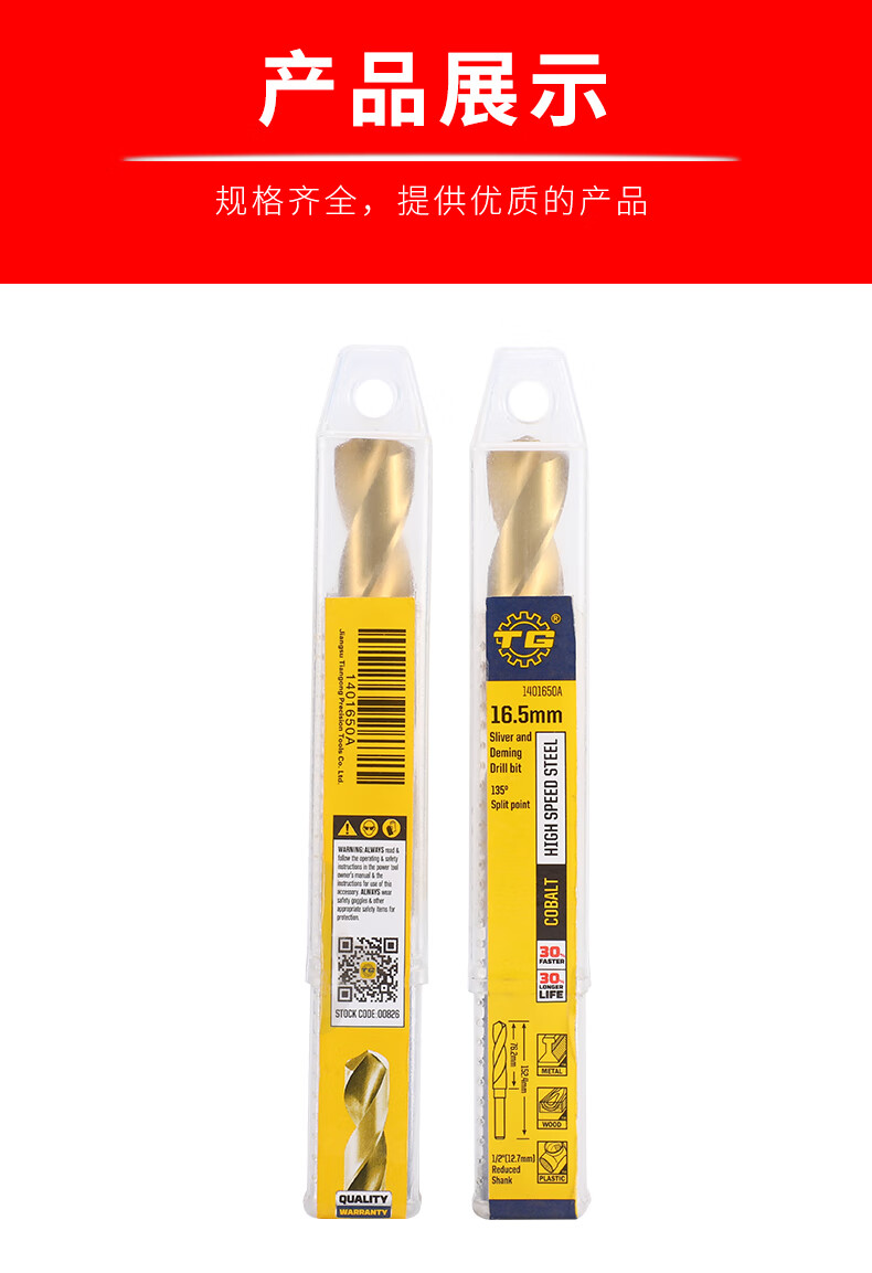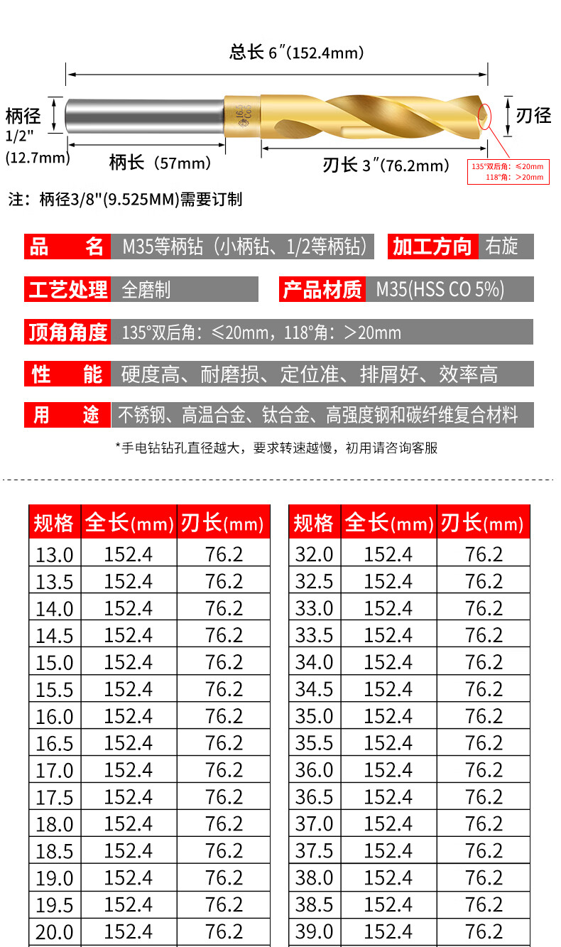 Tiangong (TIANGONG) M35 equal shank twist drill bit containing cobalt shrink shank drill stainless steel special industrial grade small shank drill mold steel 1/2 14mm