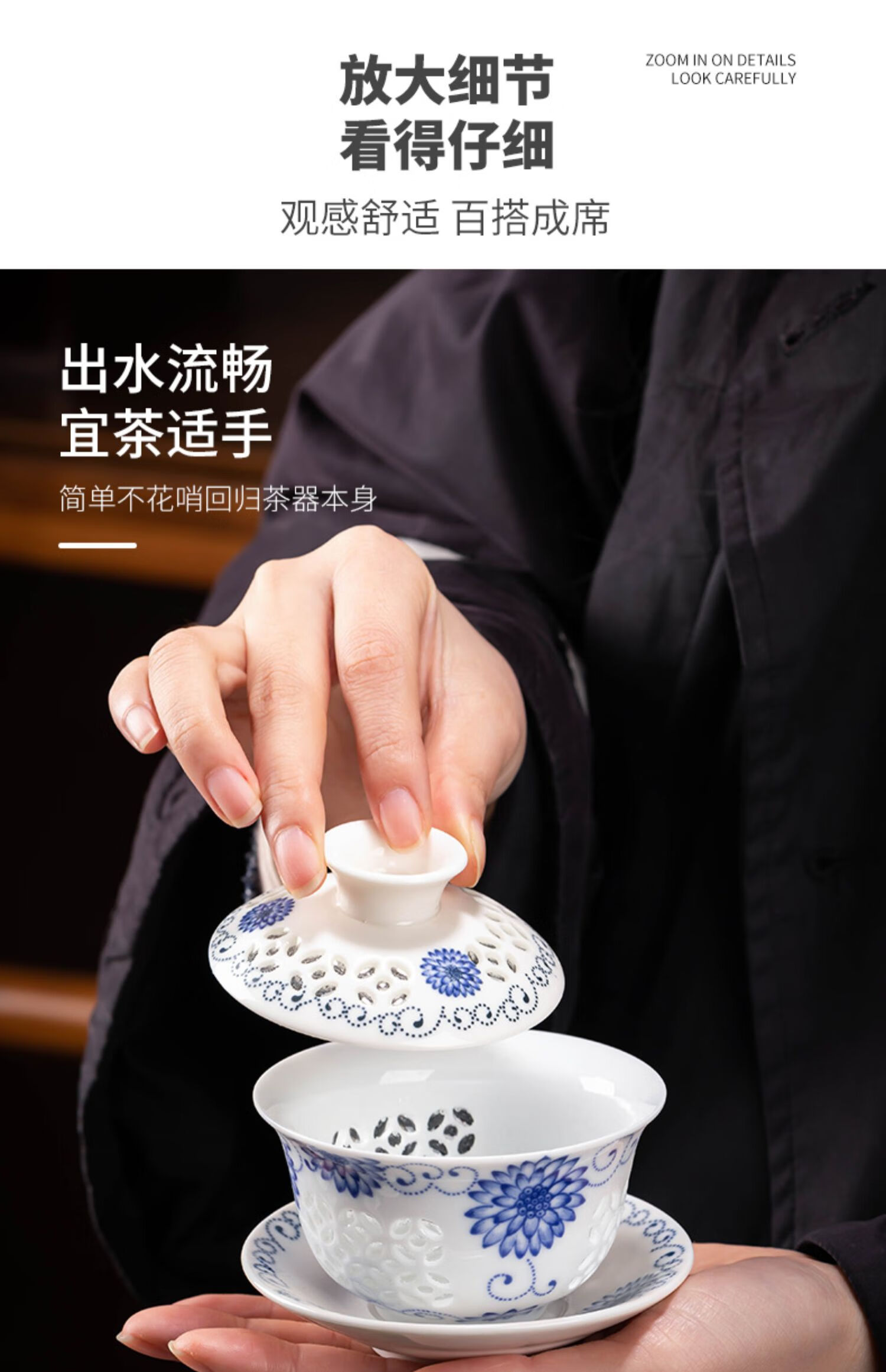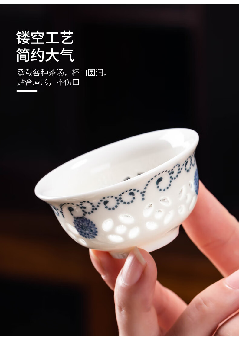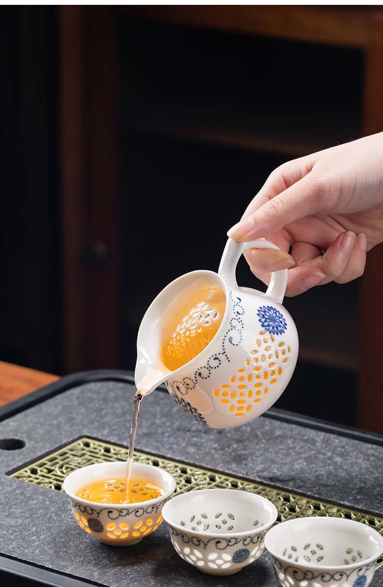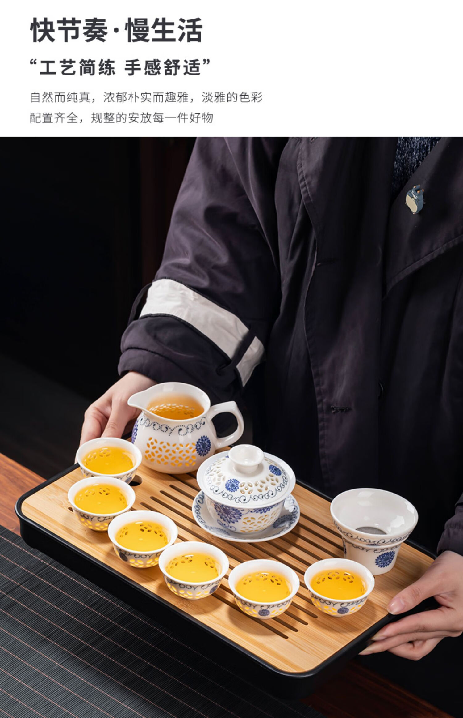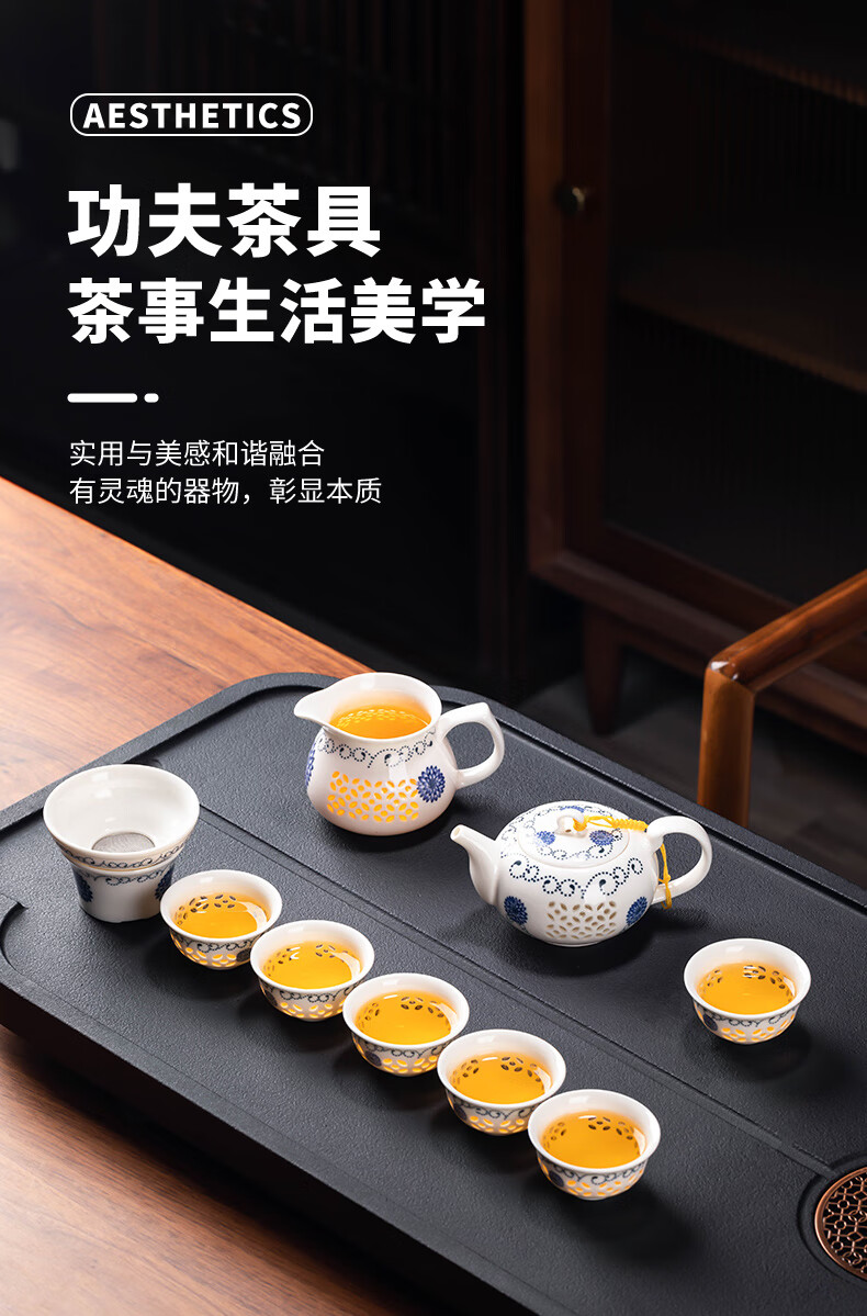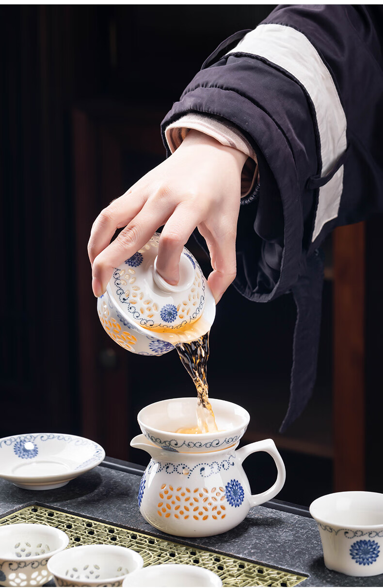 Craftsman's exquisite ceramic tea set complete set of honeycomb hollow tureen simple household kung fu small teapot office tea cup set 10-piece tureen set
