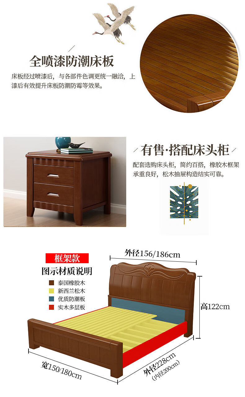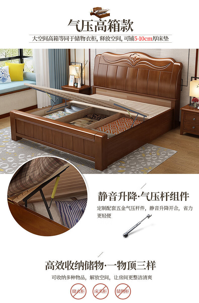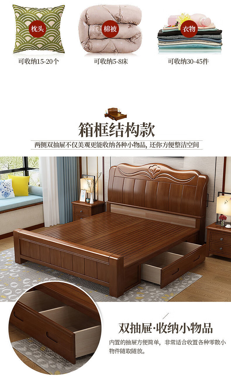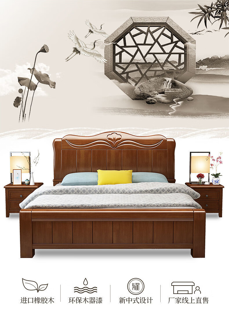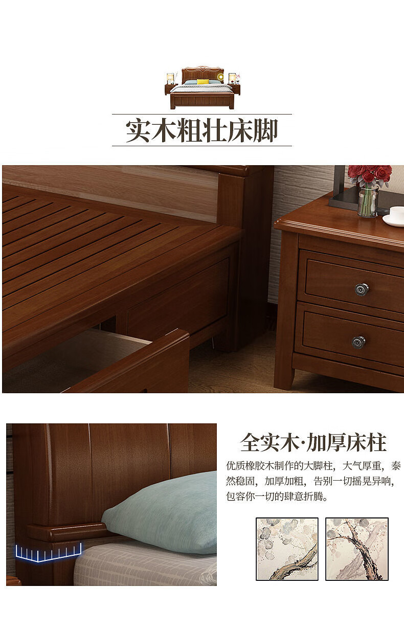 Modern Chinese double bed rubber wood solid wood bed 1.5m bed home bedroom 1.8m storage large bed wedding bed single bed color please note 1800*2000mm frame structure