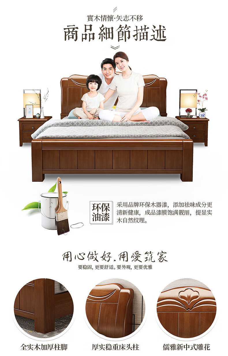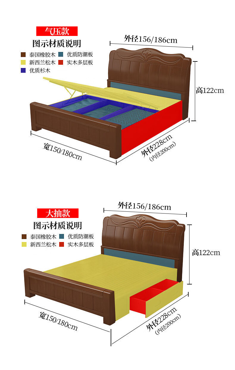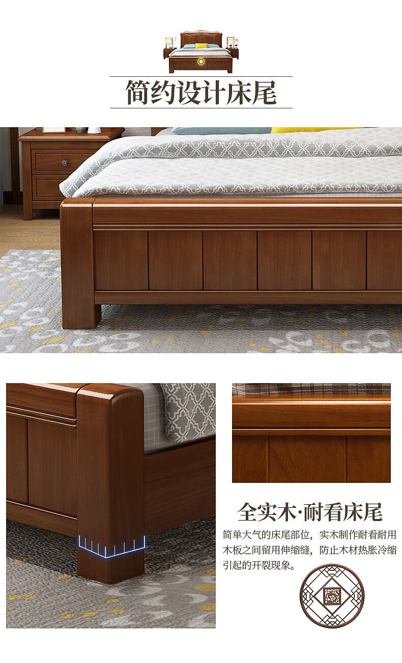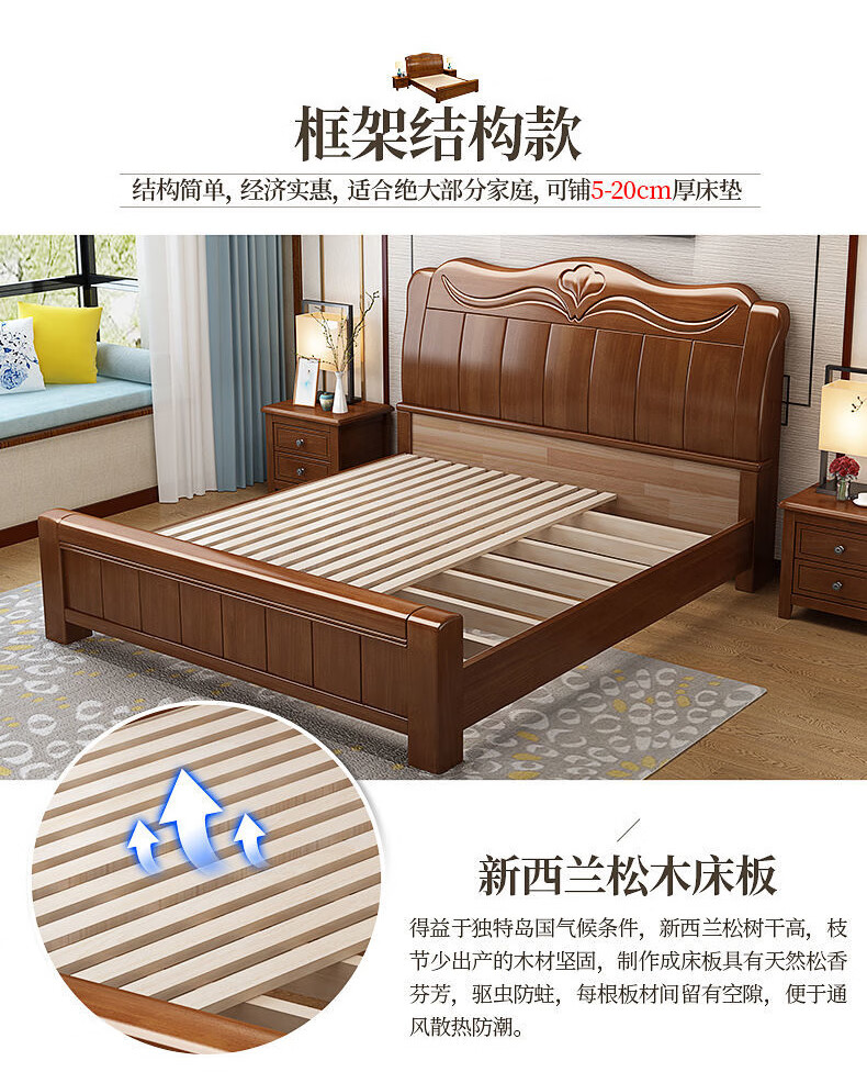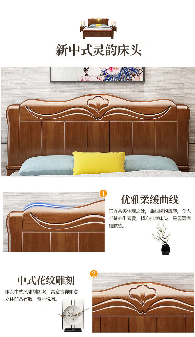 Modern Chinese double bed rubber wood solid wood bed 1.5m bed home bedroom 1.8m storage large bed wedding bed single bed color please note 1800*2000mm frame structure