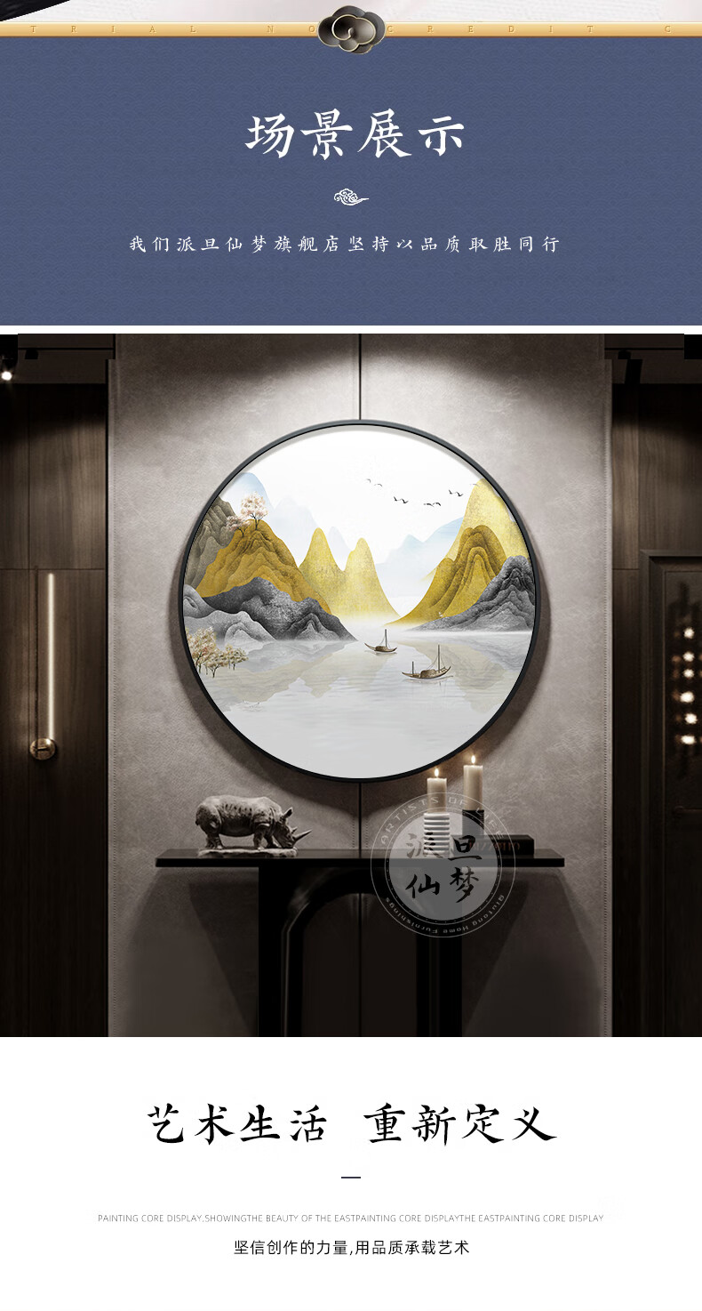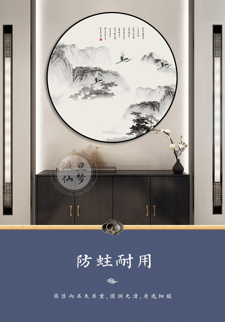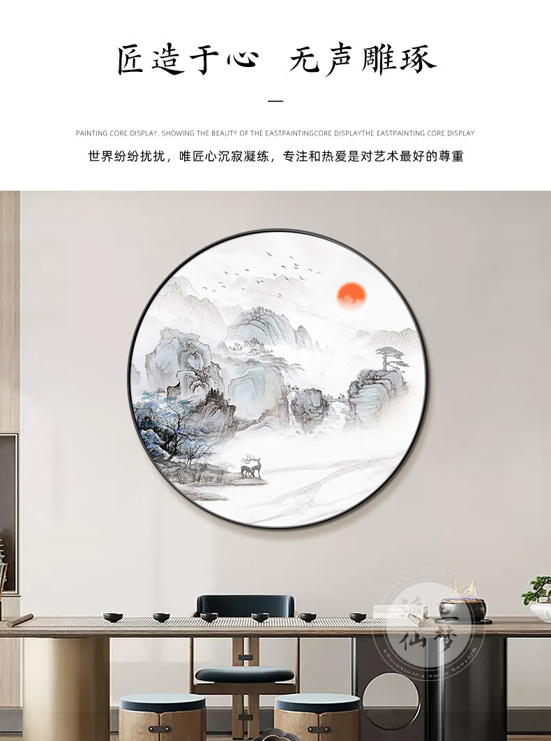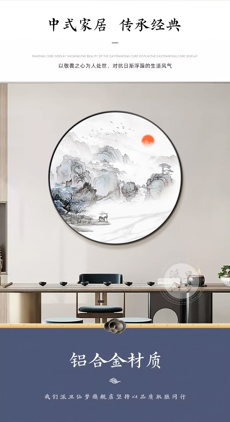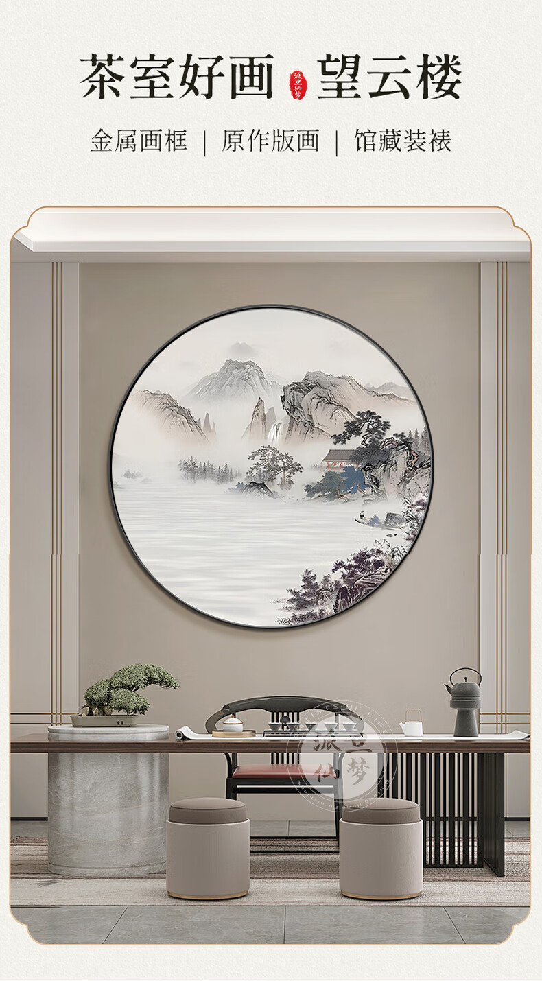 Paidan Xianmeng New Chinese Style Round Decoration Painting Entry Hall Decoration Painting Chinese Tea Room Background Wall Landscape Painting Ink Painting Lake and Mountain Color Diameter 60cm Aluminum Alloy Black Frame/Crystal Porcelain Surface