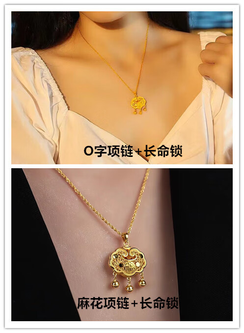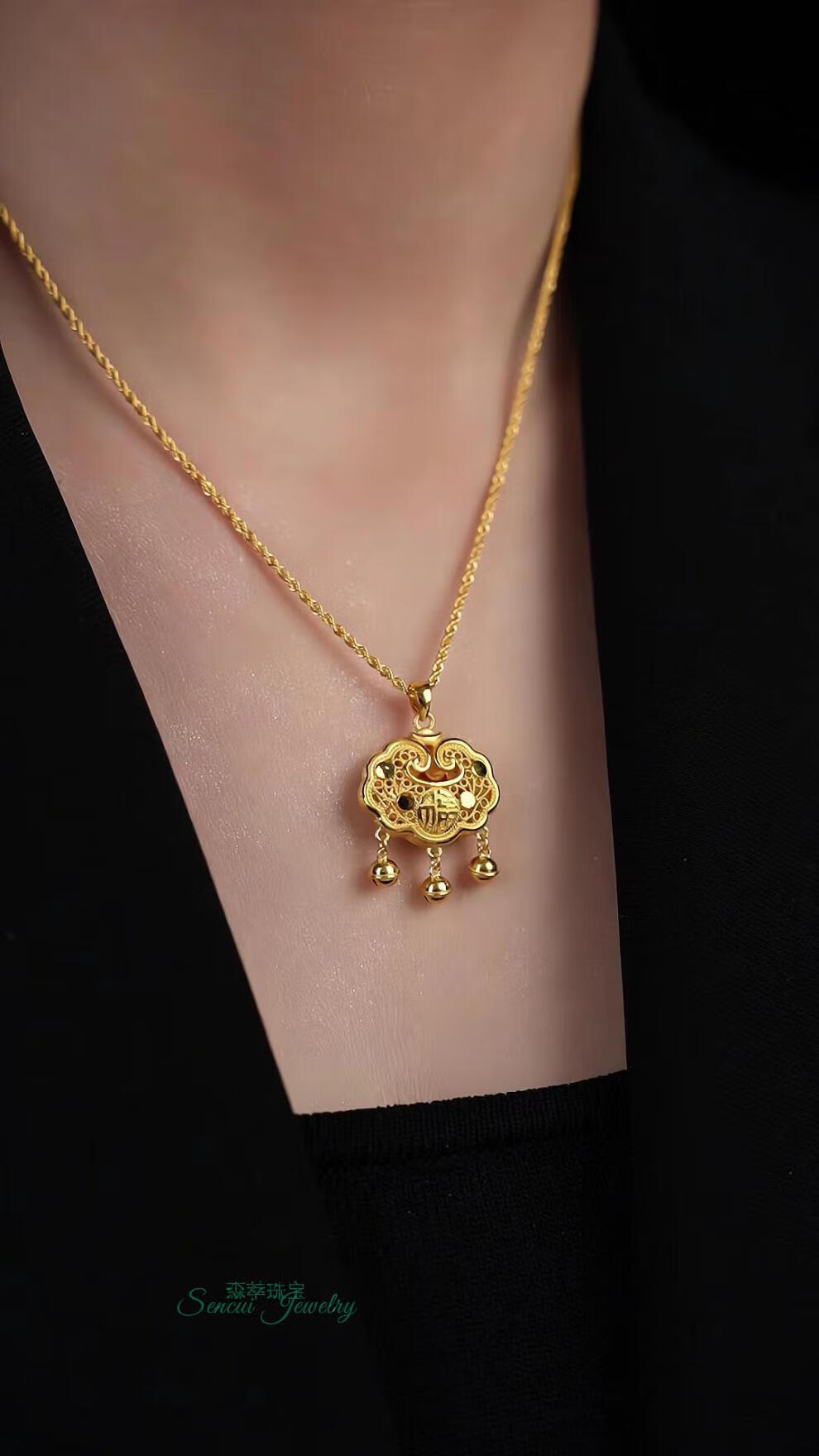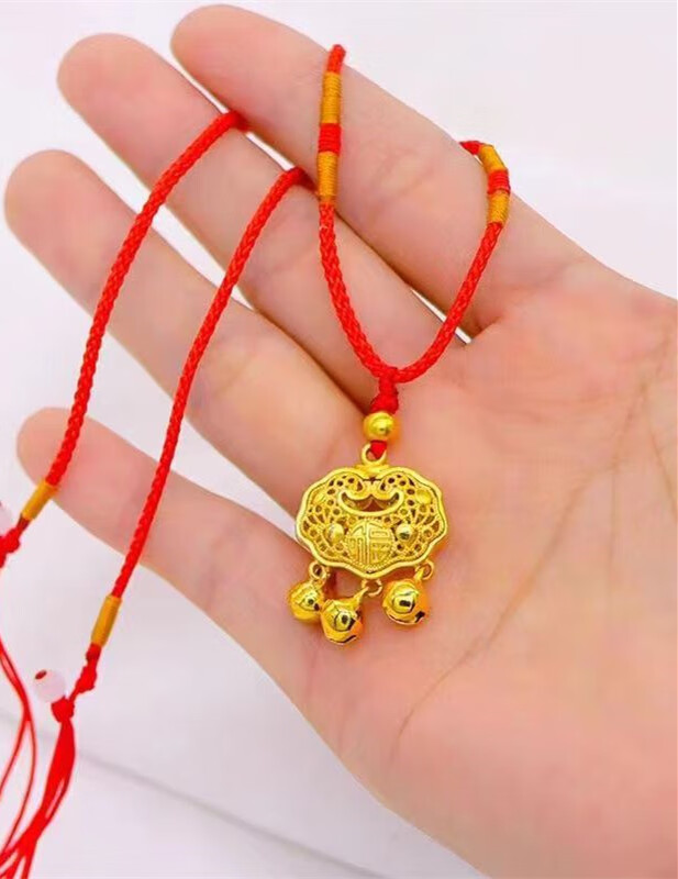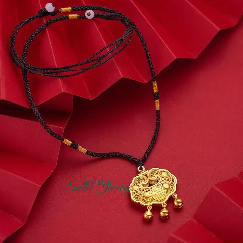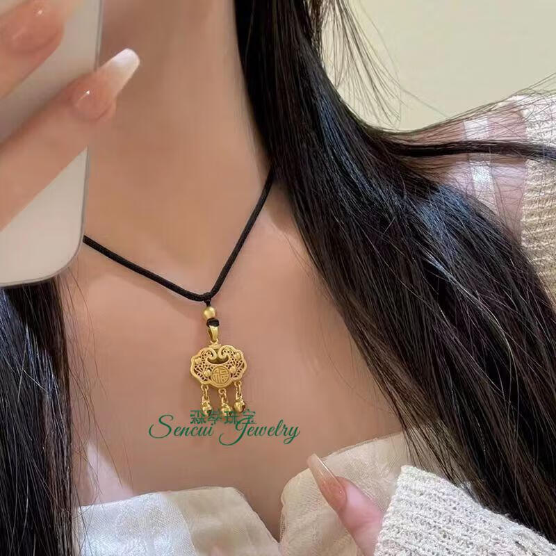 K gold longevity lock new style 18K yellow l gold women's longevity safety lock pendant baby lanyard gold 3D 18K6 gold beads black rope + longevity lock 18/K