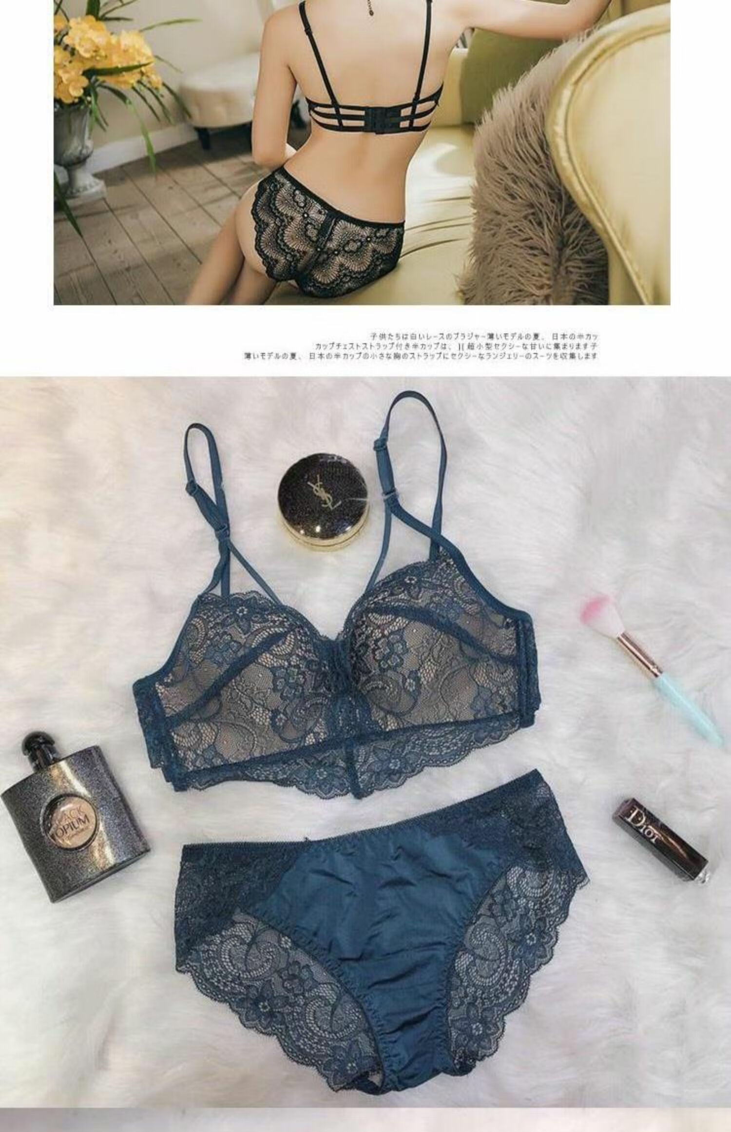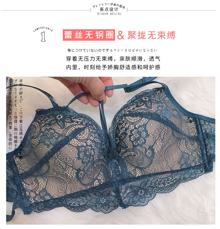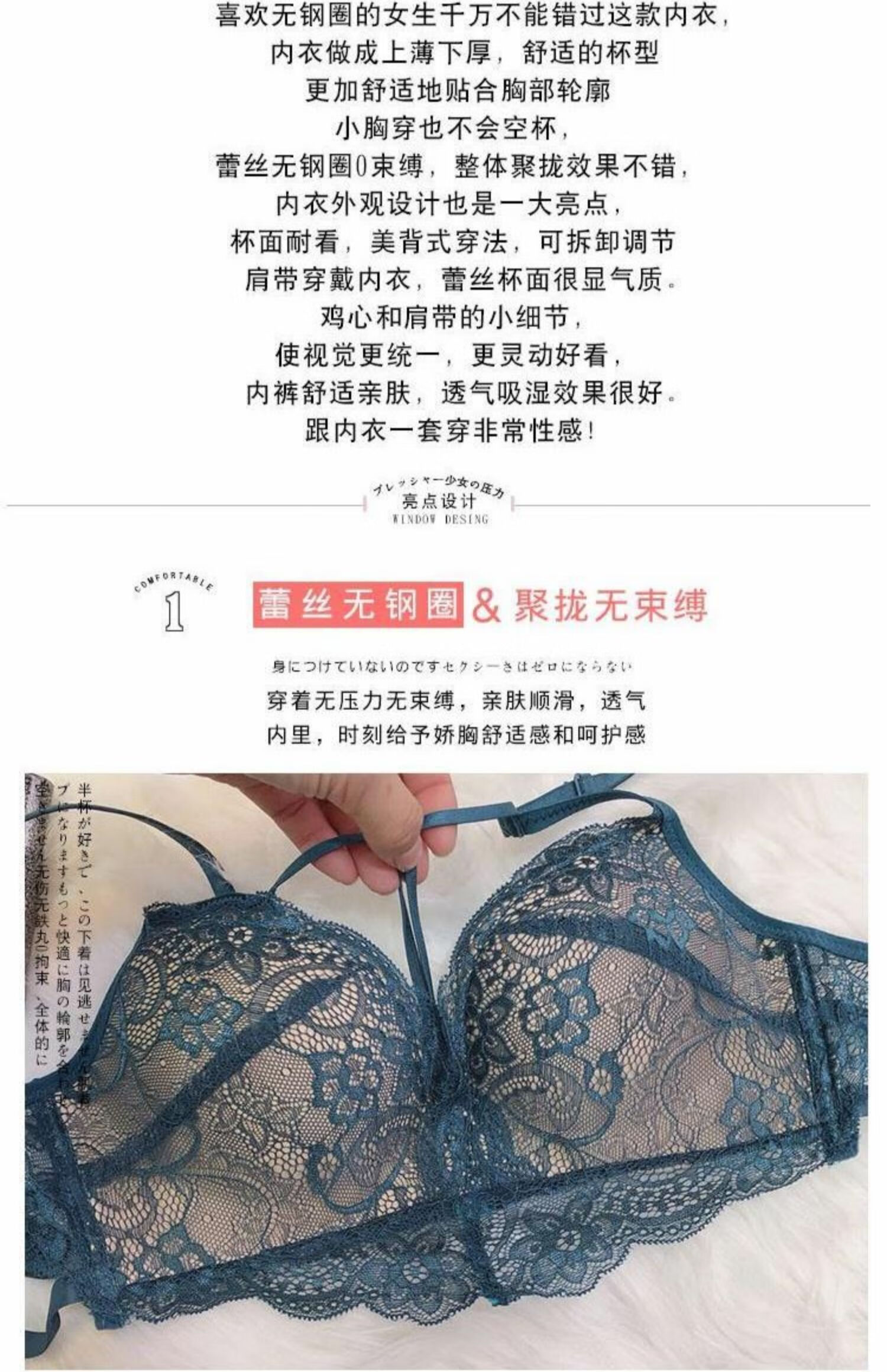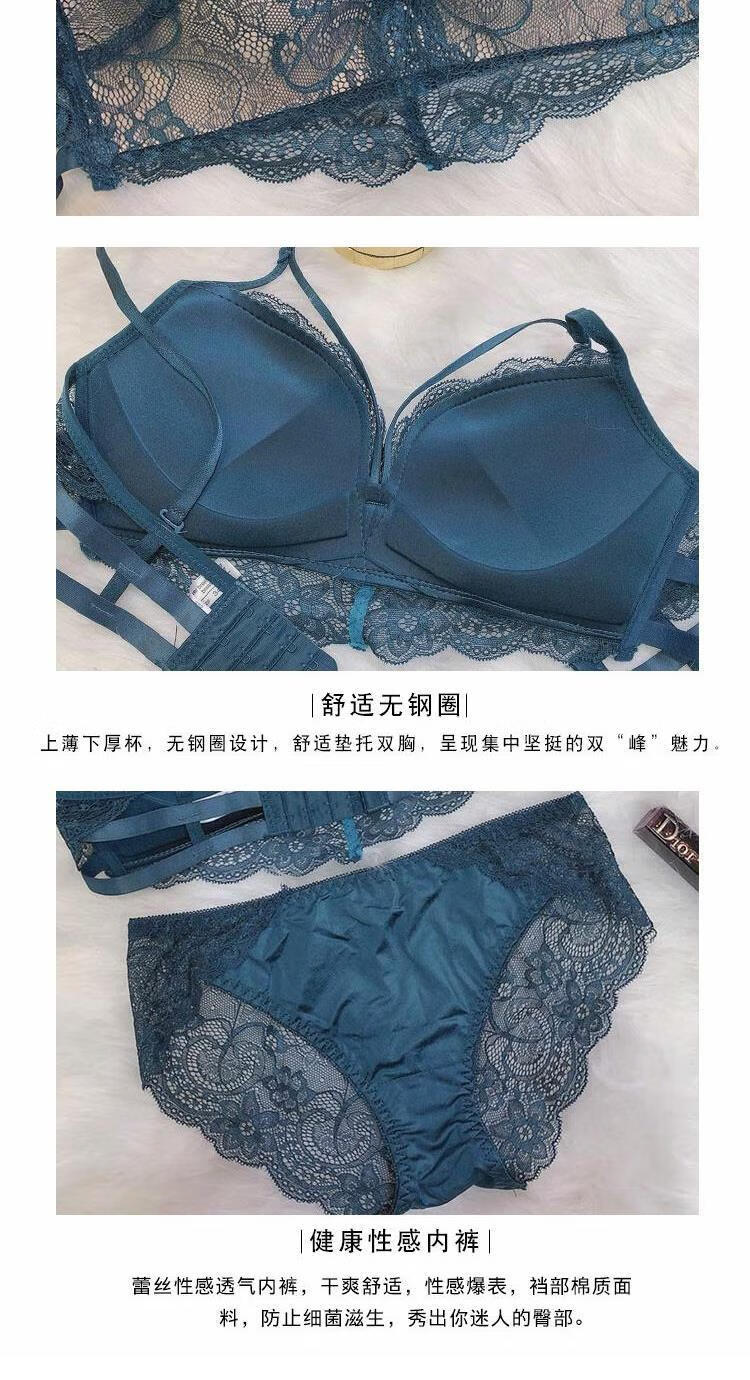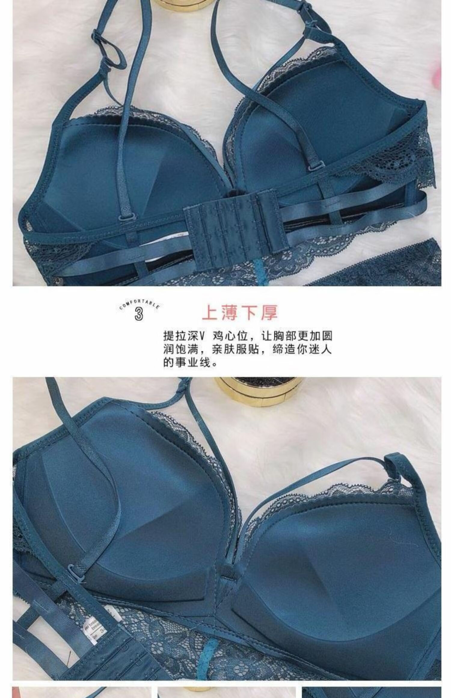 Aimu Autumn and Summer brand underwear for women without steel rings, small breasts, large push-up cup, thin sexy strappy lace bra set, green set 36/80B (thick version about 2CM)