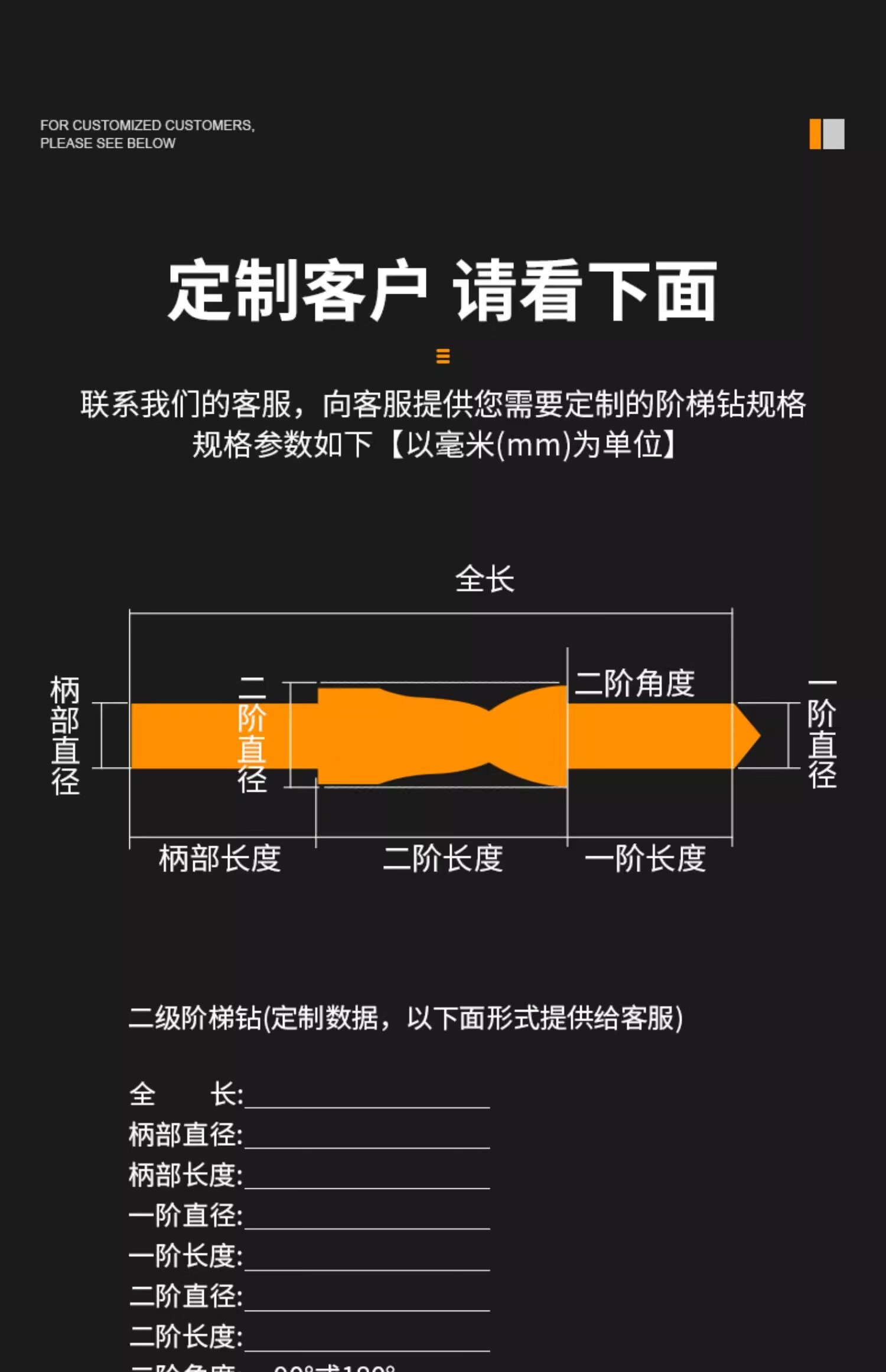 Broca escalonada secundaria Broca escalonada personalizada Acero inoxidable Diámetro variable Cabeza avellanada Agujero avellanado Expansión Subbroca Broca helicoidal Nitrurado M3 (3,4-6,5) 90 Diámetro del vástago 6,5 mm