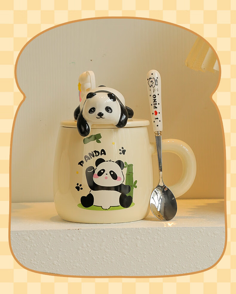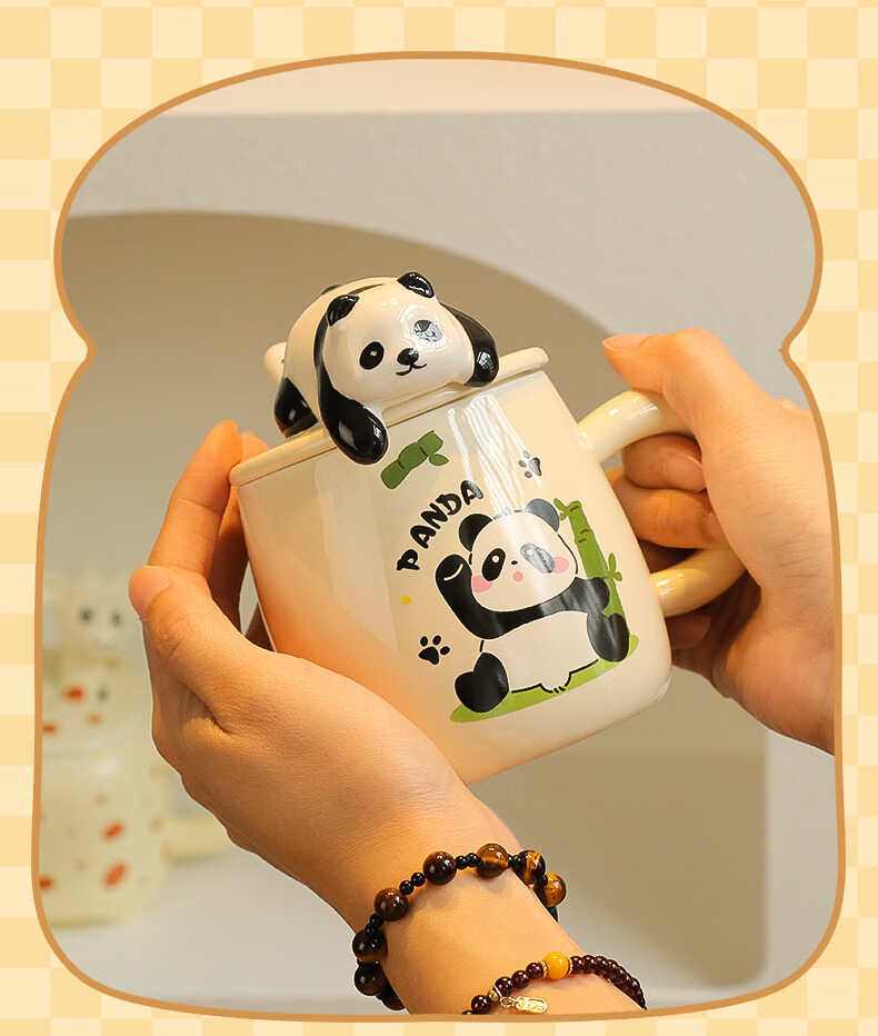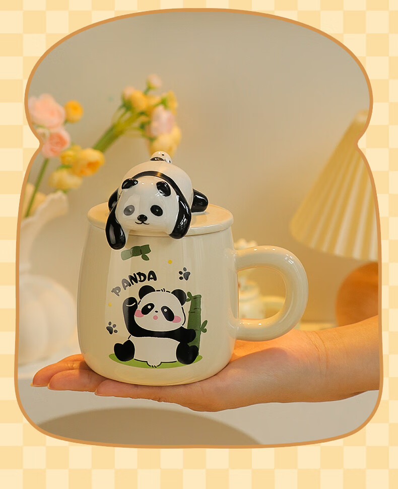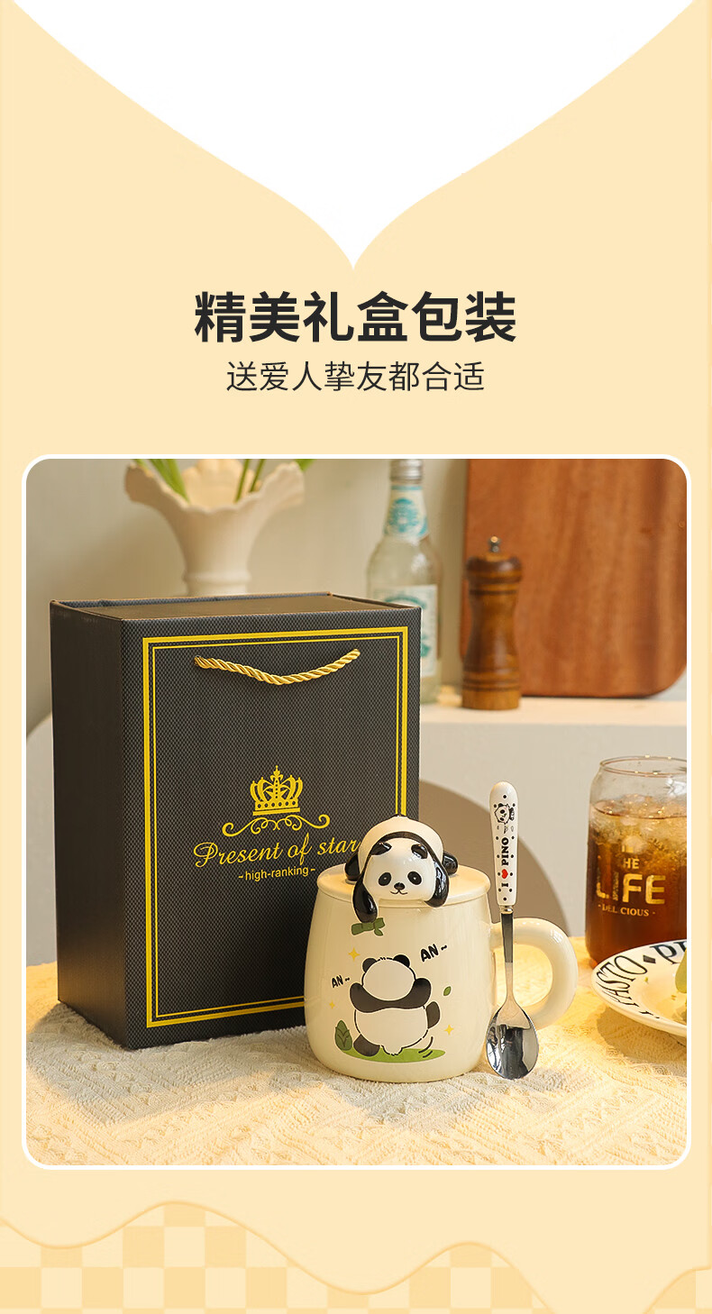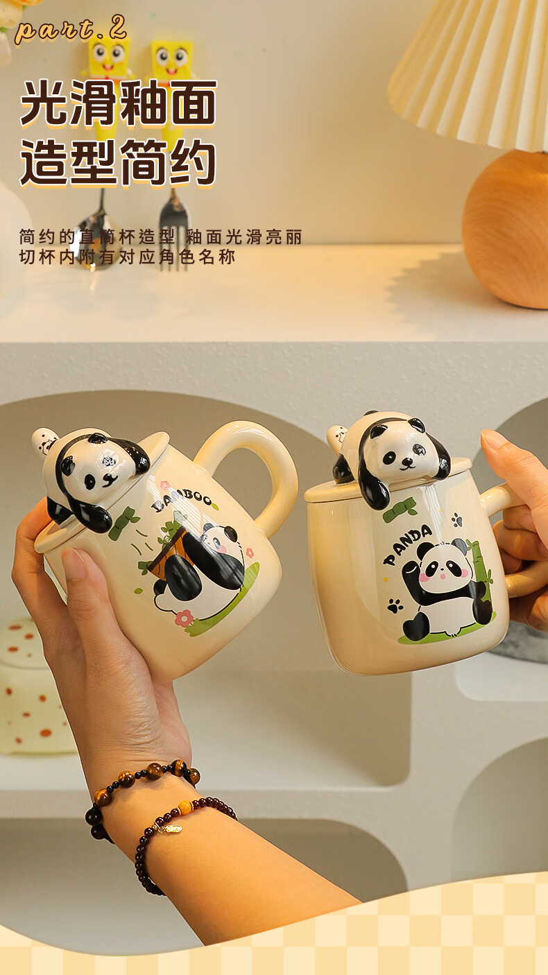 Busy farmer mug for girls, good-looking souvenir, ceramic mug with lid and spoon, panda birthday gift, cute gift box, giant panda (lid + exclusive spoon) sitting