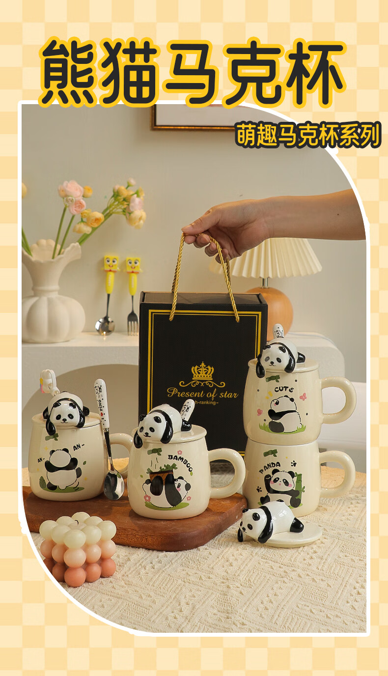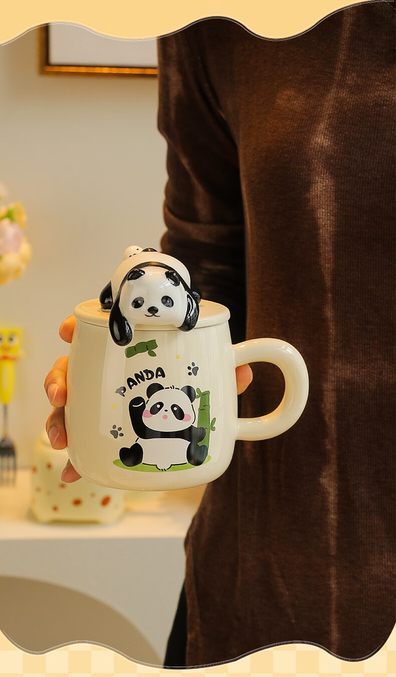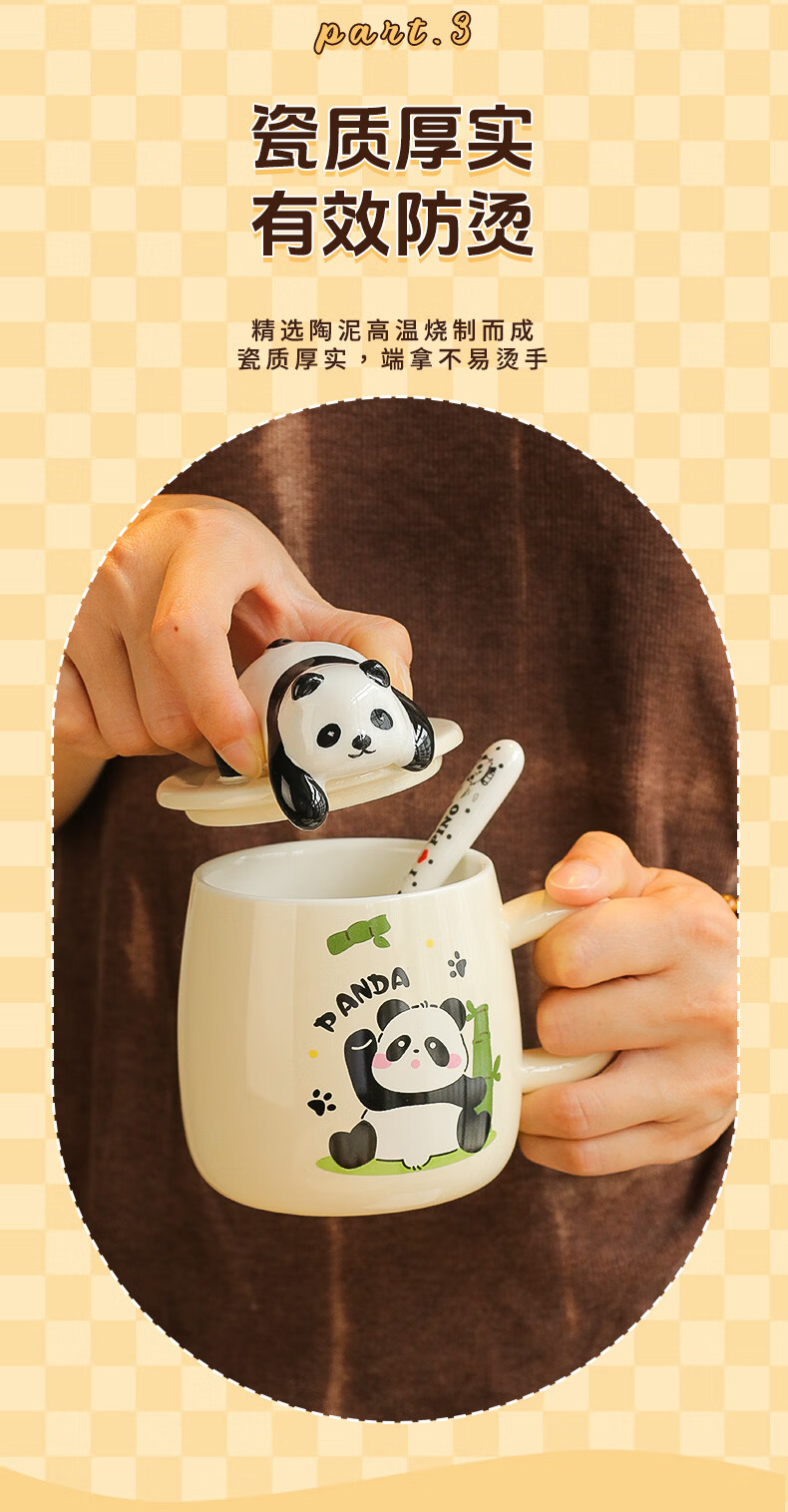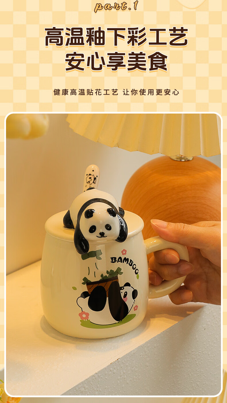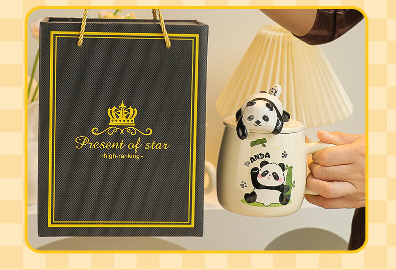 Busy farmer mug for girls, good-looking souvenir, ceramic mug with lid and spoon, panda birthday gift, cute gift box, giant panda (lid + exclusive spoon) sitting