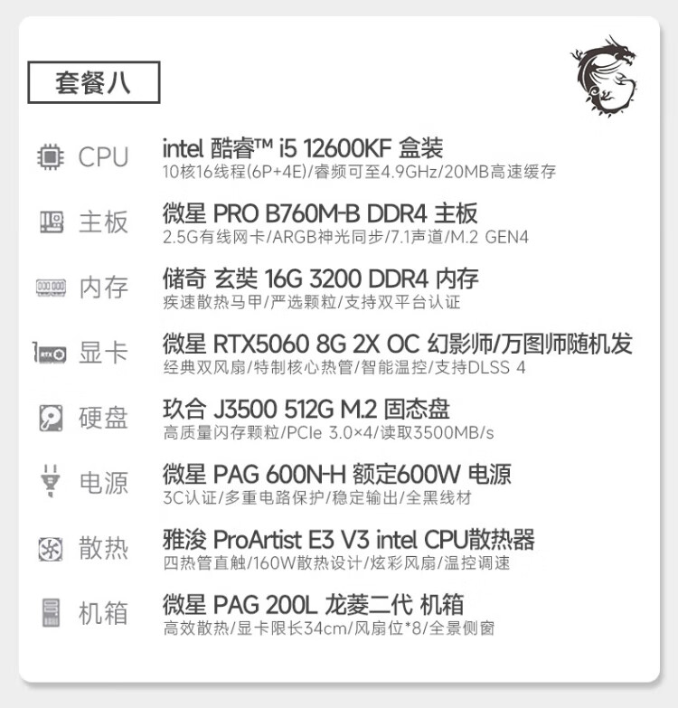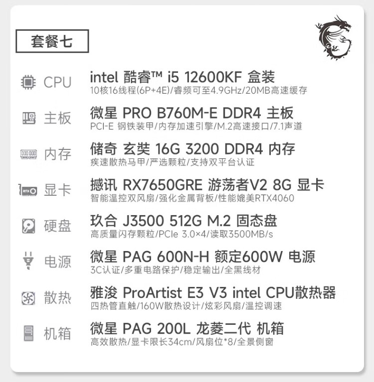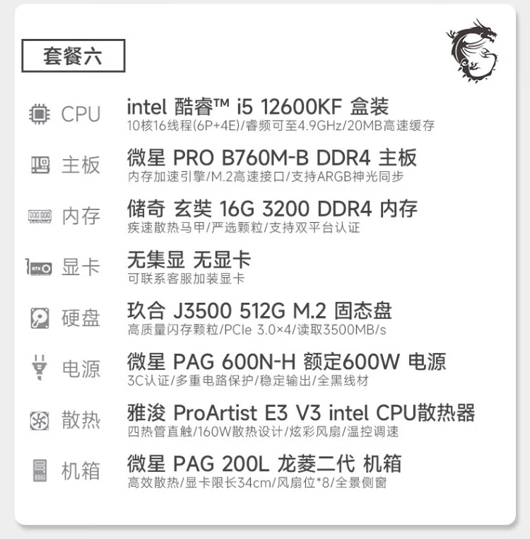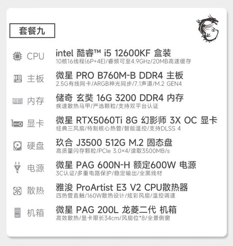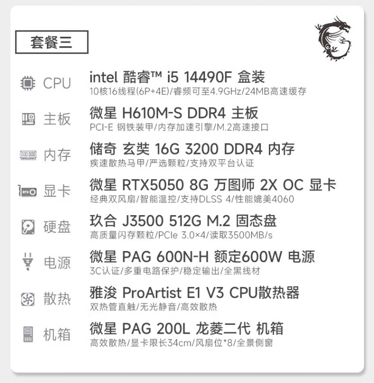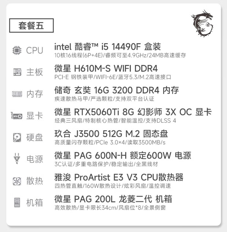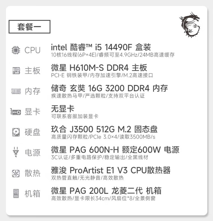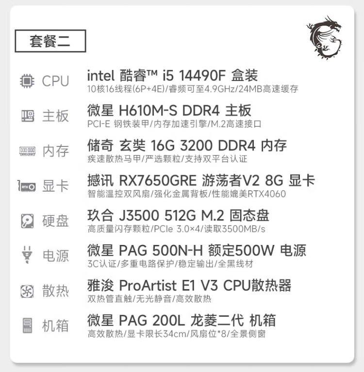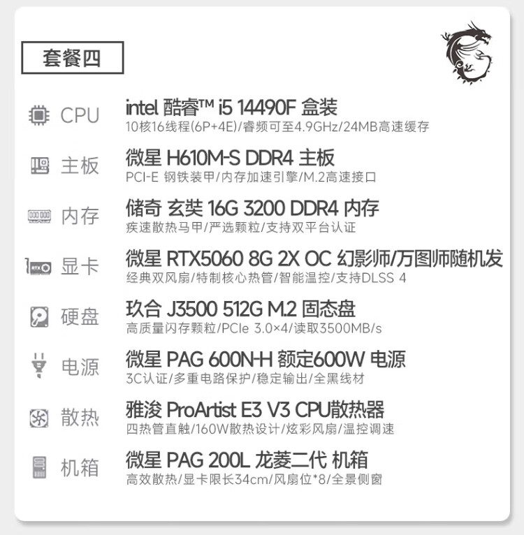 MSI Core i5 14490F/12600KF/5060Ti/7650GRE desktop assembly machine gaming e-sports fearless contract Delta mobile computer host DIY complete machine configuration 1 14490F box丨No graphics card