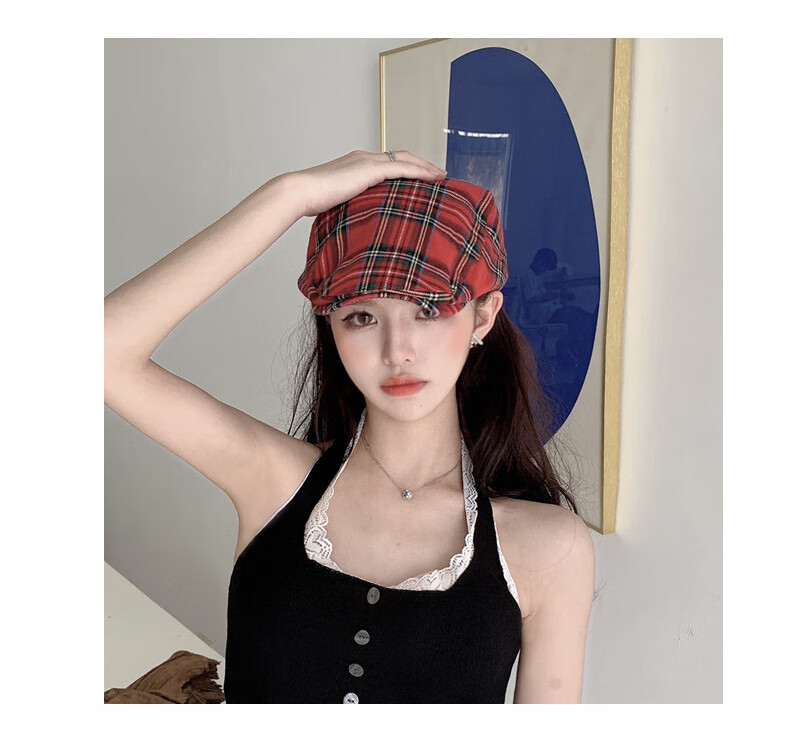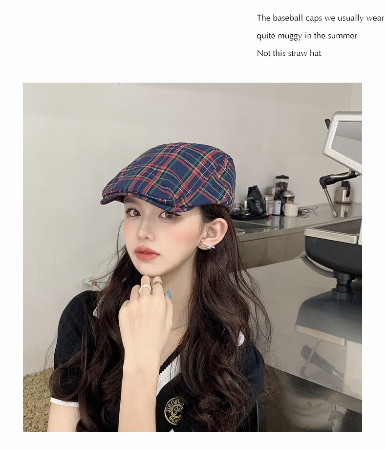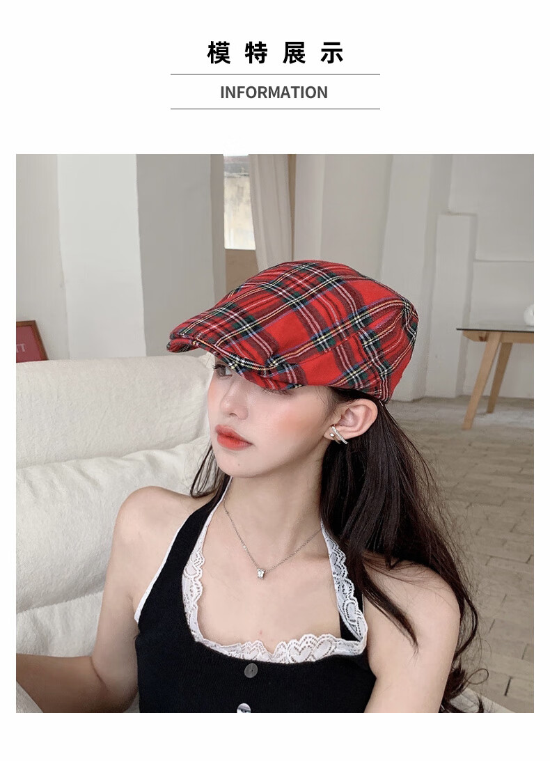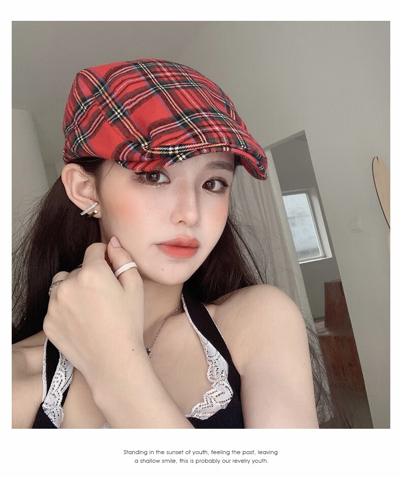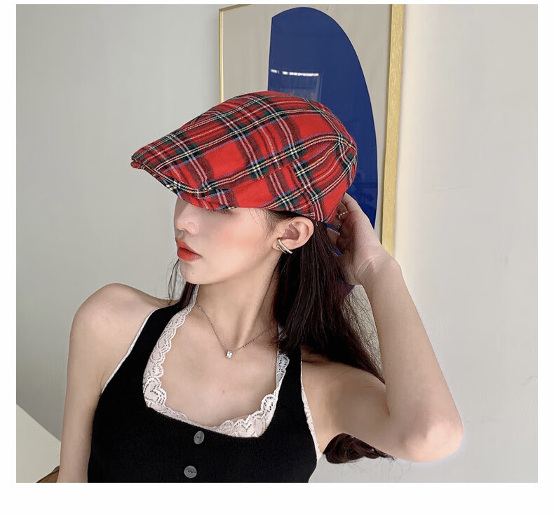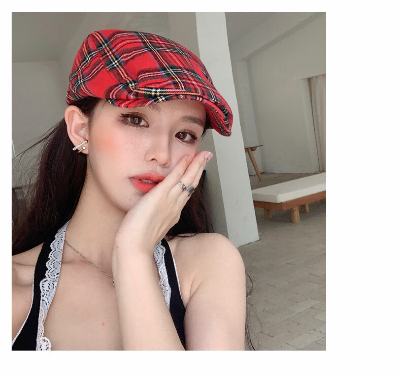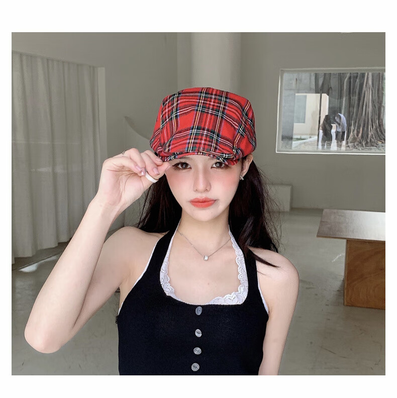 Lin Zhongxun Red Beret Summer Women's Plaid Hat 2024 New Thin British Retro Progressive Hat Red One Size (55-58cm)