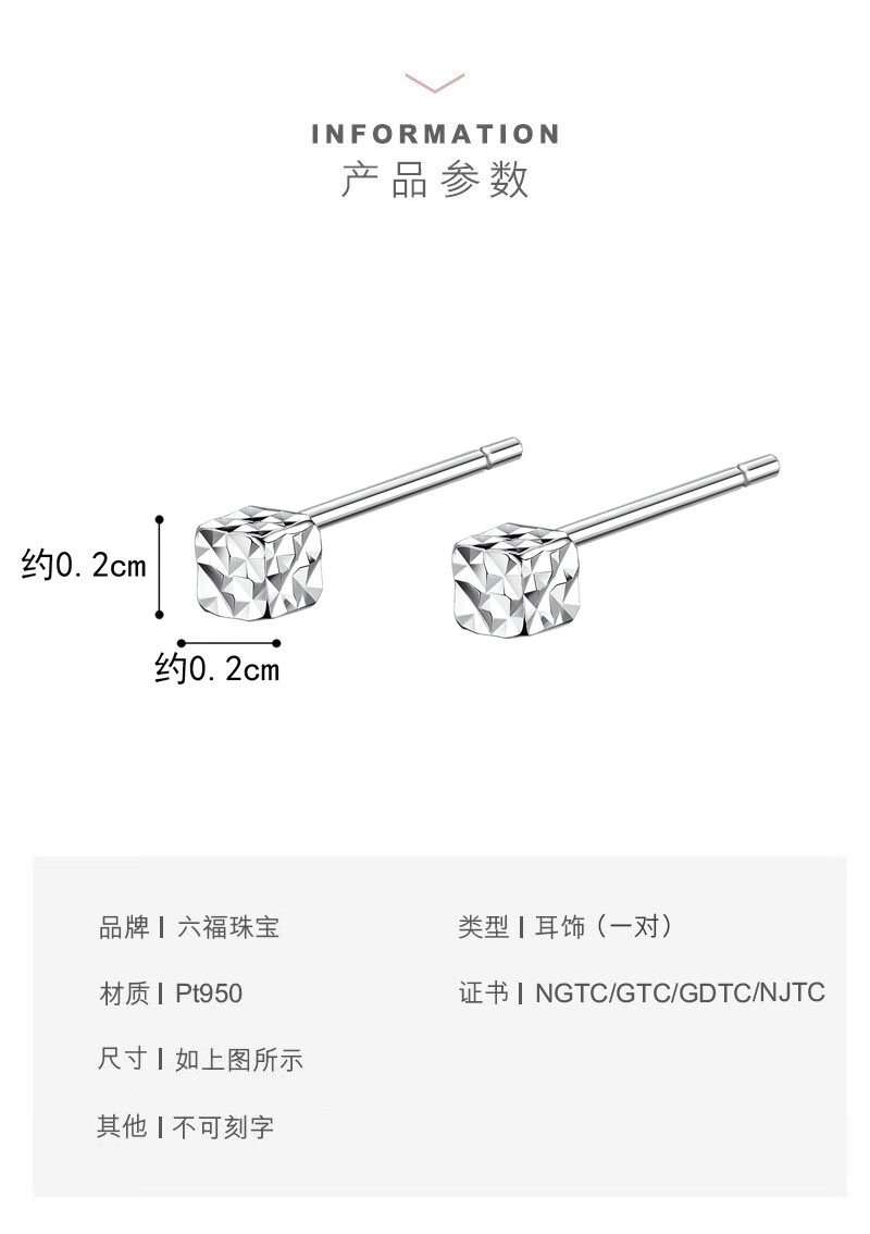 Lukfook Jewelry Platinum 950 Small Sugar Cube Platinum Stud Earrings Price L04TBPE0012 1.21g (including labor cost 113 yuan) with silicone ear plugs