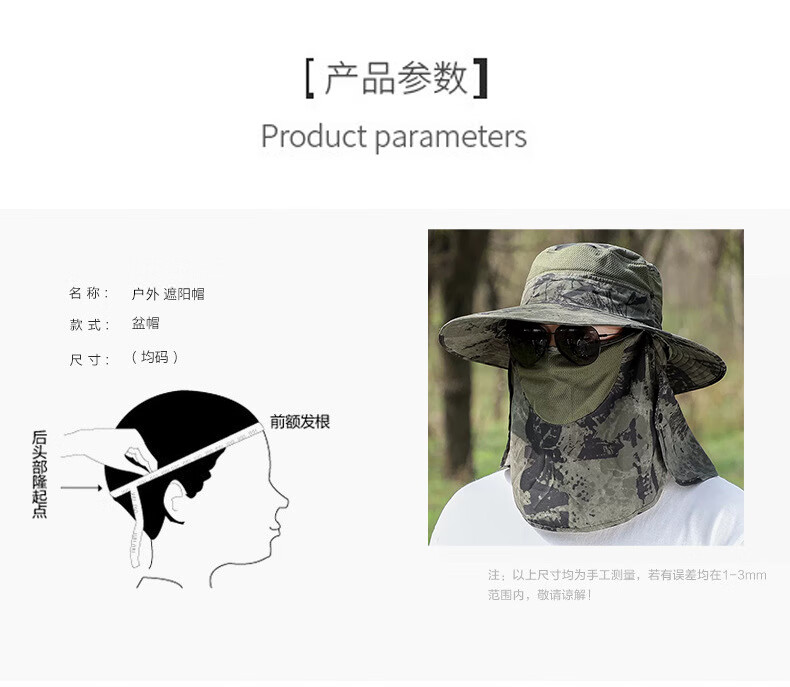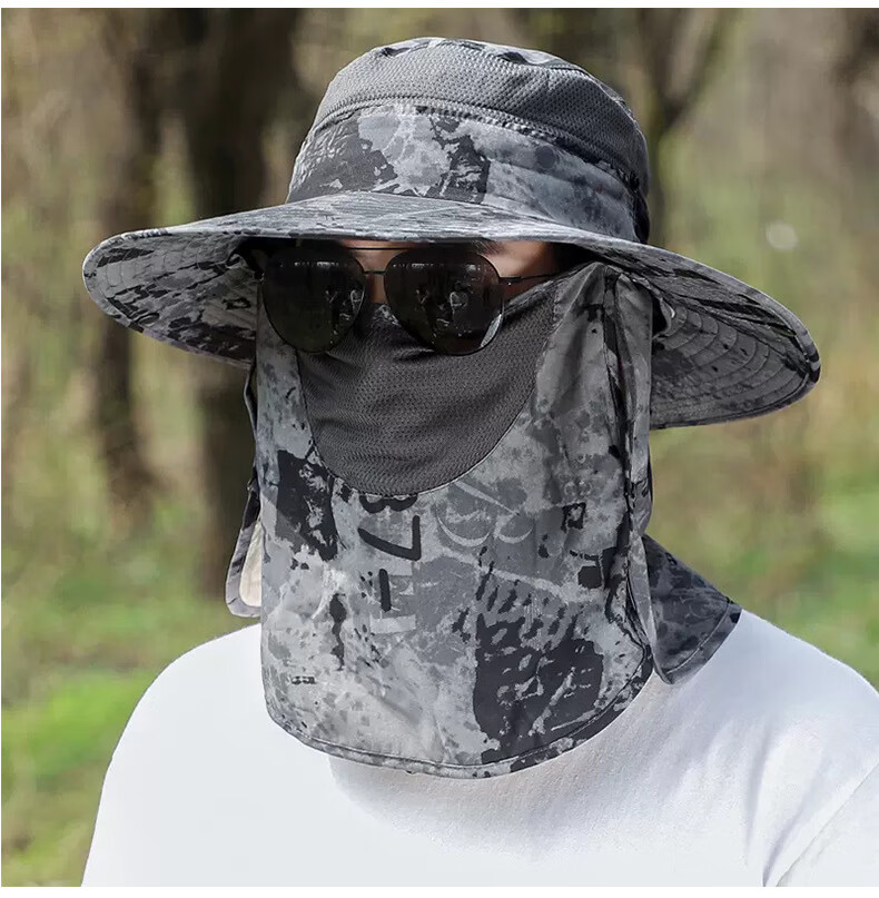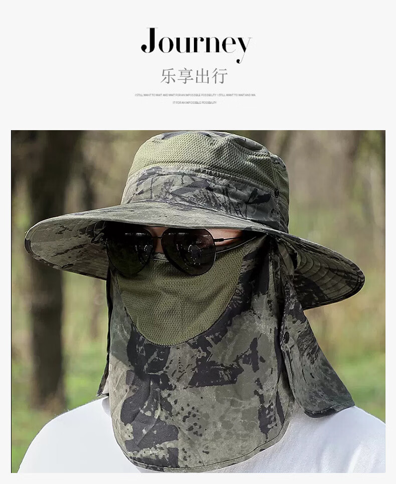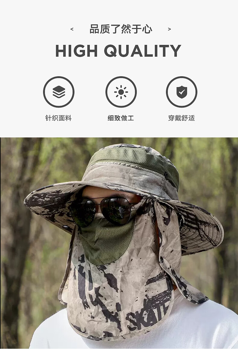 Manqi Meiya sun protection hat men's fishing sun protection mask summer large brim fisherman hat mountaineering sun hat outdoor straw hat sun hat military green camouflage one size