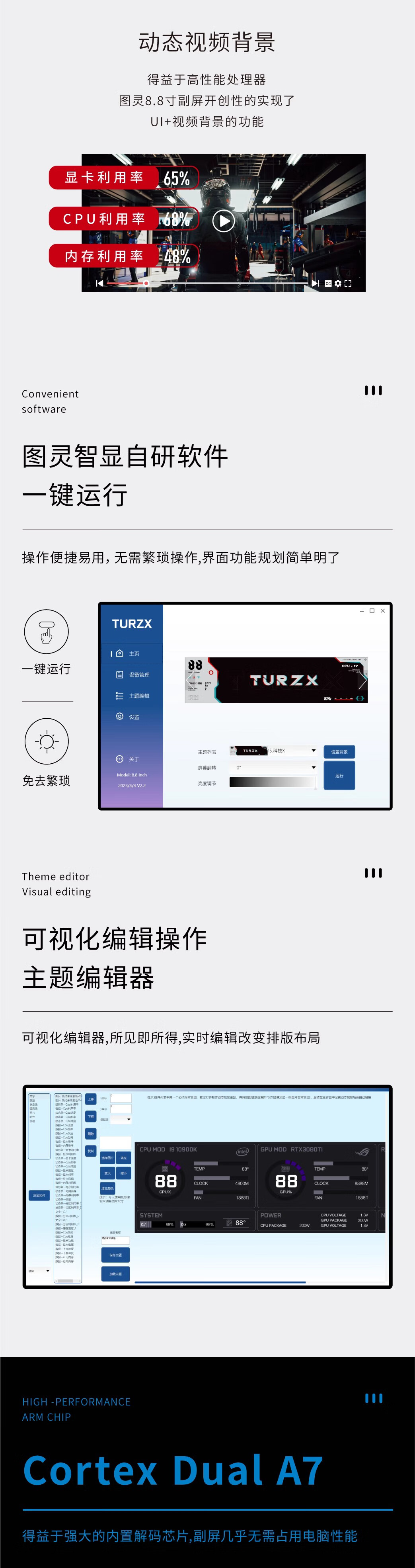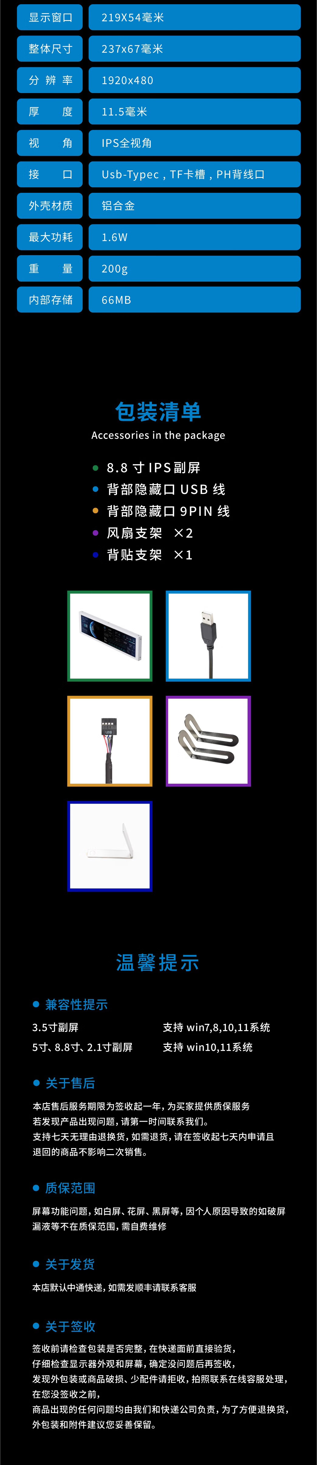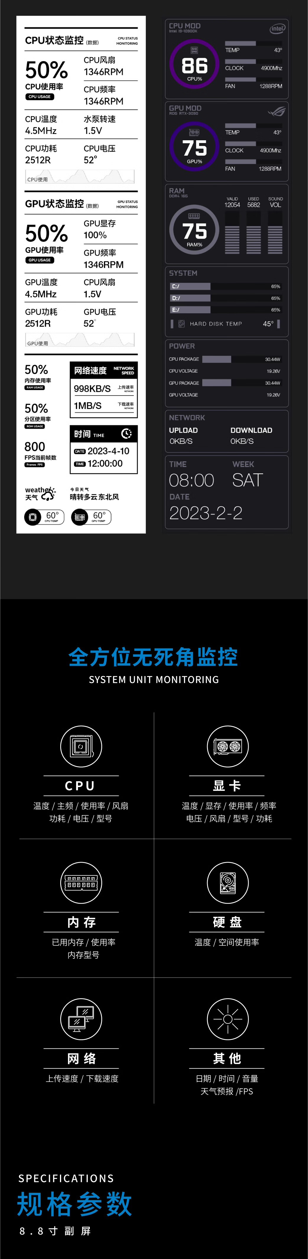 SCHHV Turing Intelligent Display 8.8-inch IPS Chassis Secondary Screen Computer Monitoring Status Type C USB Secondary Screen AIDA64-Free 8.8-inch White Model