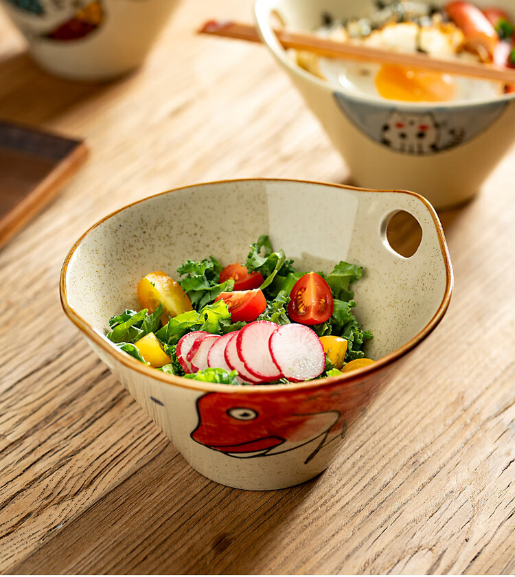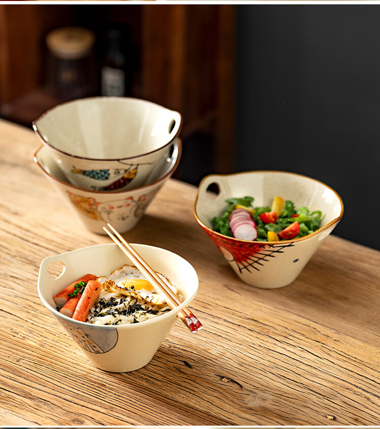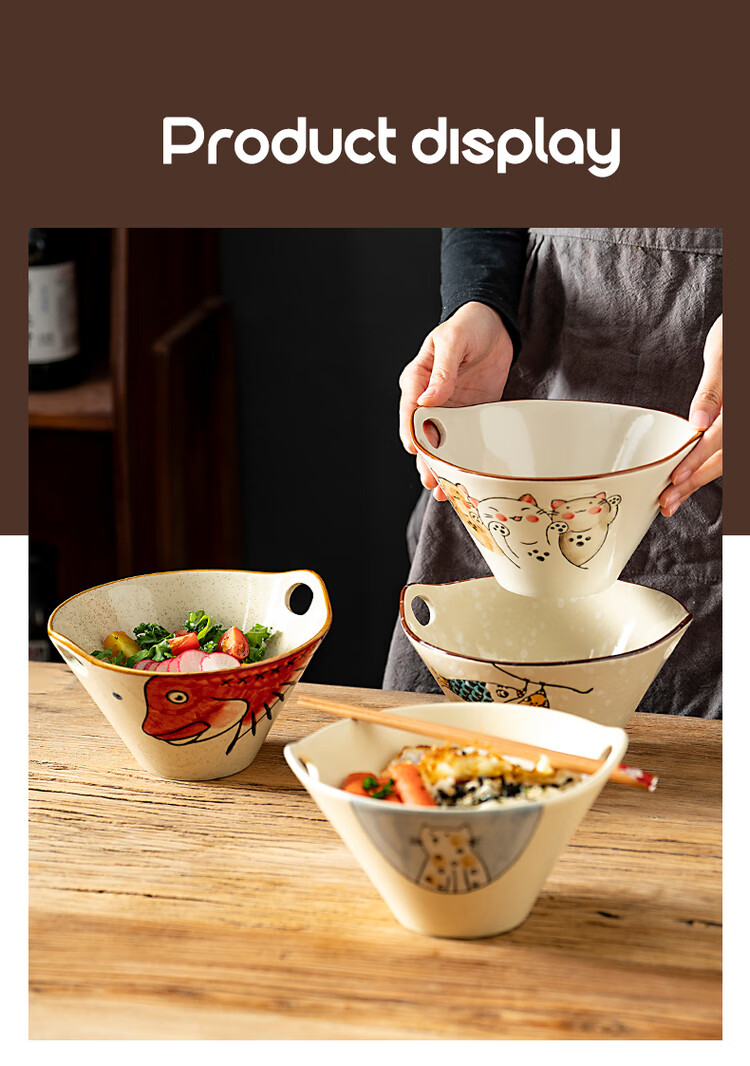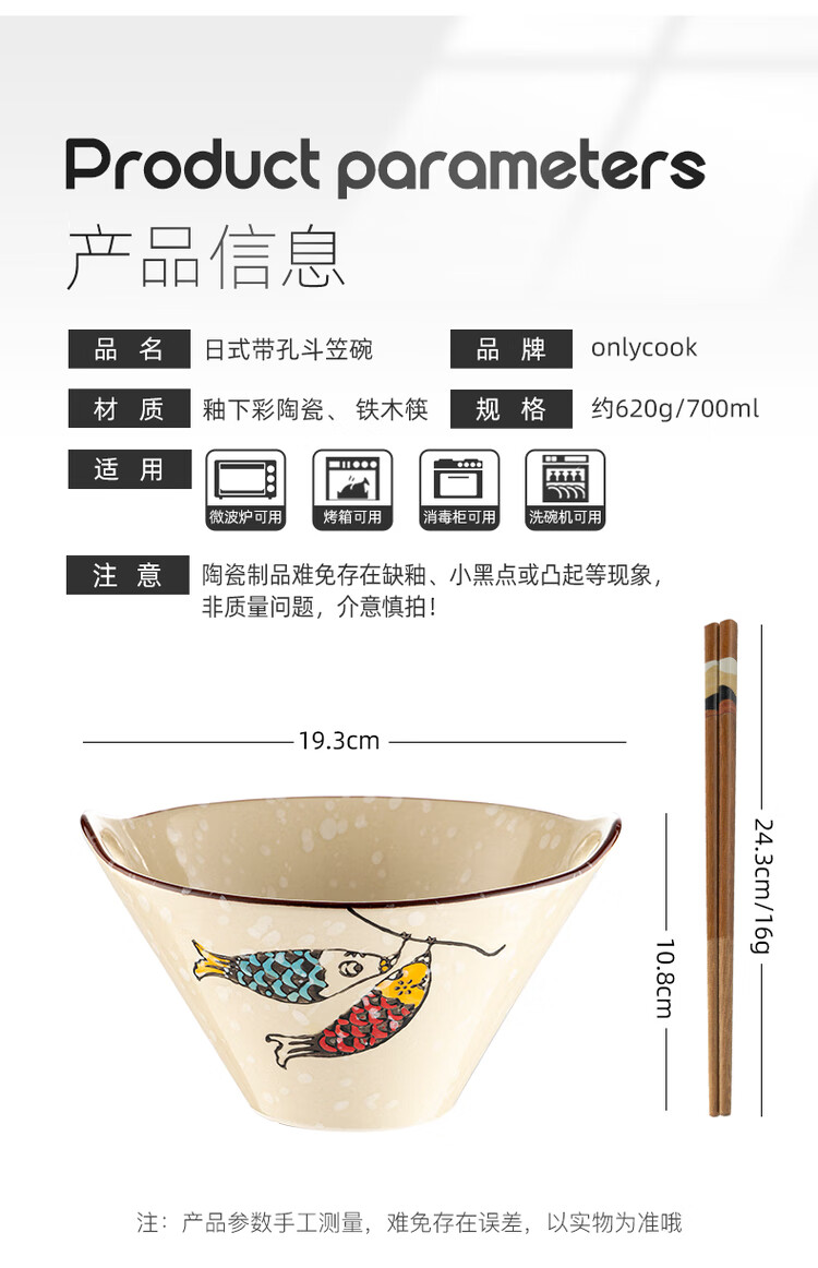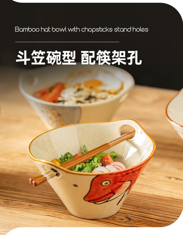 BOMP ceramic holed bamboo hat bowl Japanese retro ramen bowl underglaze color instant noodle bowl cold vegetable noodle bowl red head fish