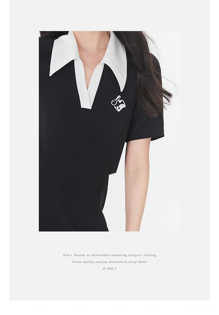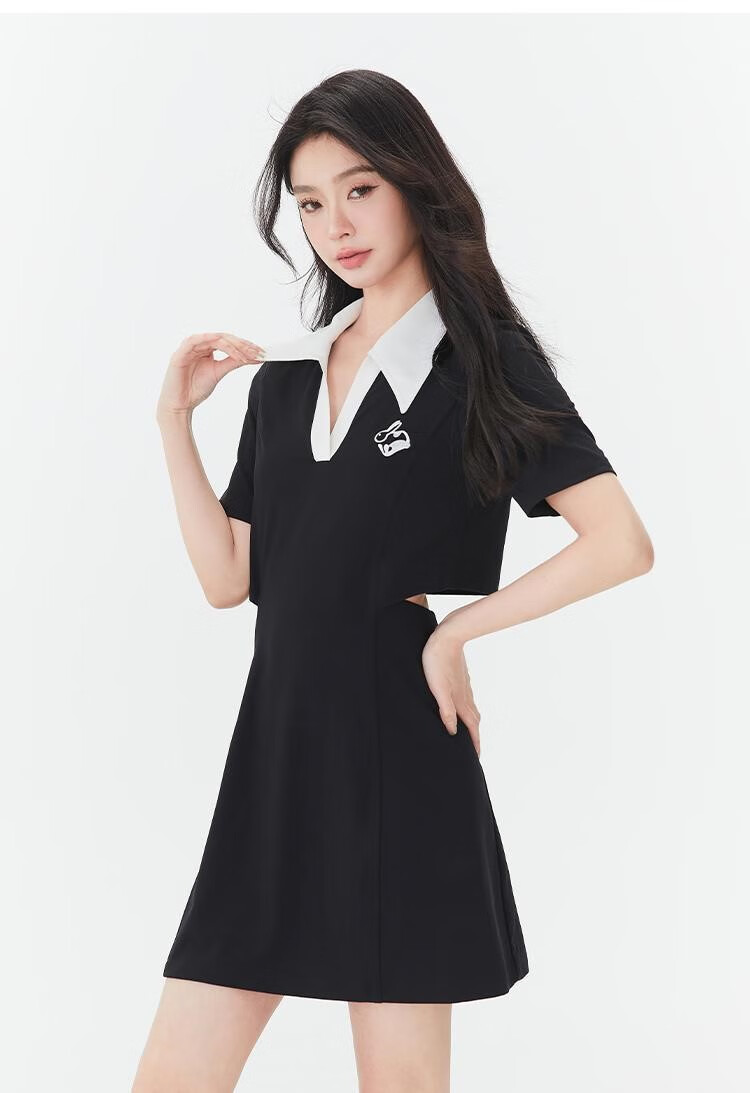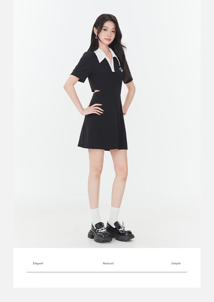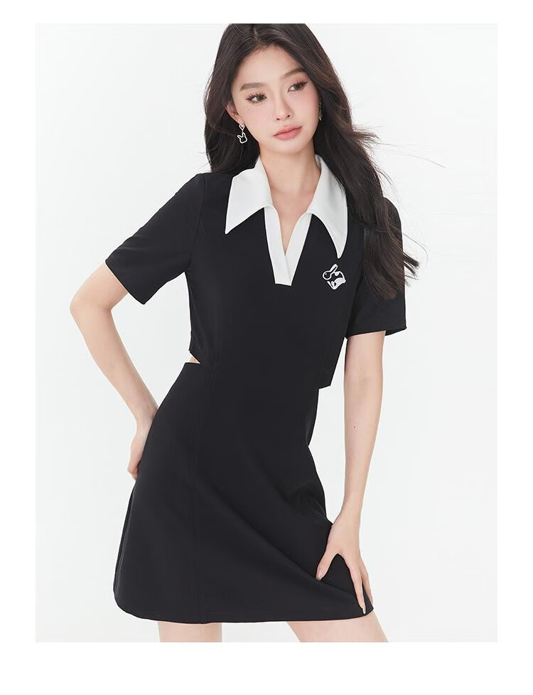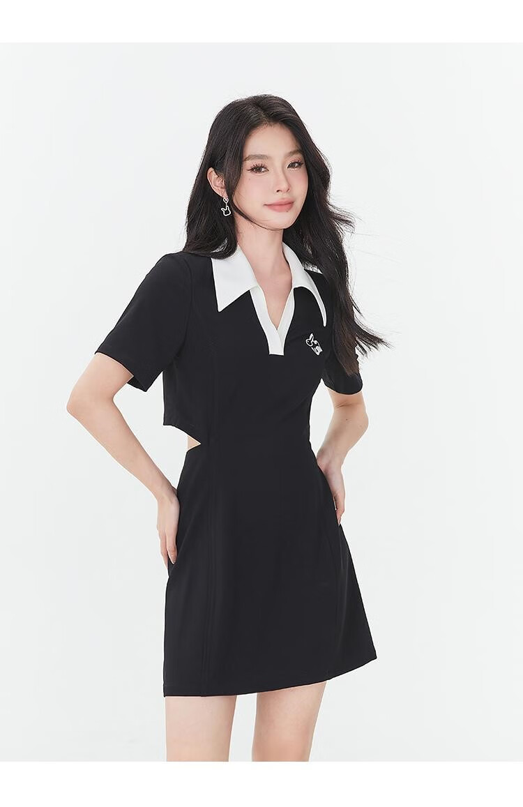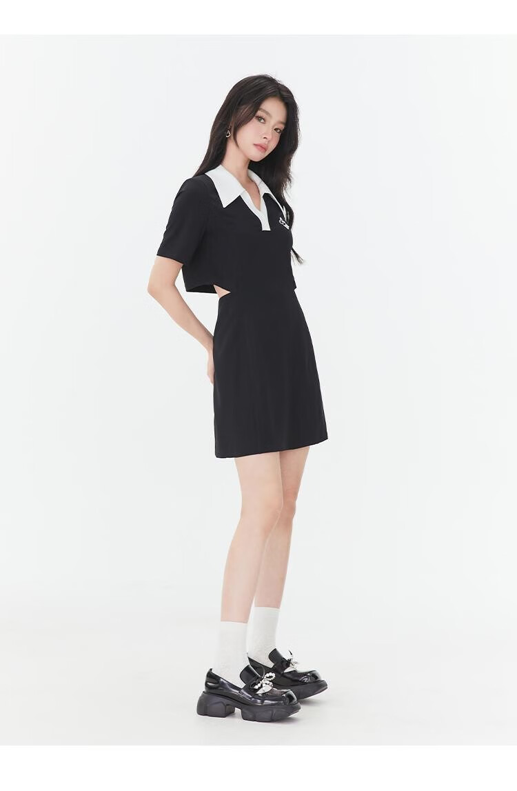 Fantu Fantu Casual Slim Contrast Color Polo Neck Hot Girl Dress Women 2023 Summer New Style Revealing Waist Hollow Design Black S