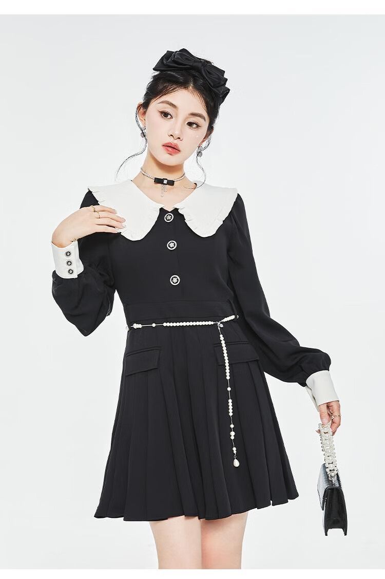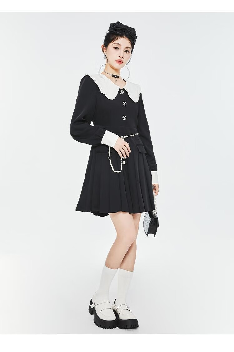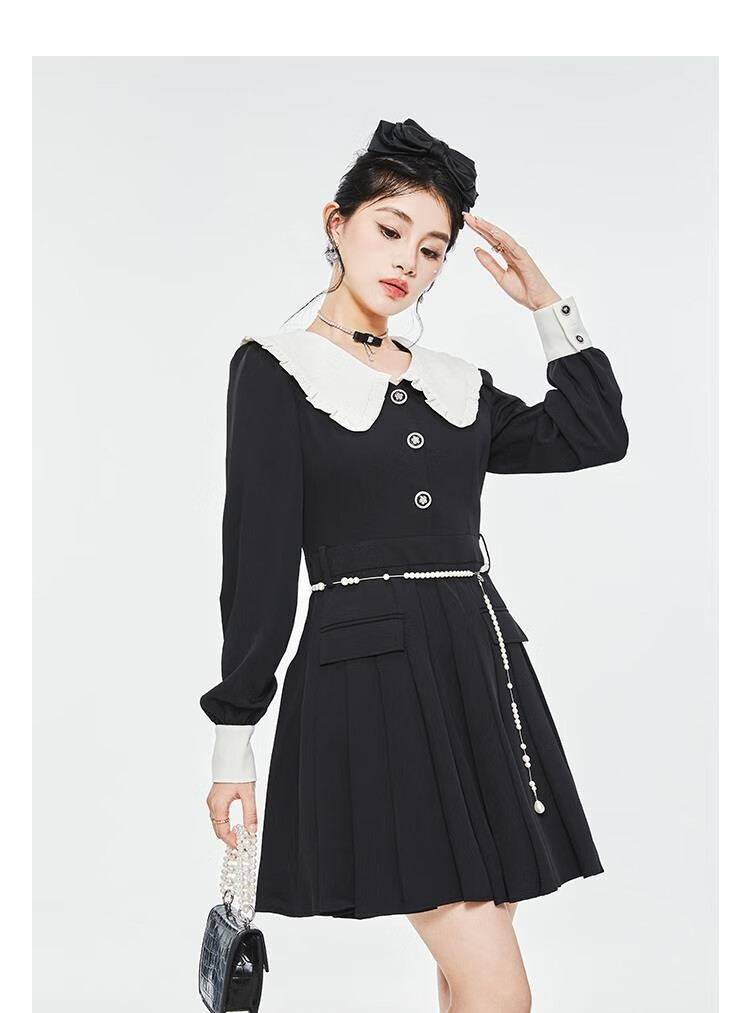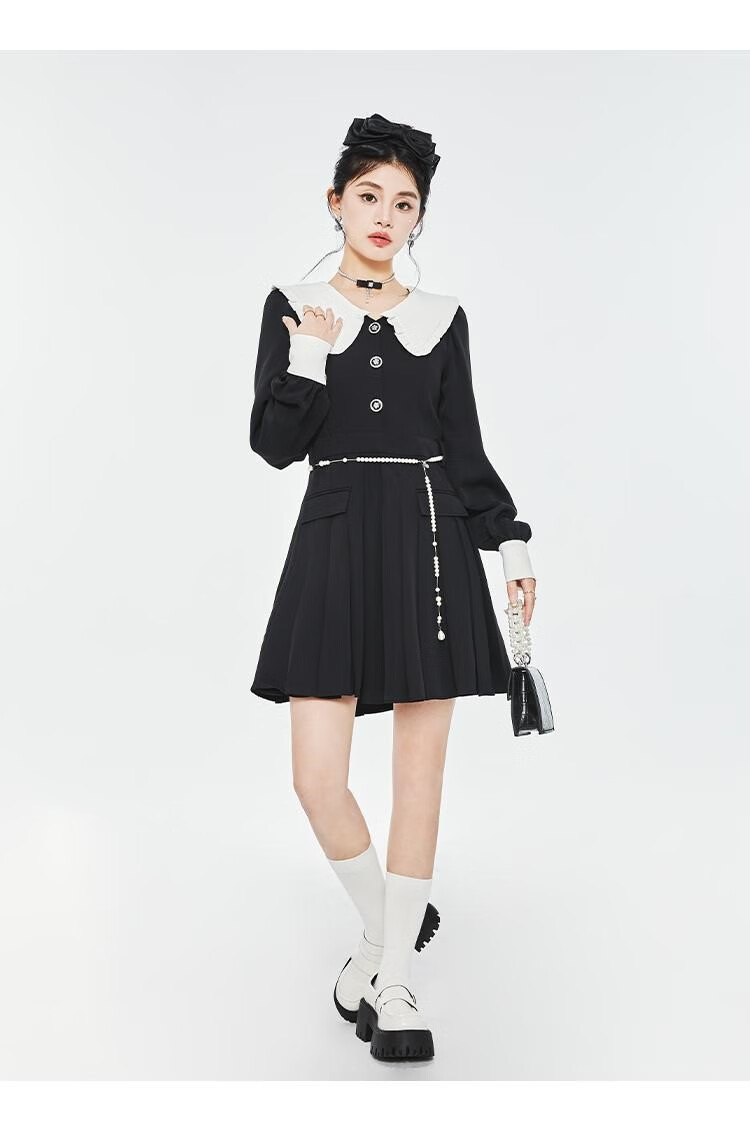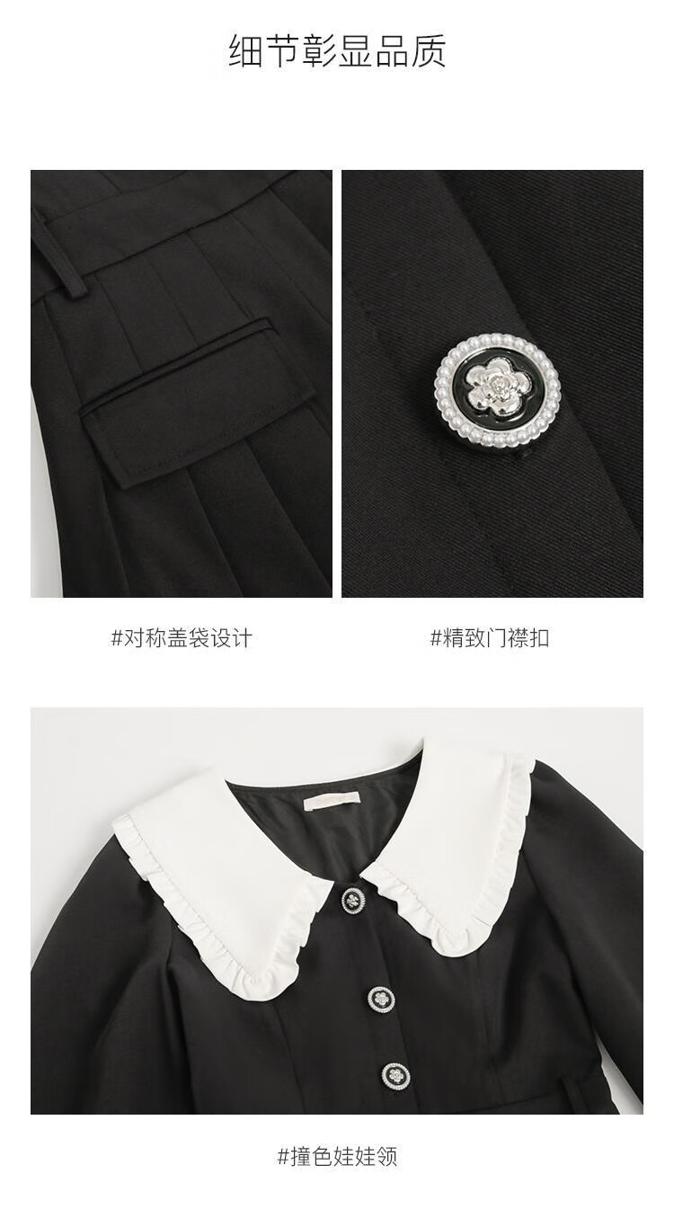 Fantu College Style Suit Lace Collar Dress 2024 Autumn New Slim Design Black Pleated Skirt Women Black S