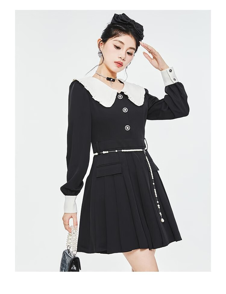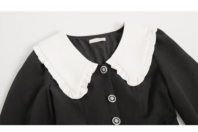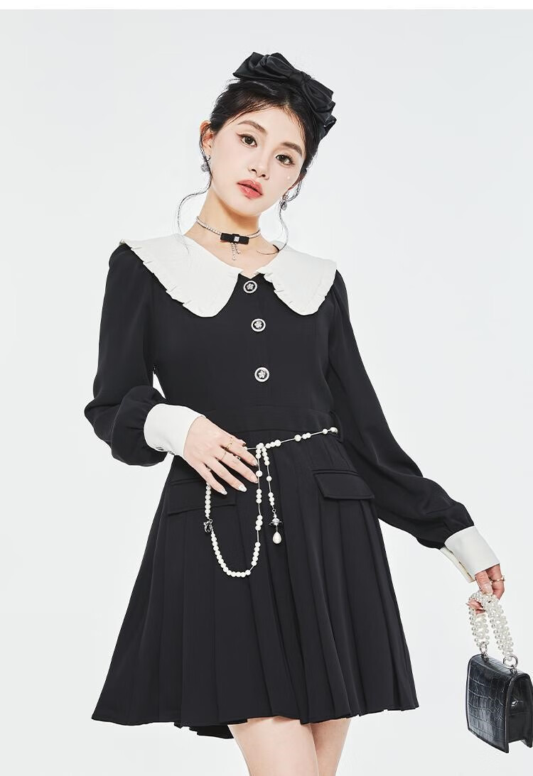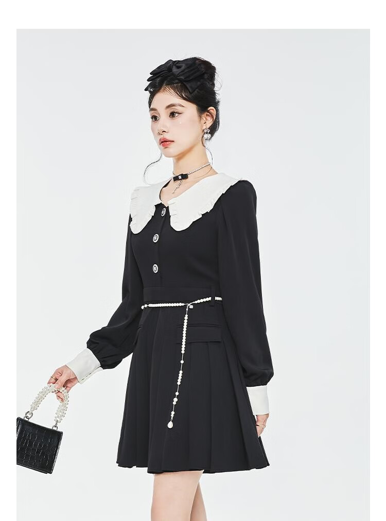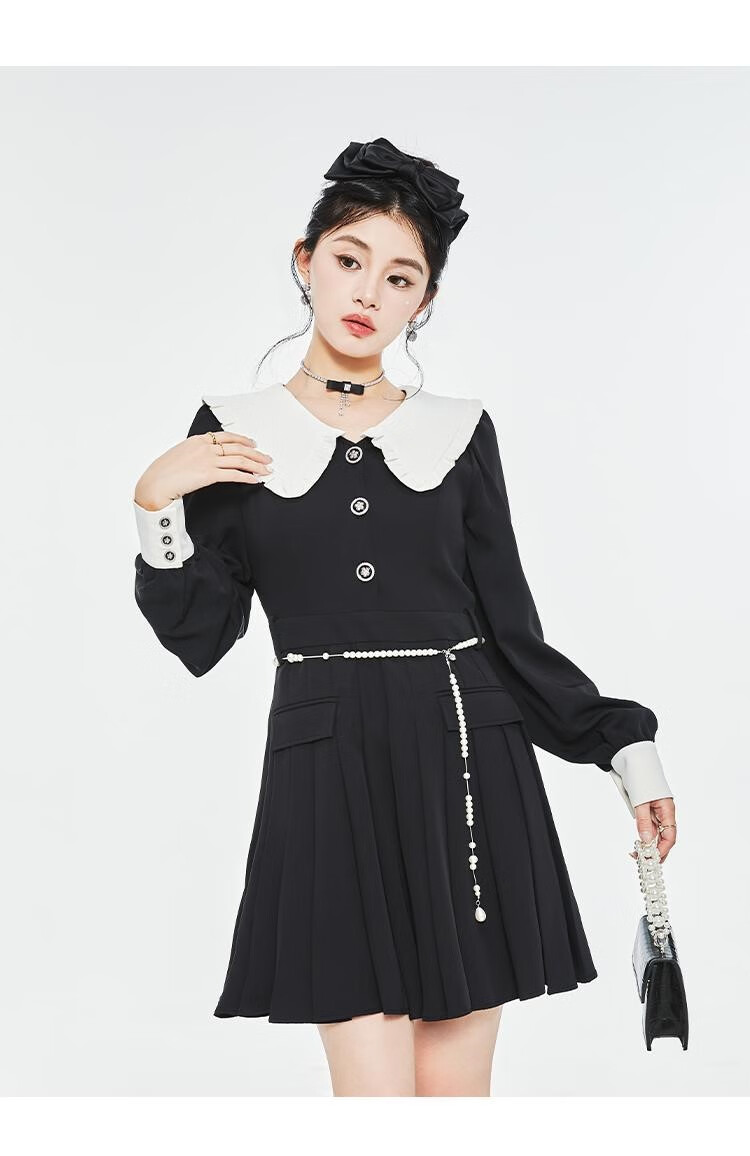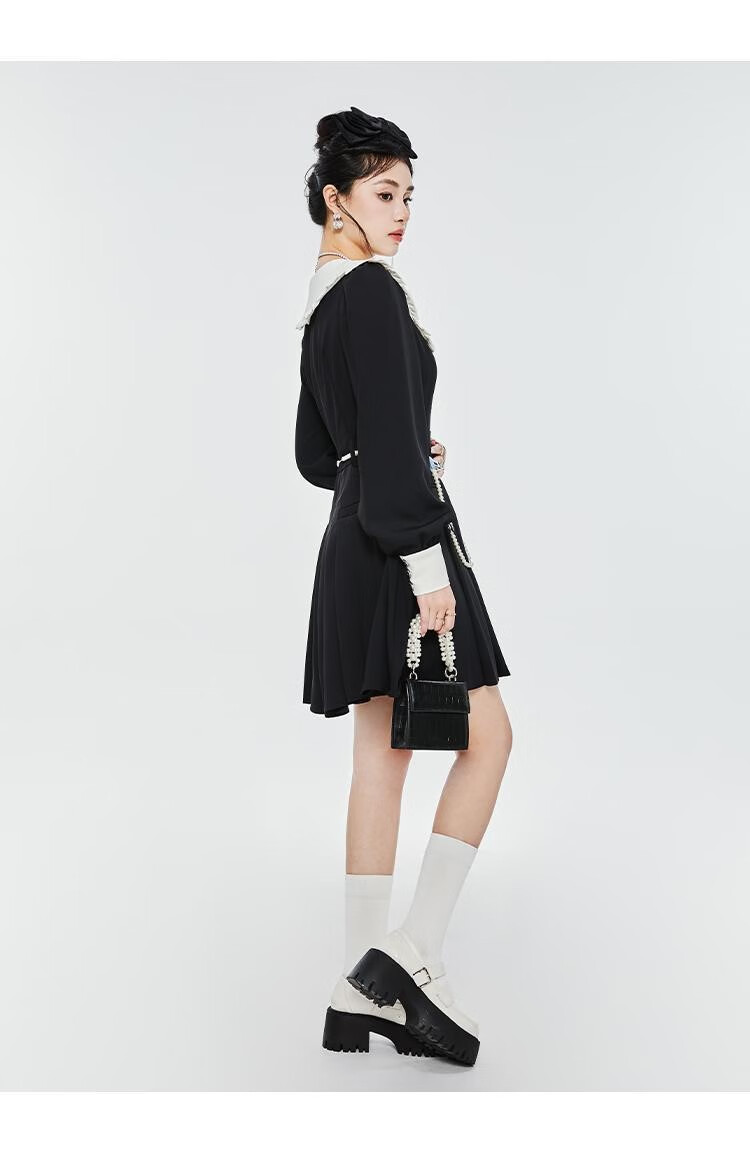 Fantu College Style Suit Lace Collar Dress 2024 Autumn New Slim Design Black Pleated Skirt Women Black S