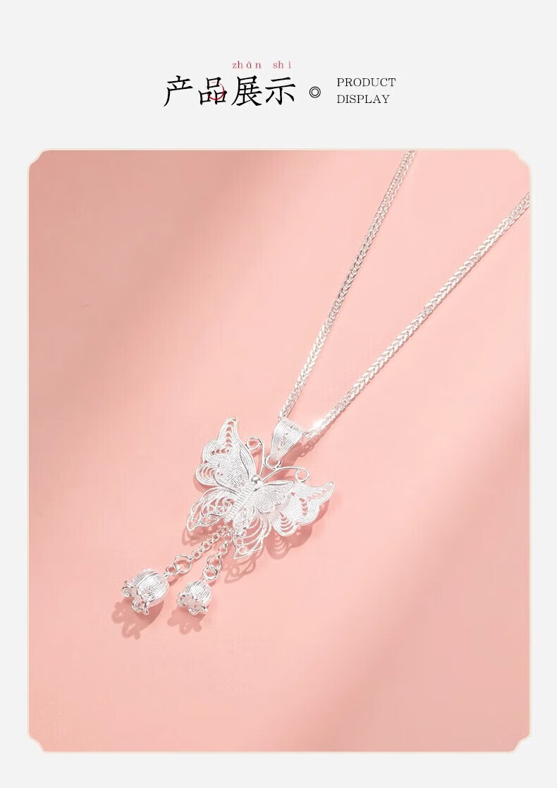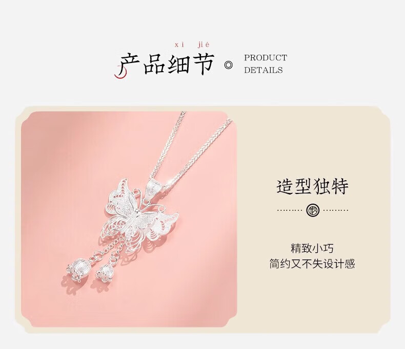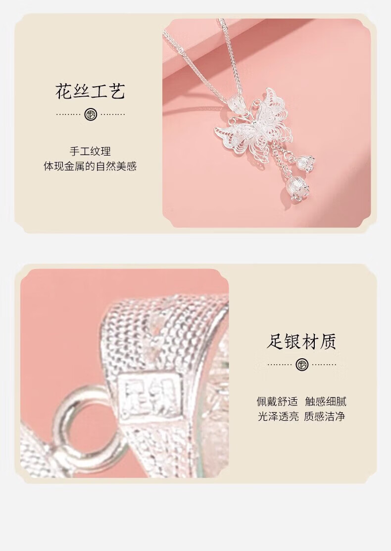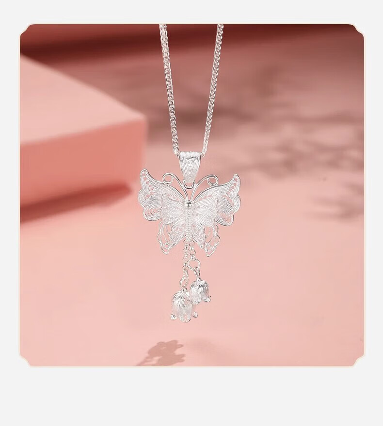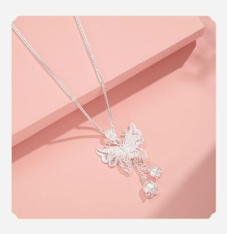 Yijin 999 Pure Silver Necklace Women's Butterfly Necklace Women's Exquisite Sterling Silver Clavicle Chain Light Luxury High-end Chinese Valentine's Day Gift Exquisite Gift Box Pure Silver Filigree Butterfly