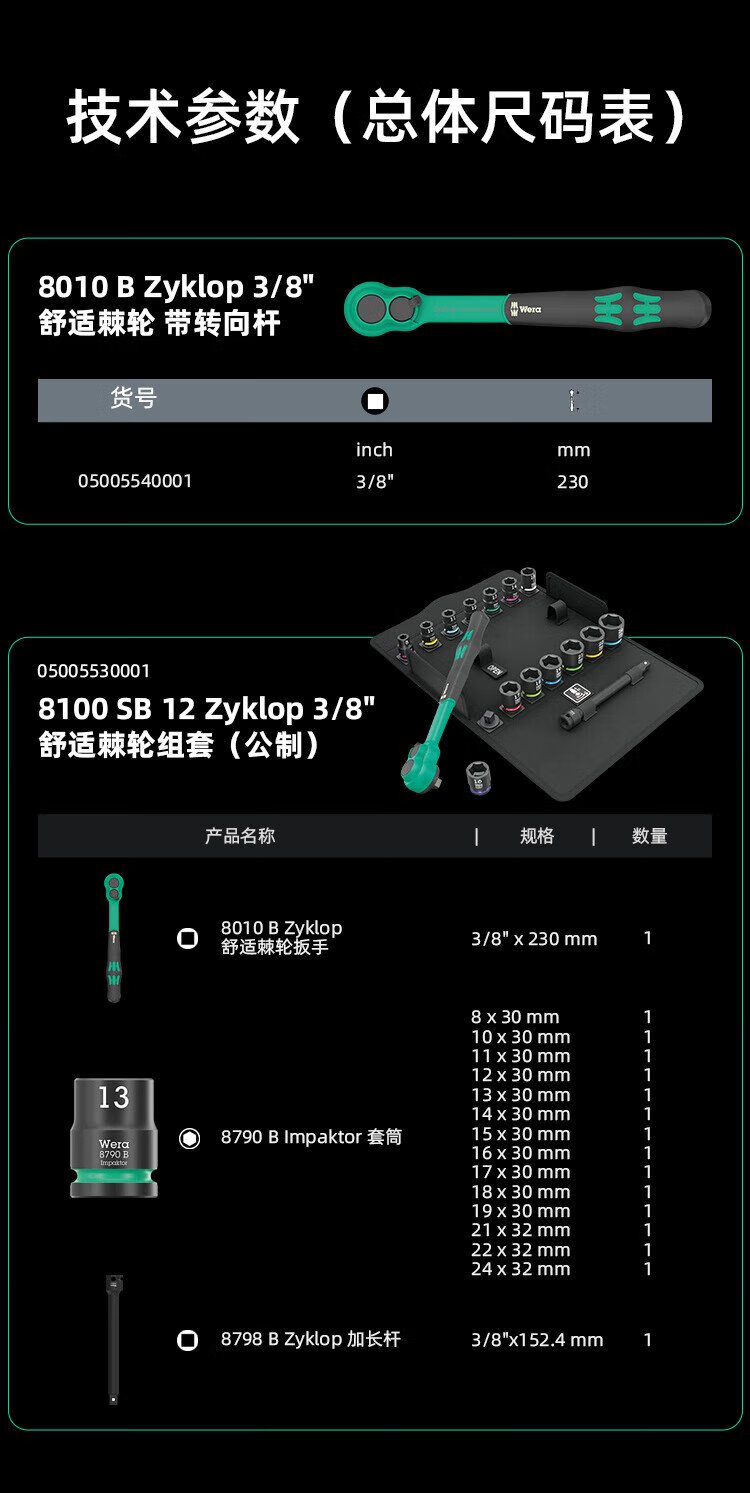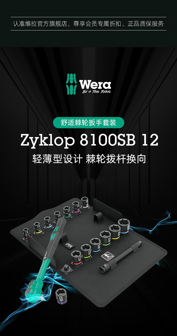 WERA fast two-way ratchet wrench set Zhongfei imported 8010 comfortable handle impact-resistant sleeve German auto mechanic 3/8 Zhongfei 16-piece set 8100SB12