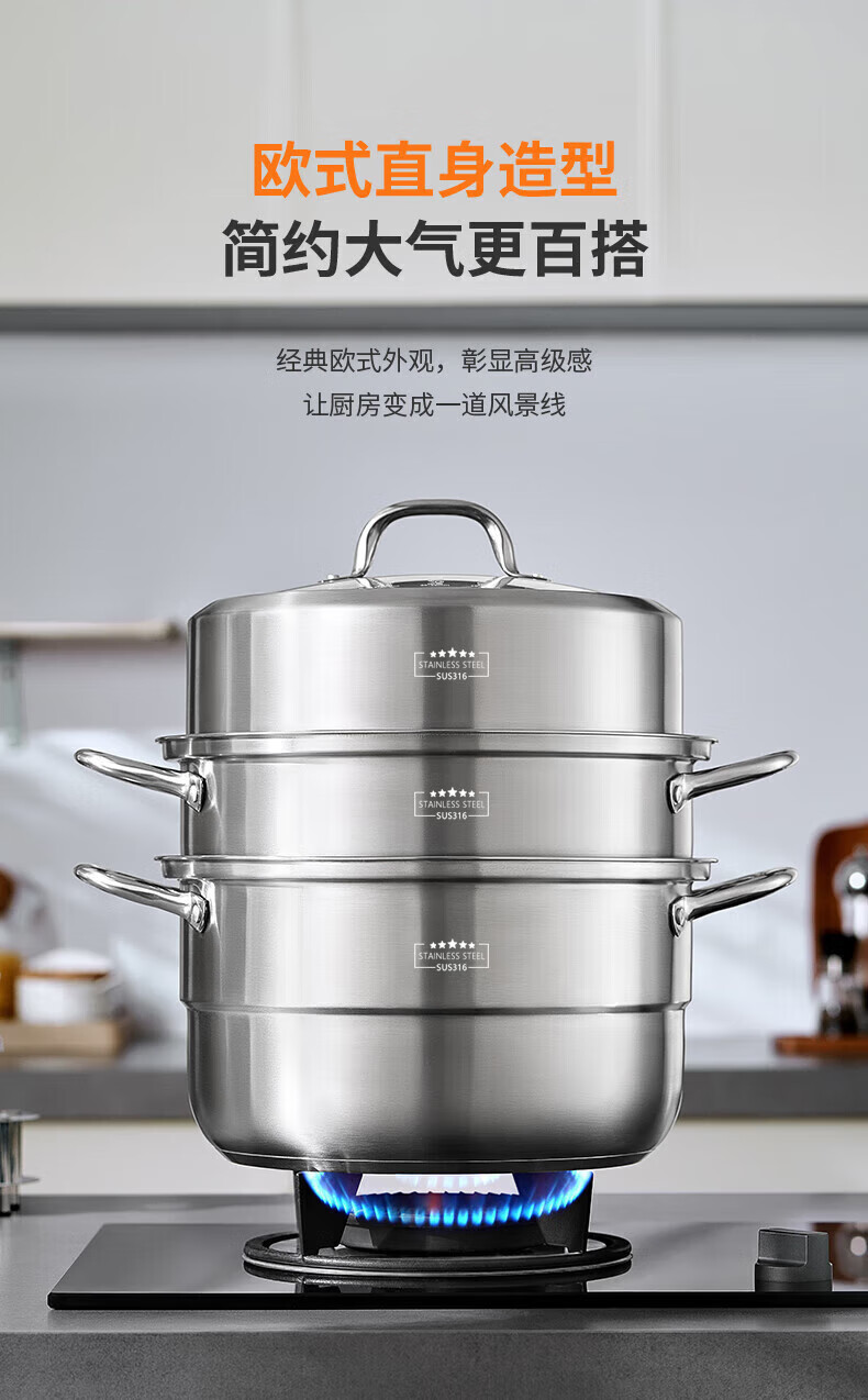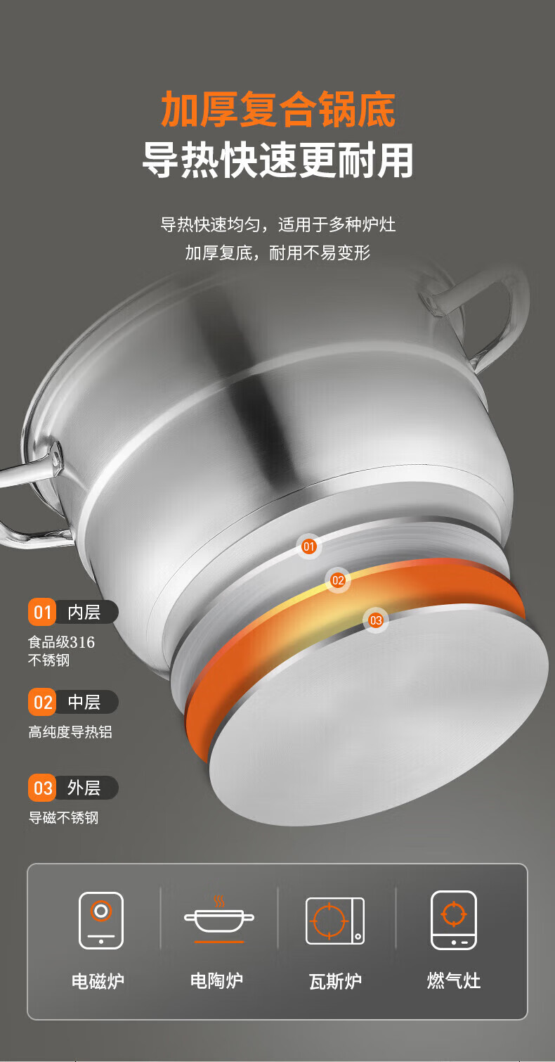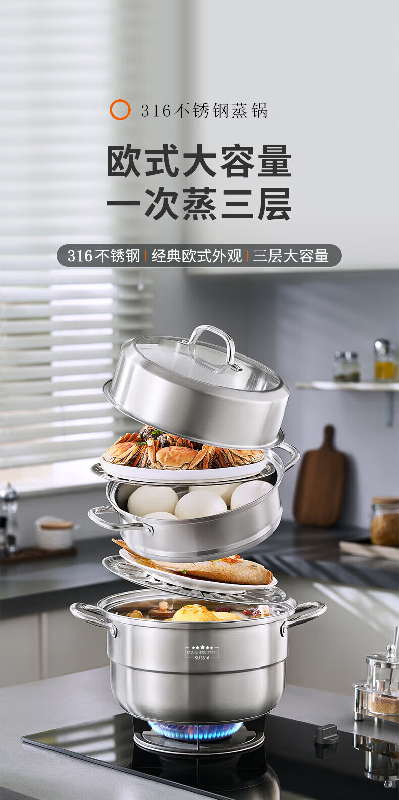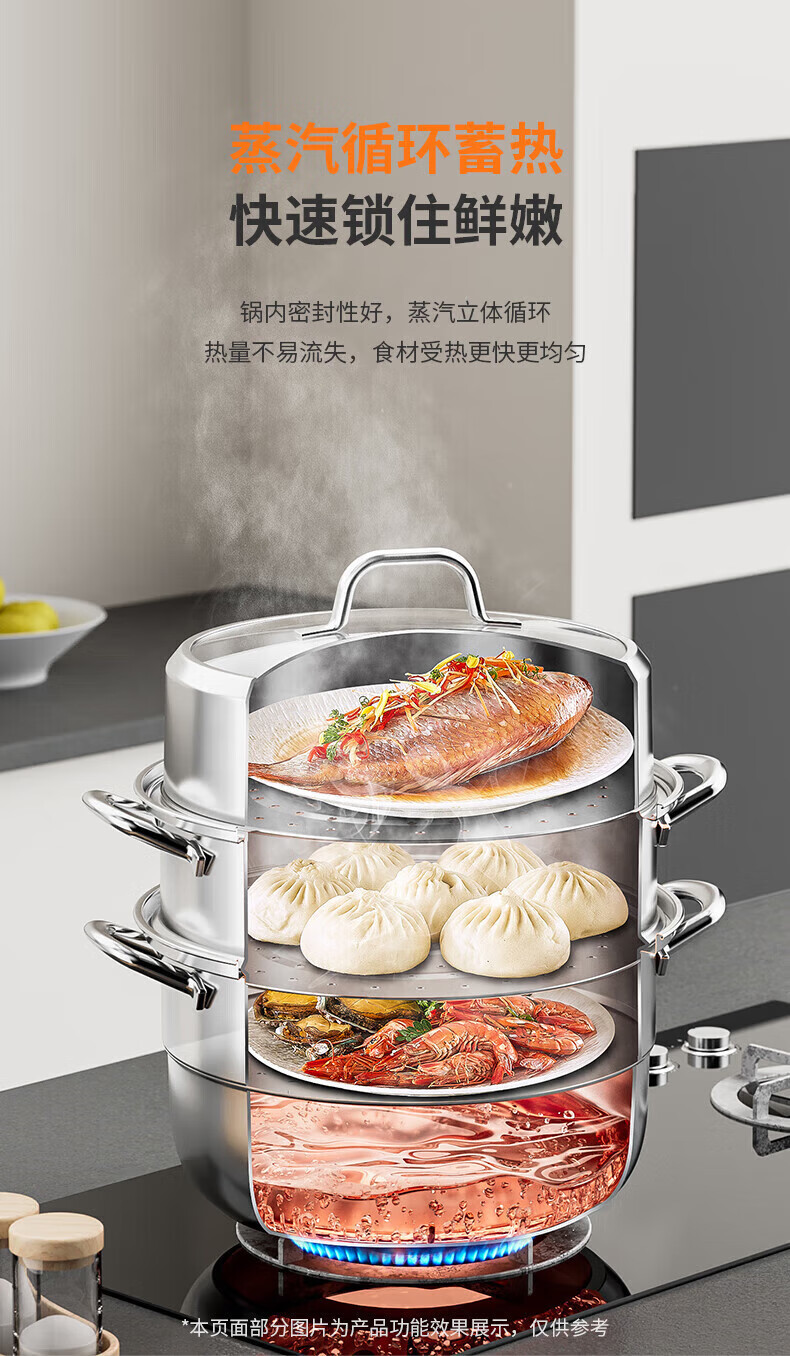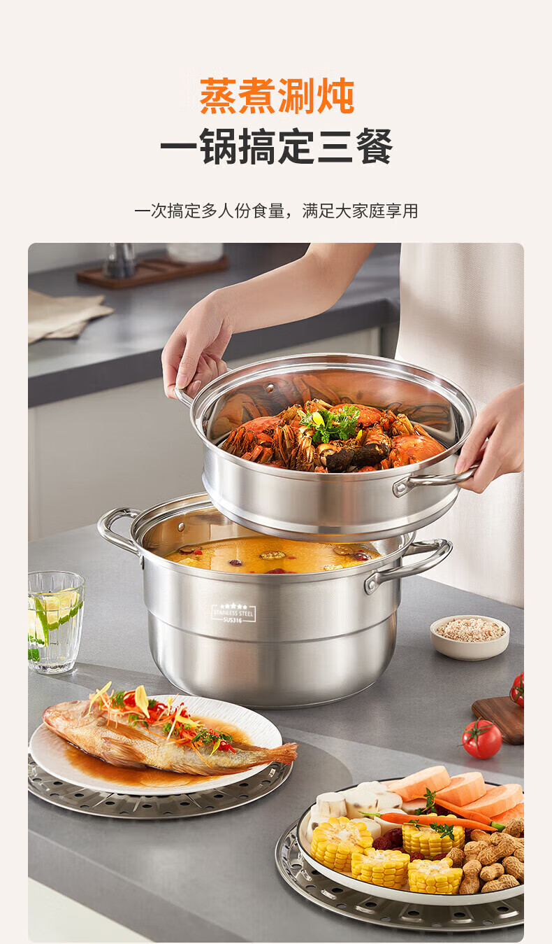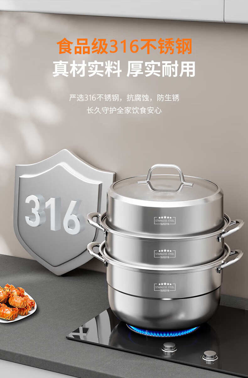 Ten Billion Bear Steamer household food grade 316 stainless steel multi-layer steamer enlarged and thickened induction cooker gas large capacity steamer three-layer steamer 316 food steel double bottom 28cm