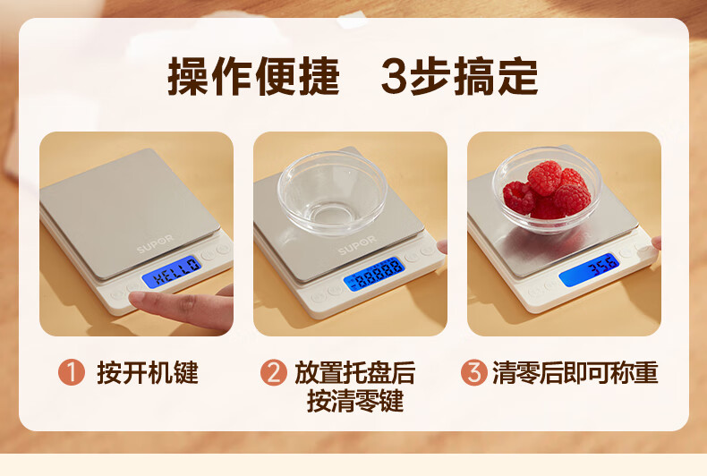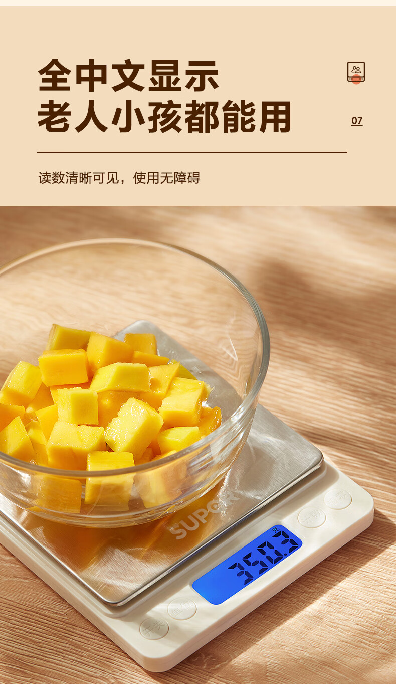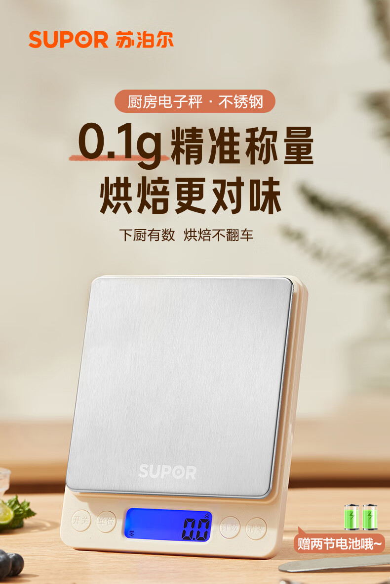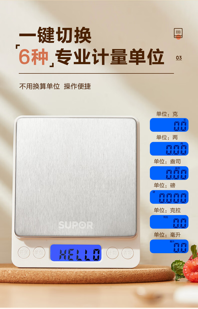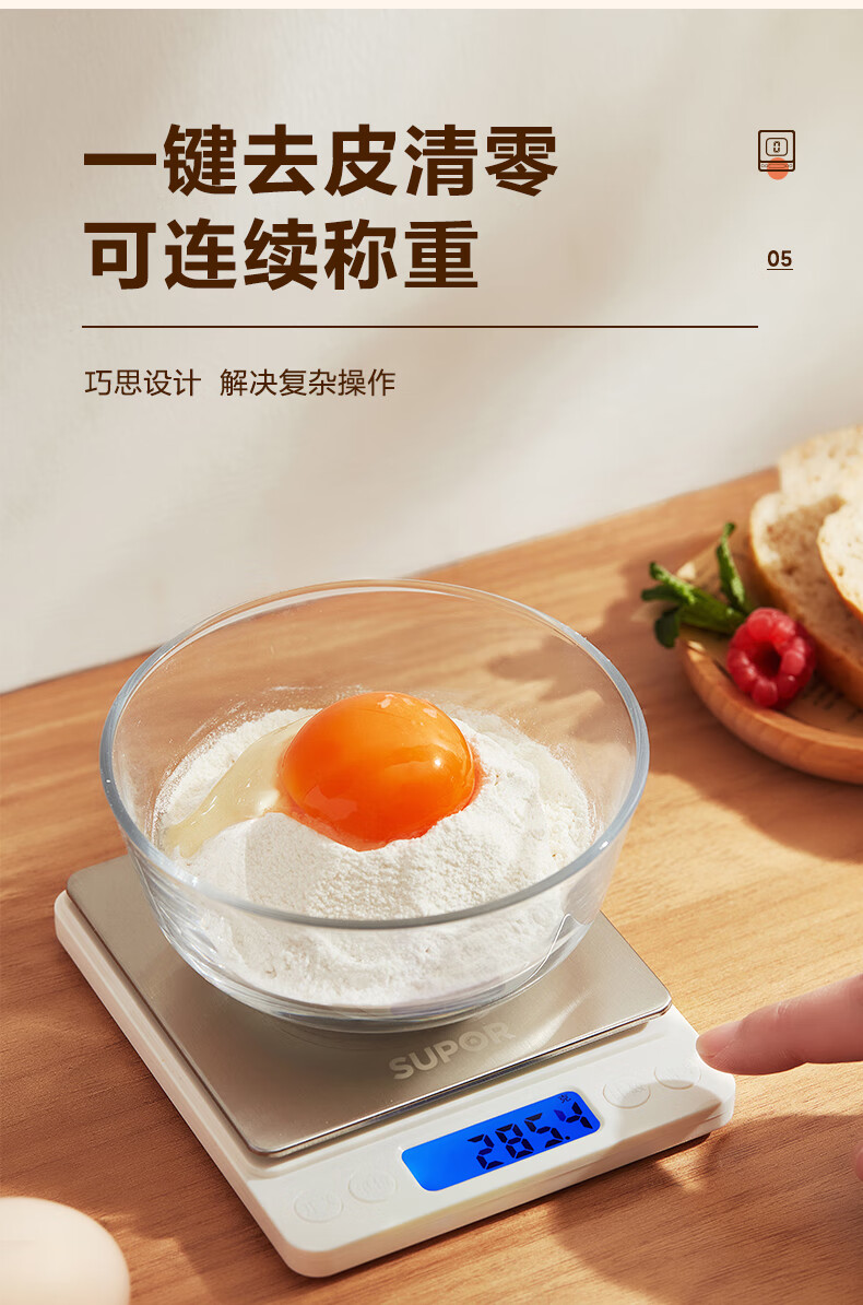 SUPOR (SUPOR) electronic scale household kitchen scale high-precision scale gram scale baked food weighing scale multi-function scale can be peeled with scale pan protective shell 3kg 0.1g