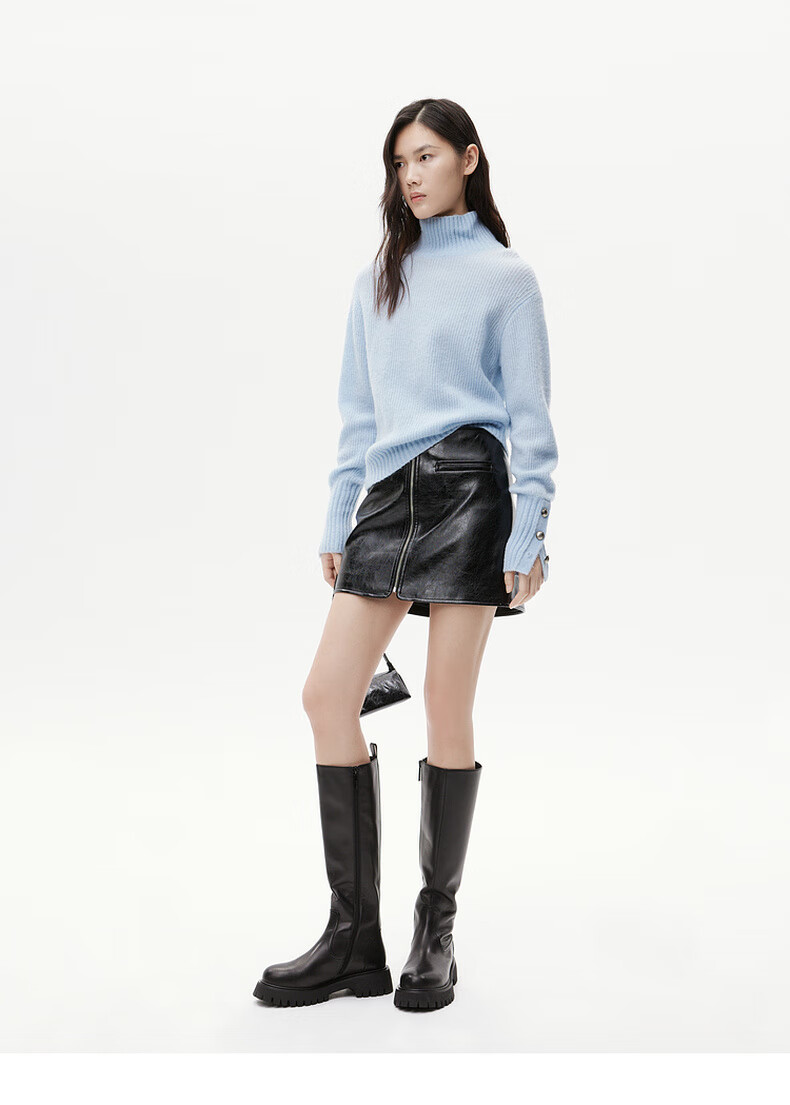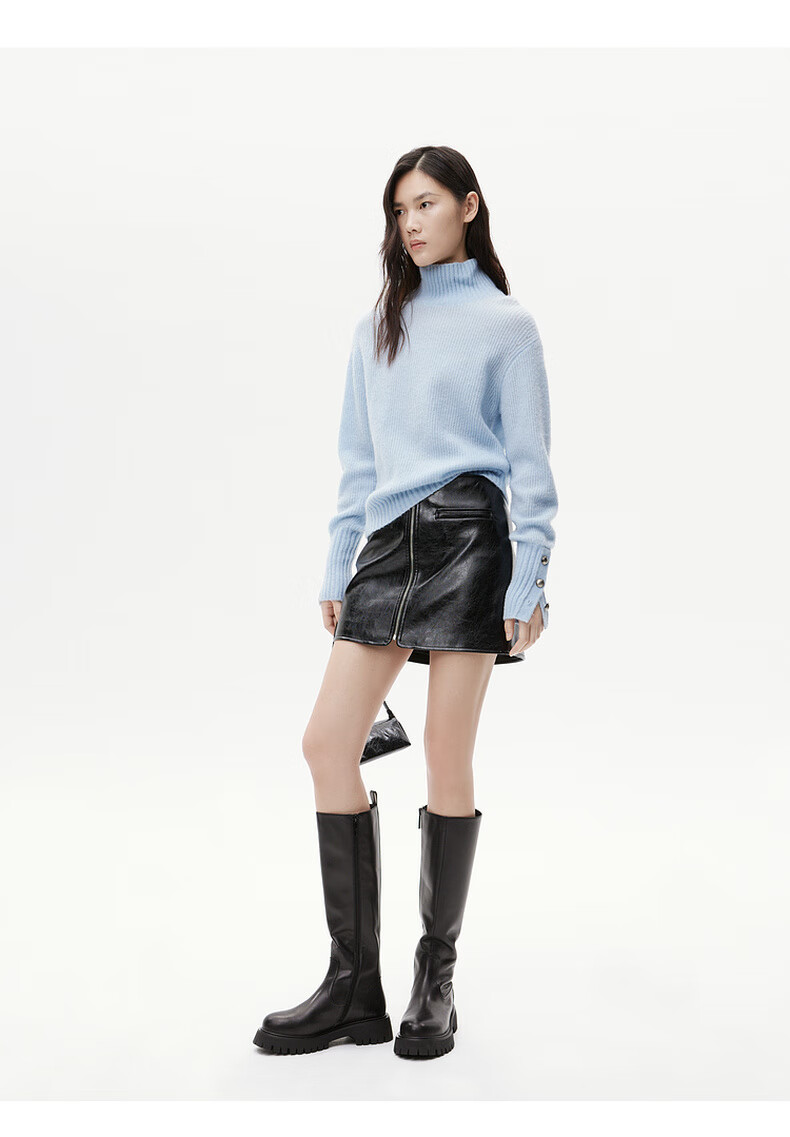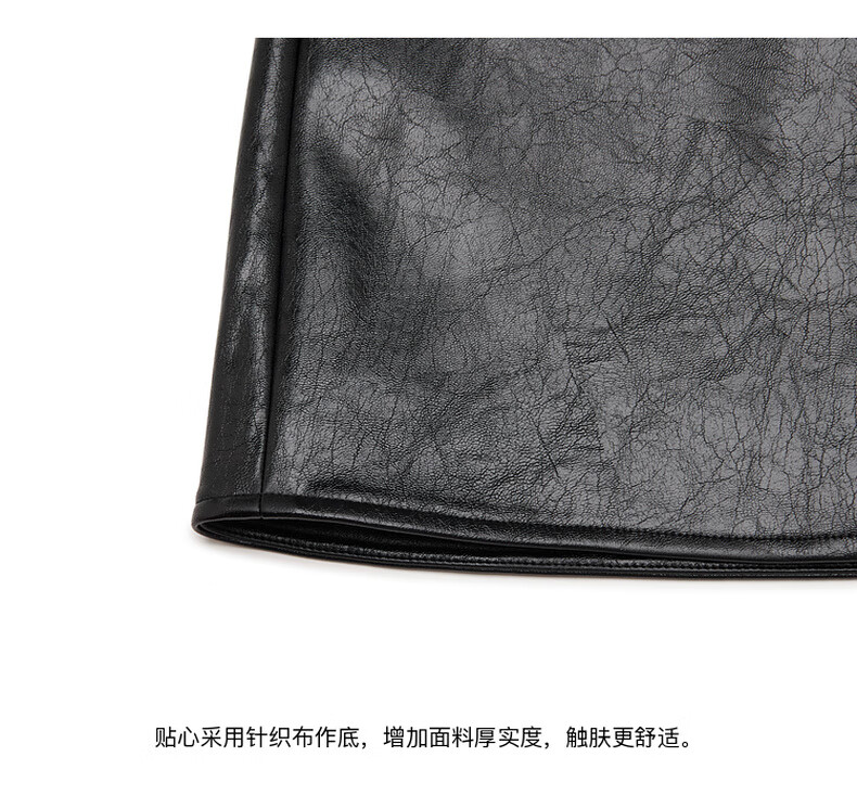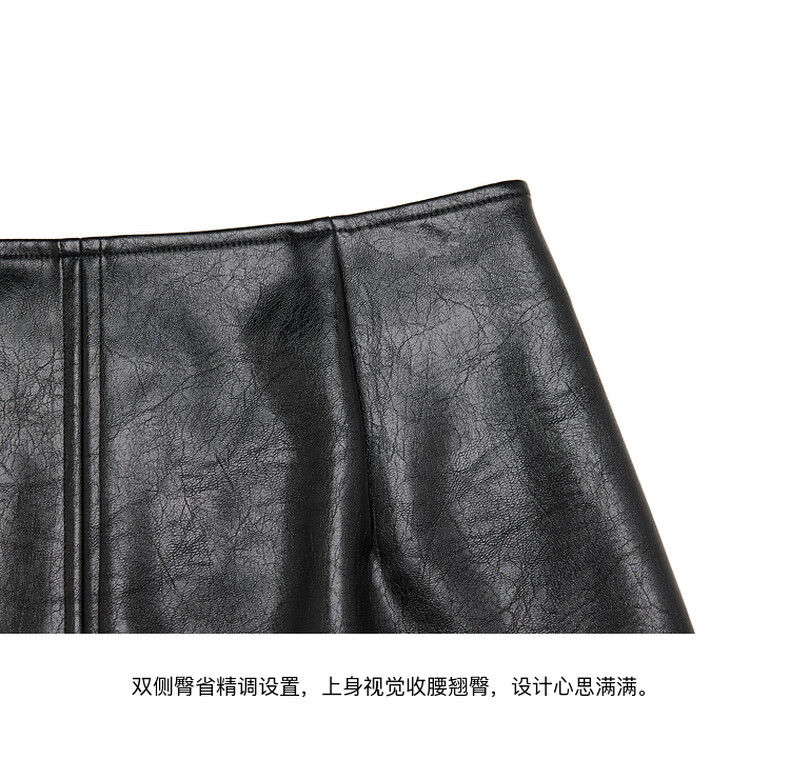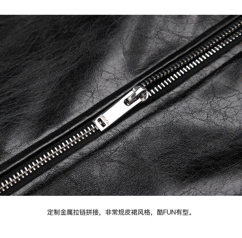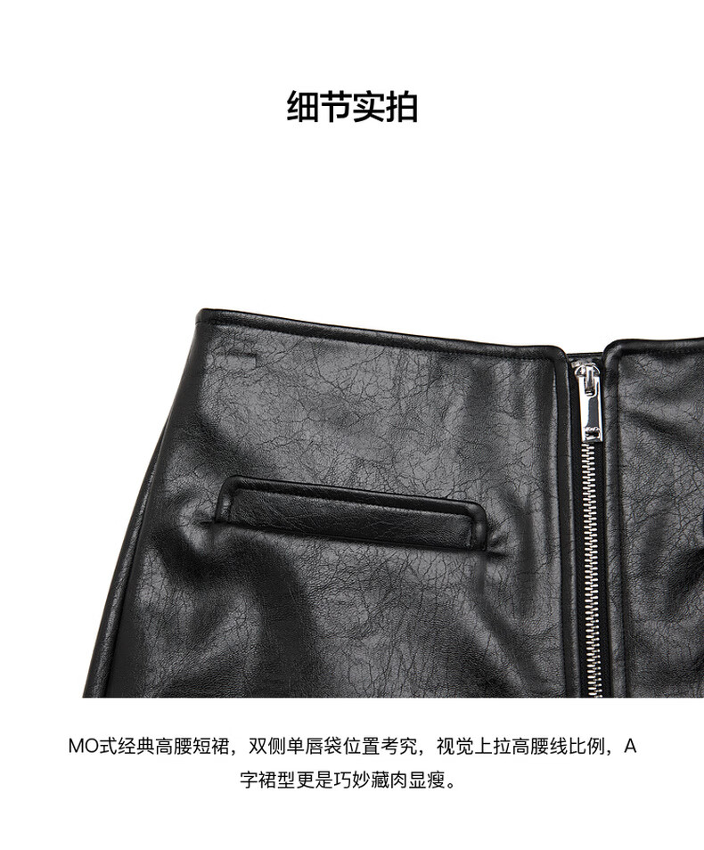 MO&Co. Rock style front zipper high waist knitted fabric base plain leather PU leather A-line short skirt skirt leather skirt Moanke black-2nd batch M 165