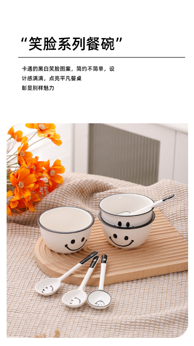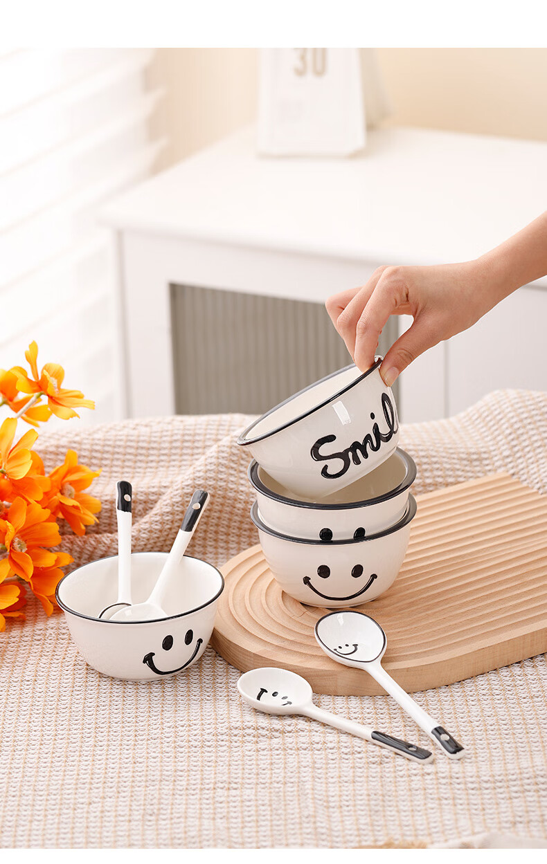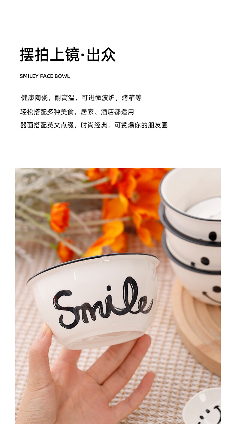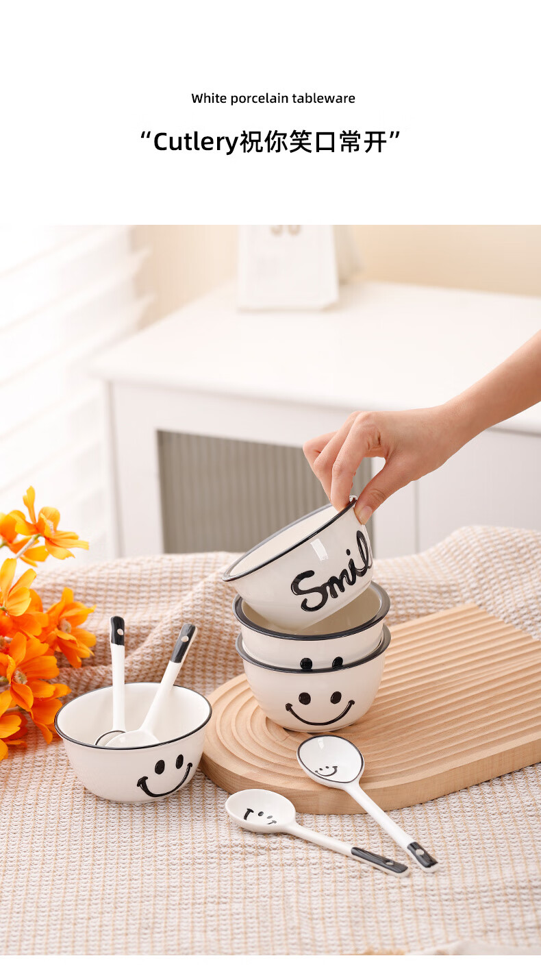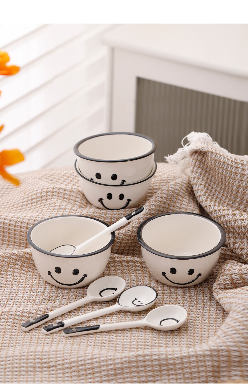 Super popular 4.75-inch rice bowl, large-capacity food supplement bowl, ceramic bowl, smiley face bowl, 2 bowls, 2 scoops